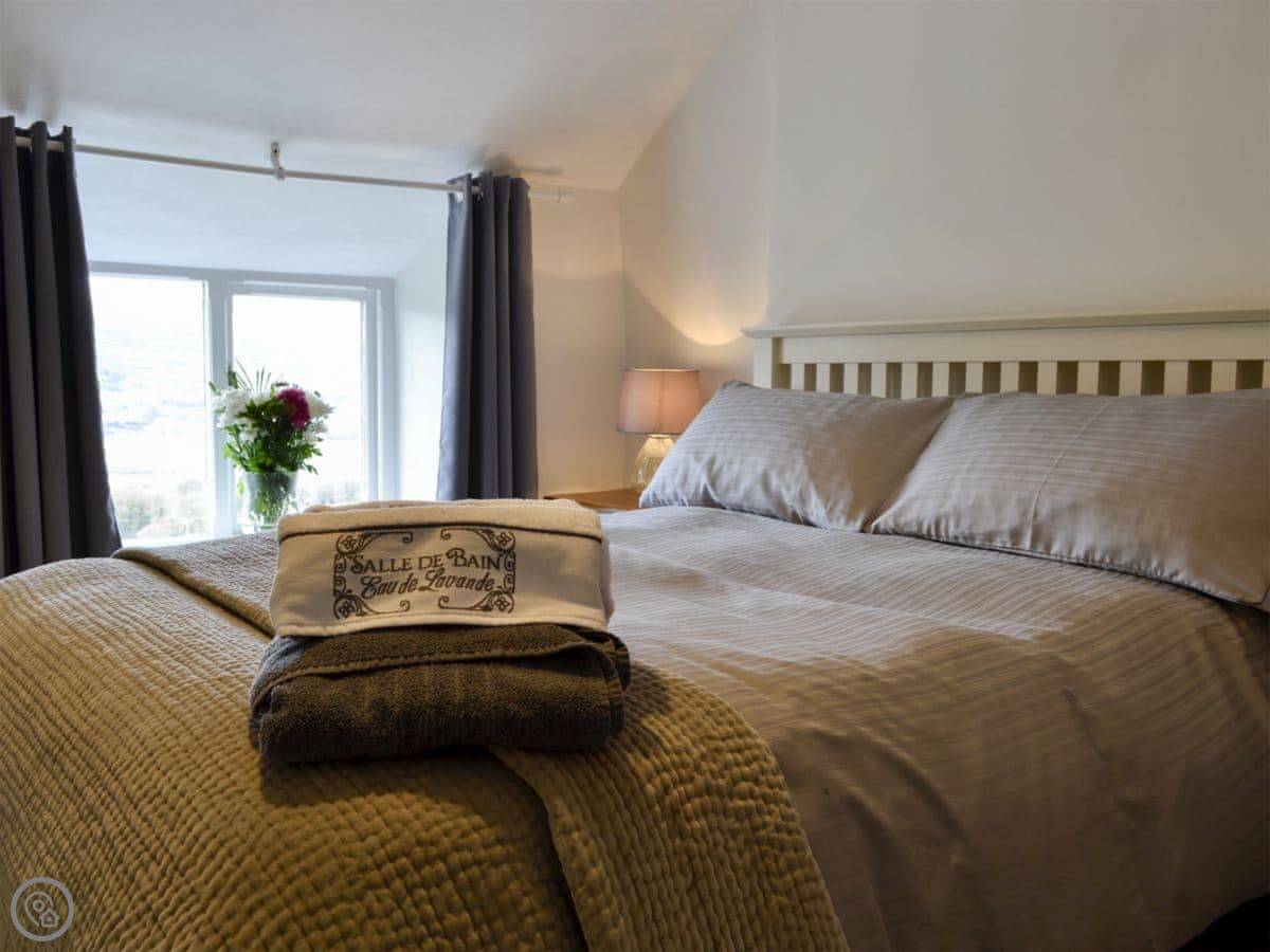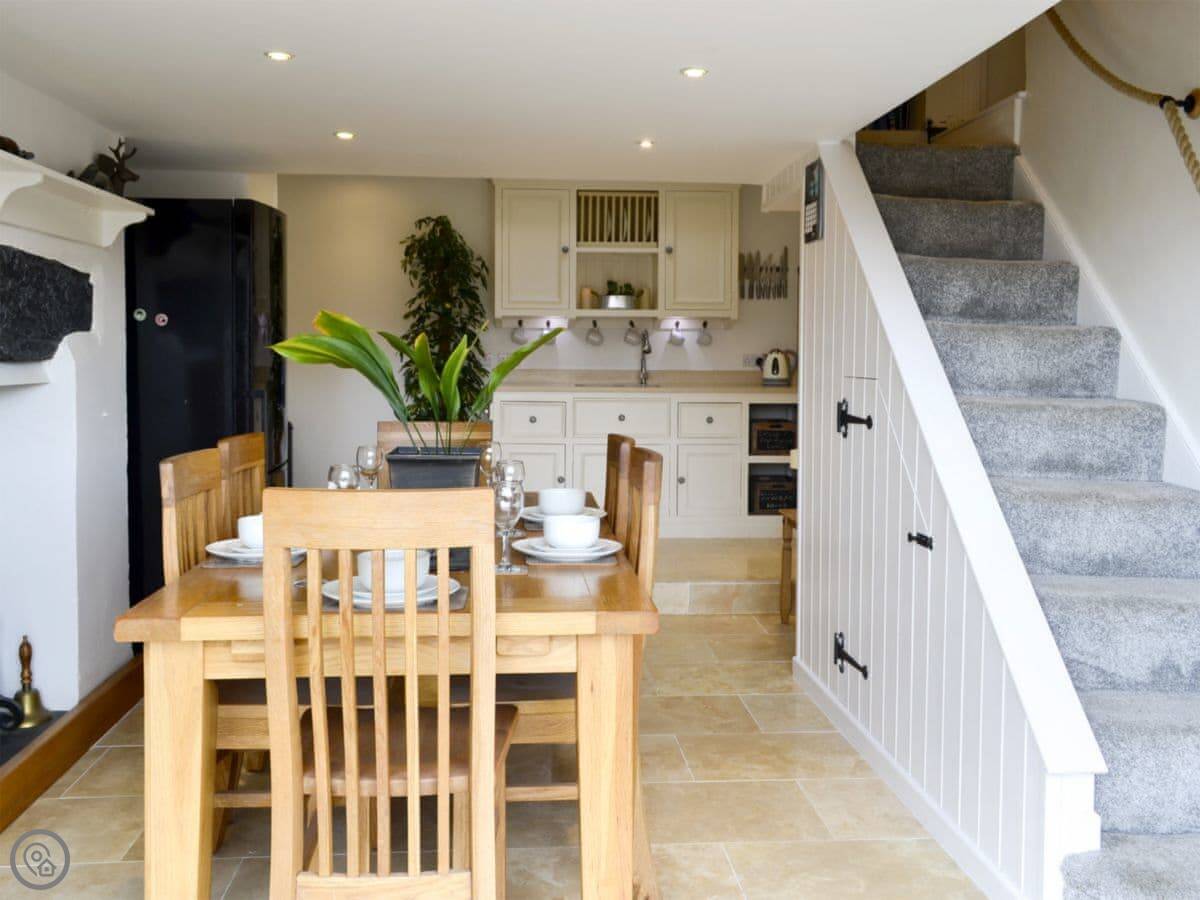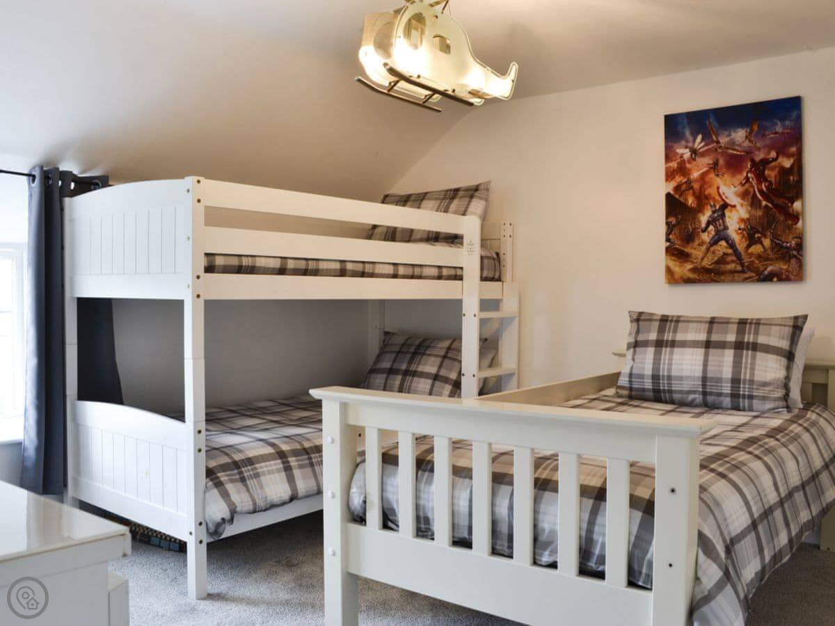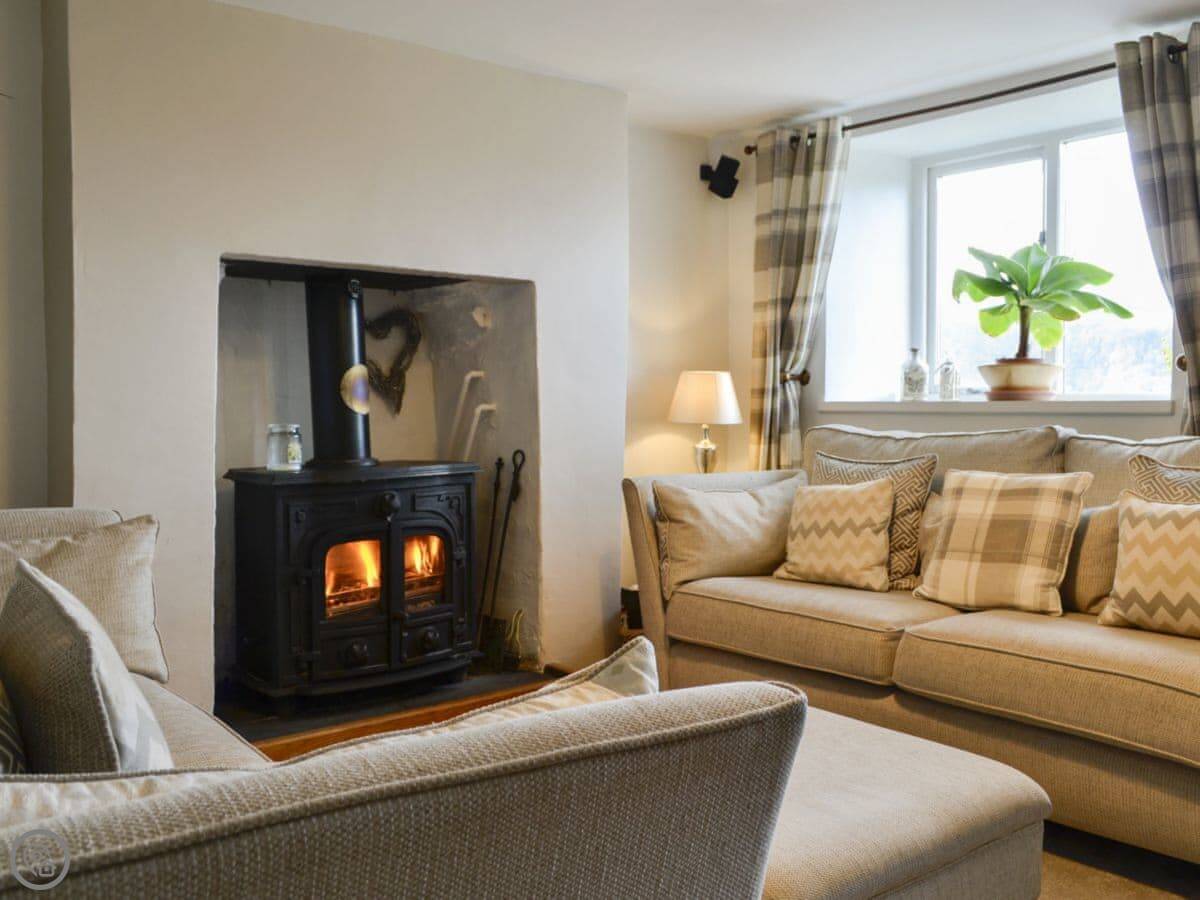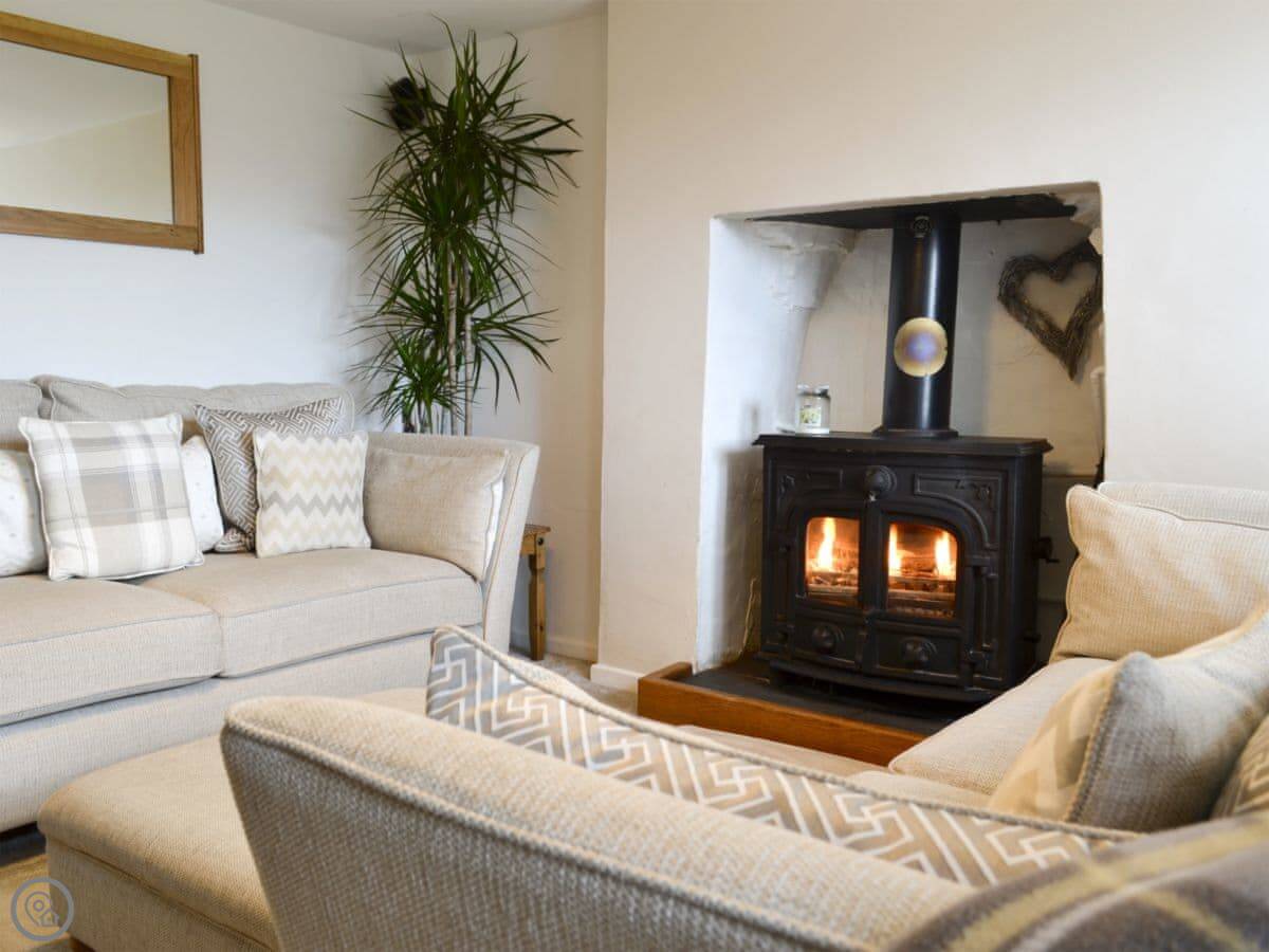 It sleeps six, three bedrooms upstairs. Two bathrooms, one up, one down. It's a 5 Star rating, which means everything is in good working order. There are two living rooms, both with wood burners. The stairs are spiral and a bit steep.