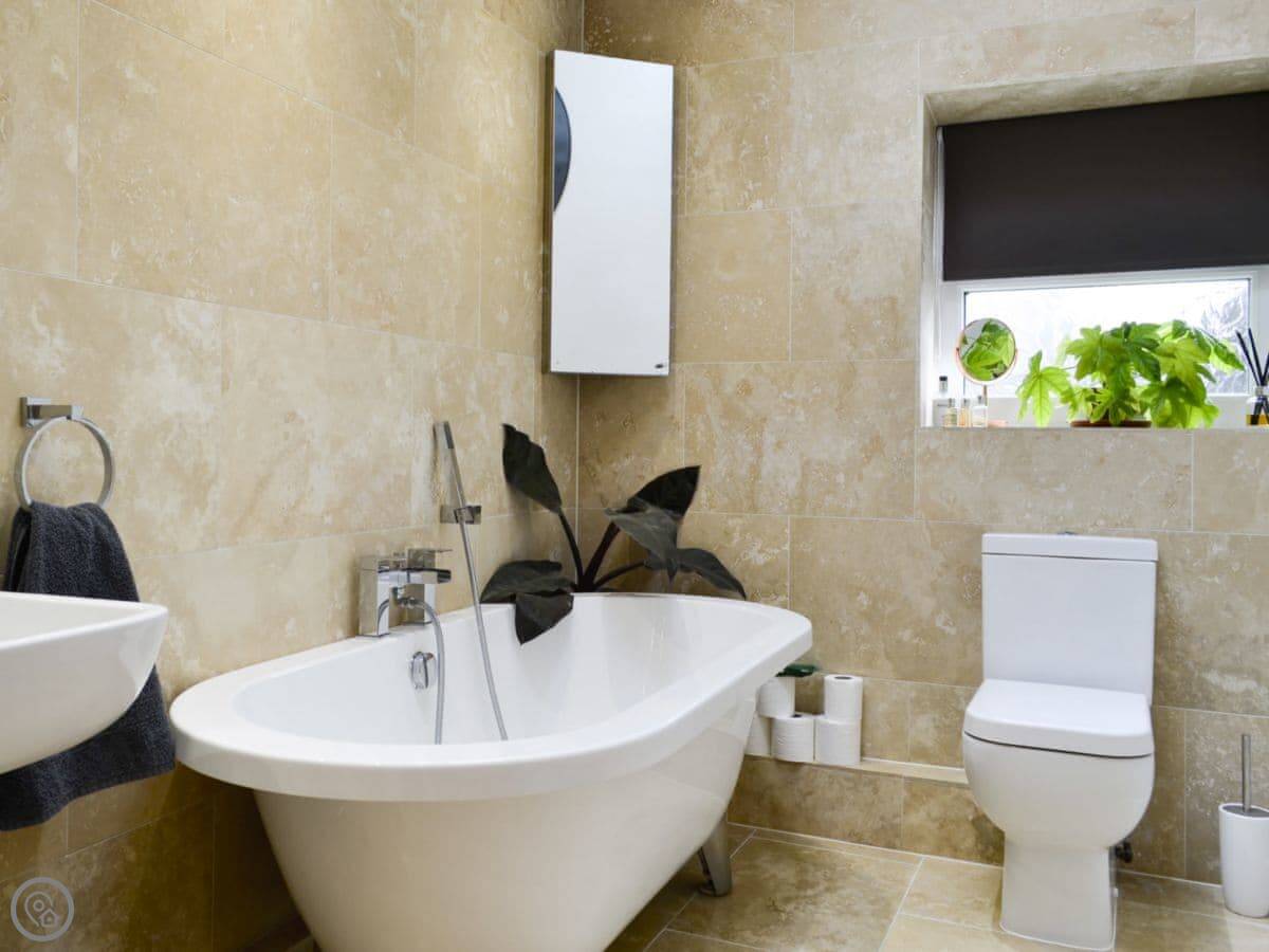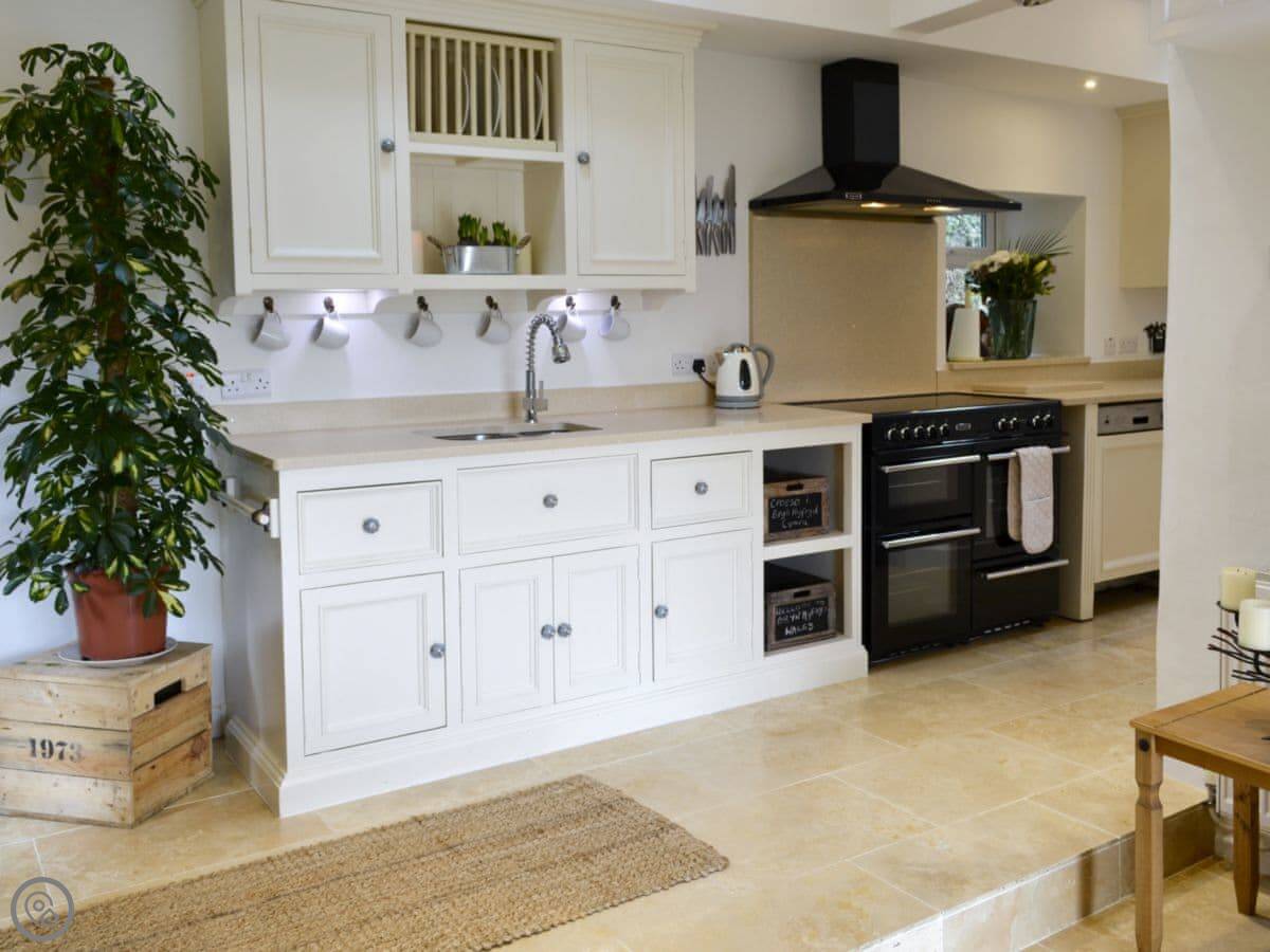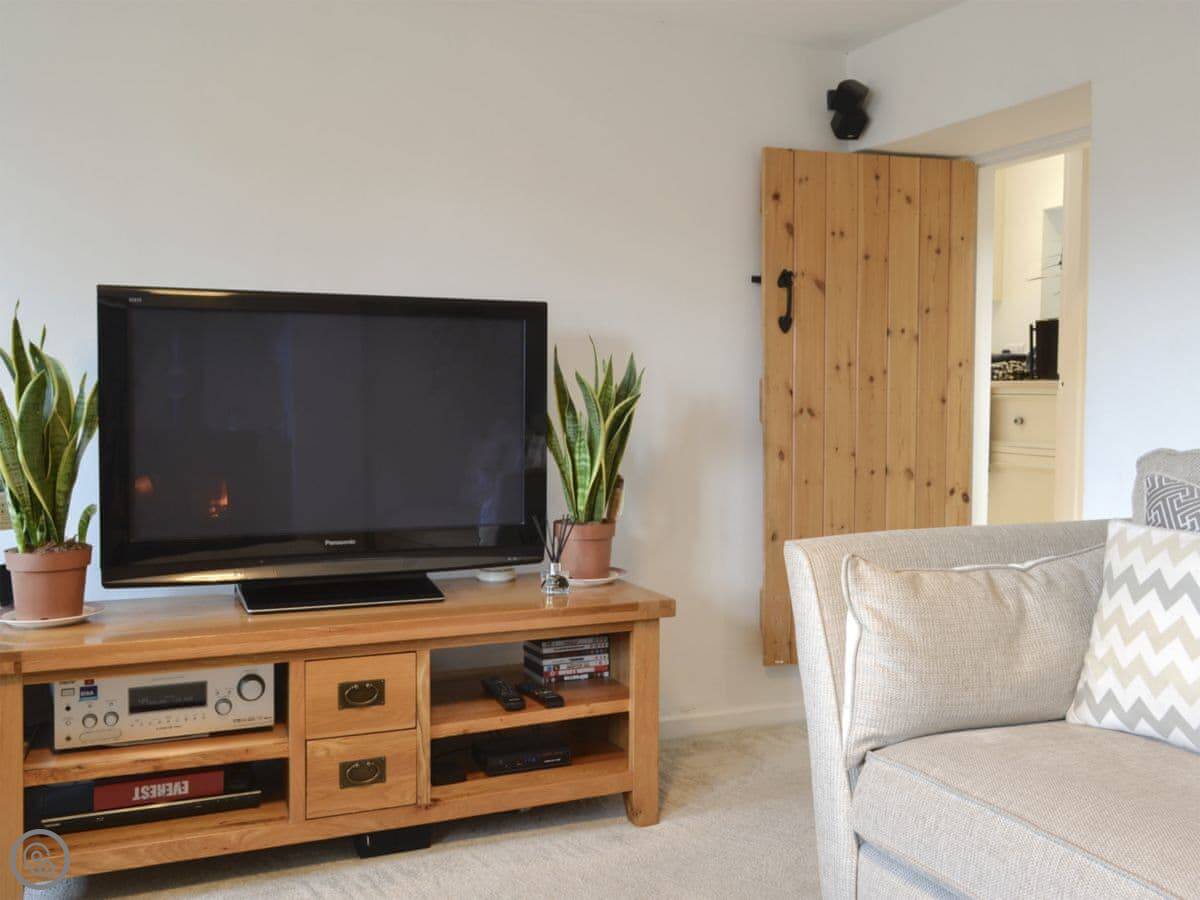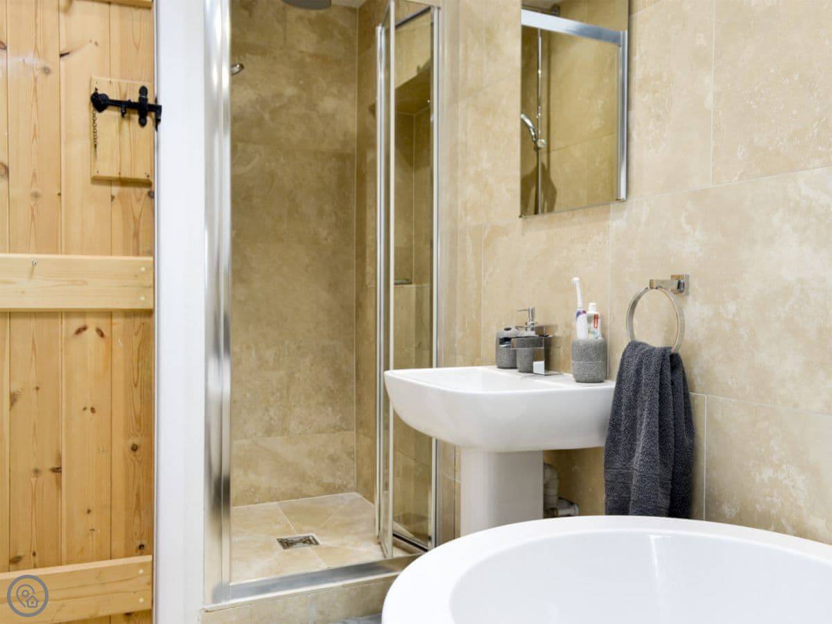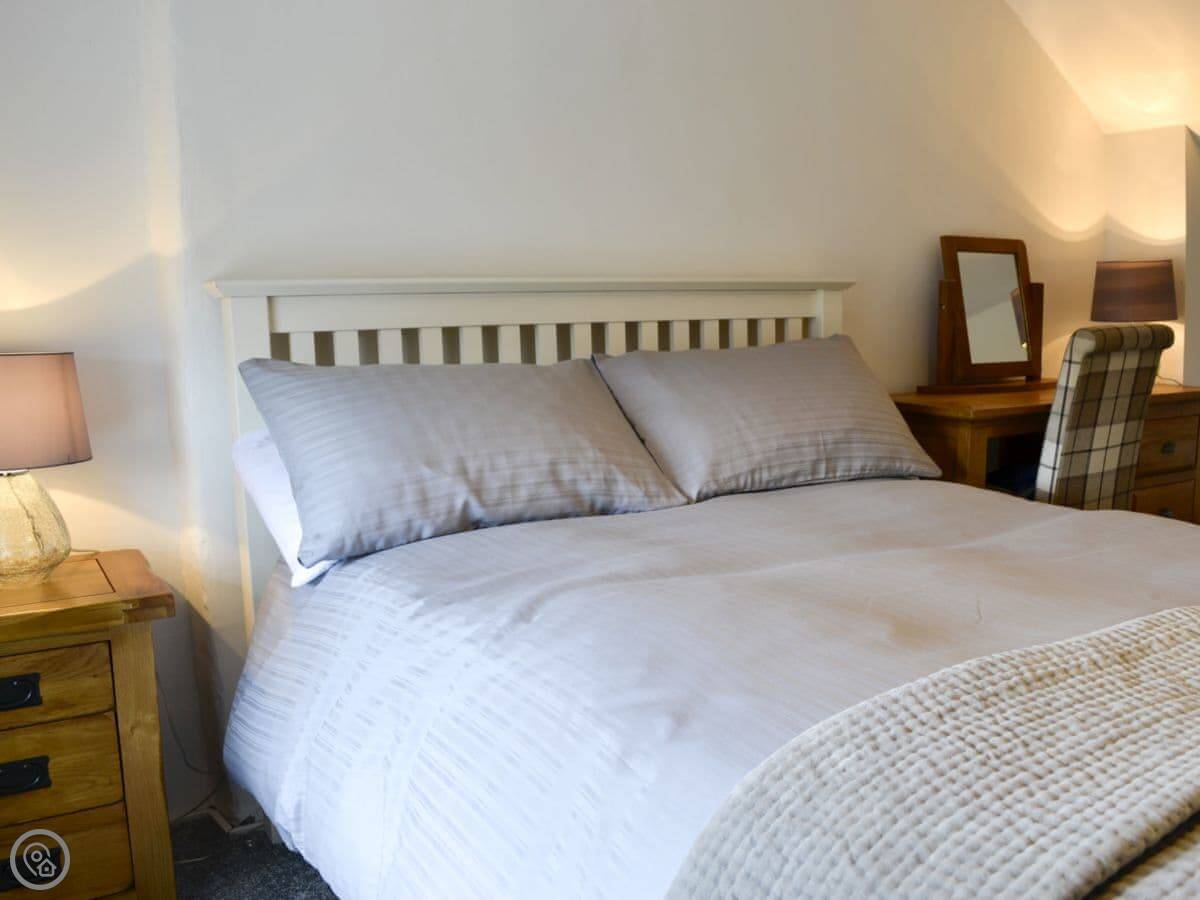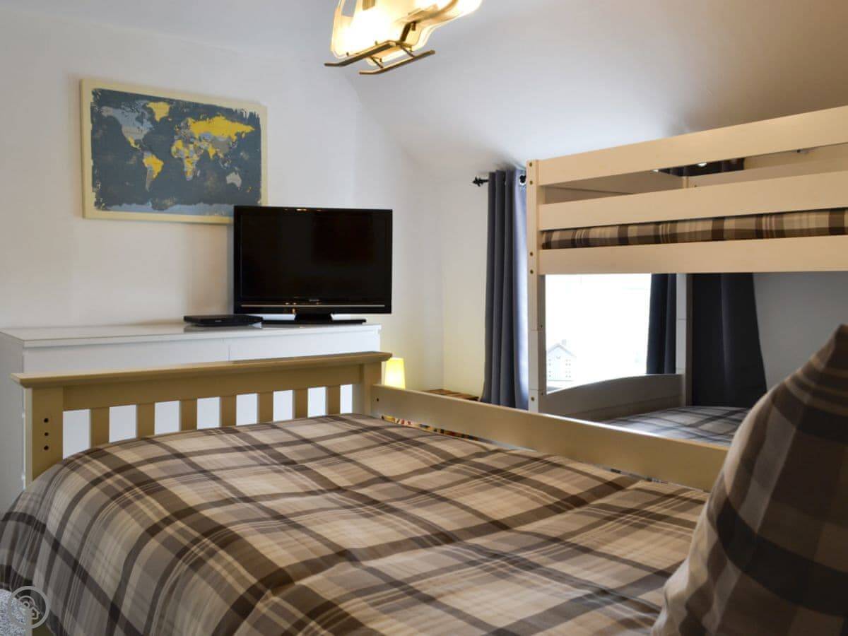 It sleeps six, three bedrooms upstairs. Two bathrooms, one up, one down. It's a 5 Star rating, which means everything is in good working order. There are two living rooms, both with wood burners. The stairs are spiral and a bit steep.