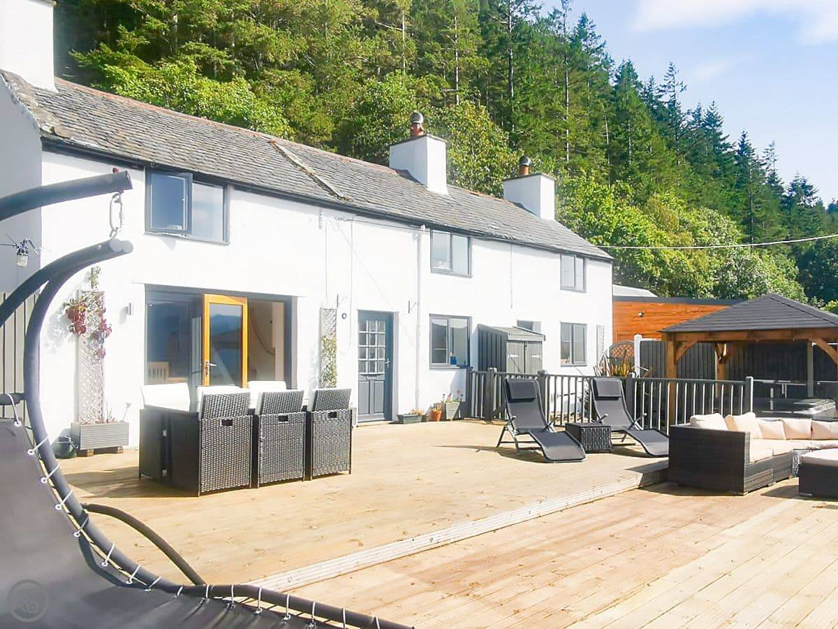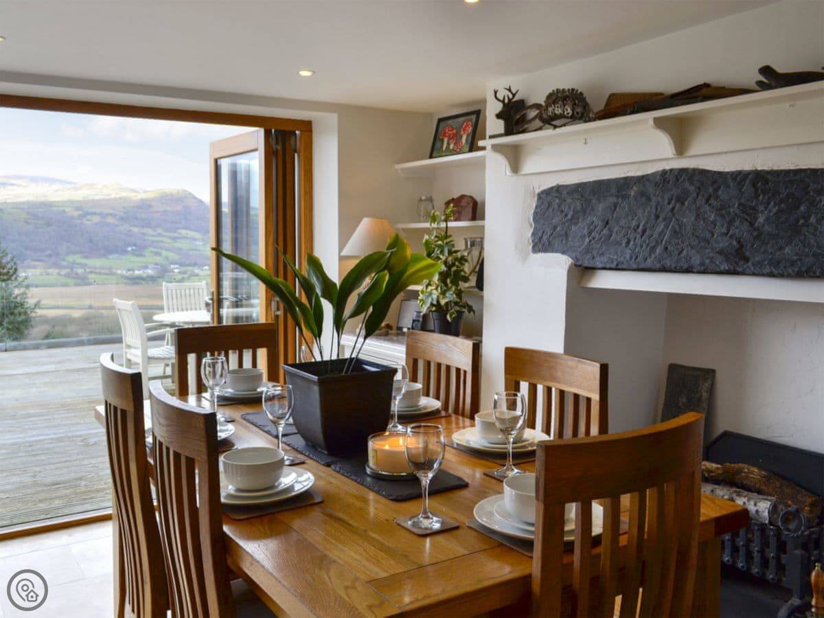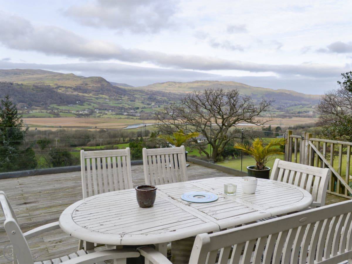 Bryn Hyfryd is a detached house up a rough farm track just outside Llanrwst. You get the whole place to yourselves. The main thing is the view. It looks straight out over the Conwy Valley towards Snowdonia. You can see Surf Snowdonia from the deck.