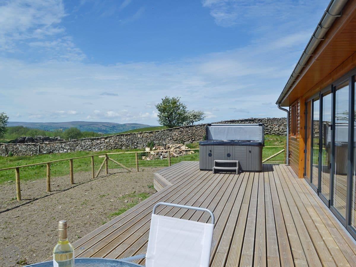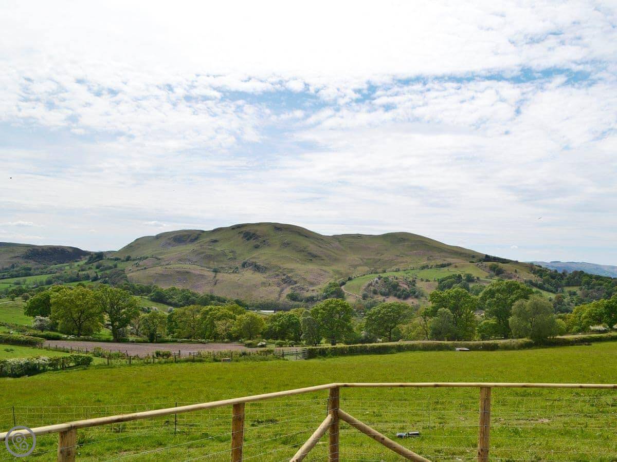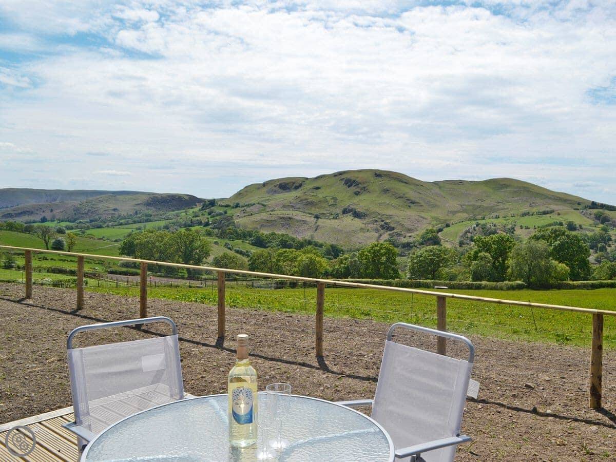 Bluebell Lodge is on our farm near Crossway. It's a single-storey lodge, so everything's on one level. You get that to yourselves, it's detached. The view from the deck is over our fields and the hills. It's a working farm, so you'll see sheep and cattle about.