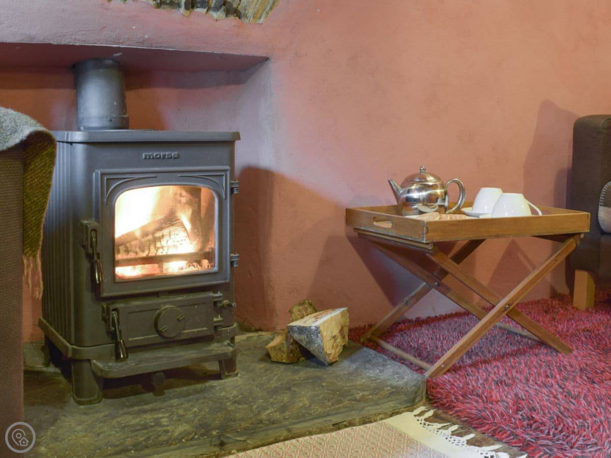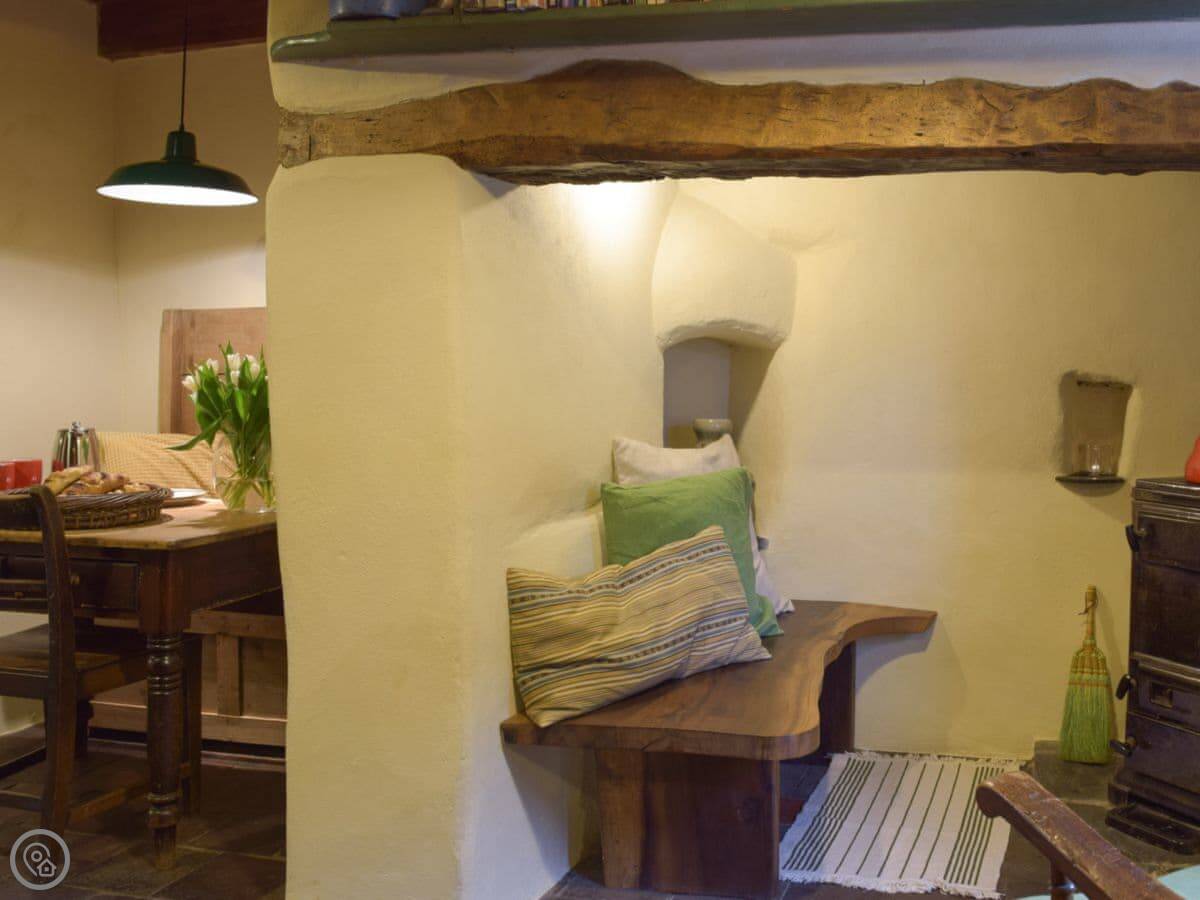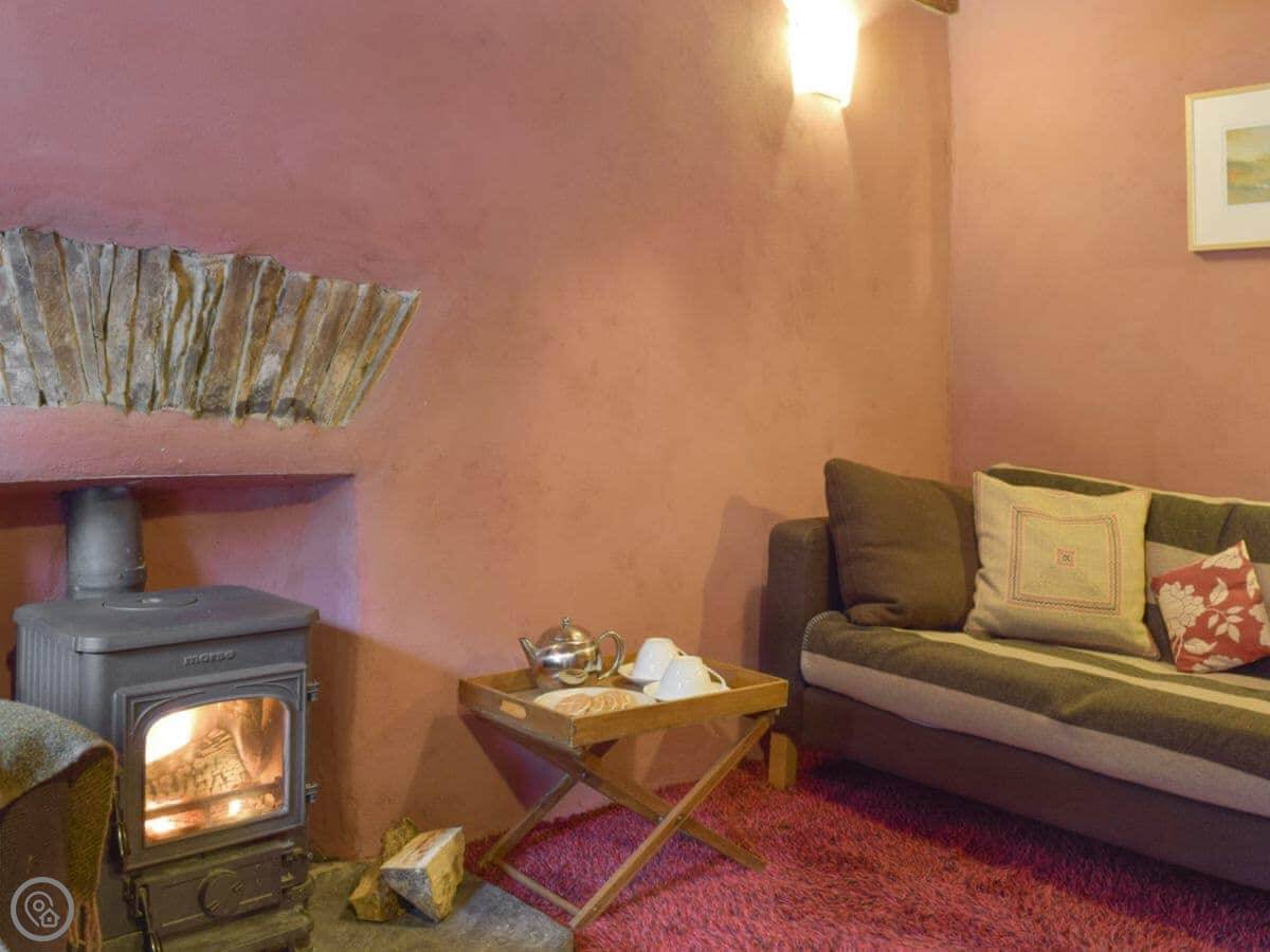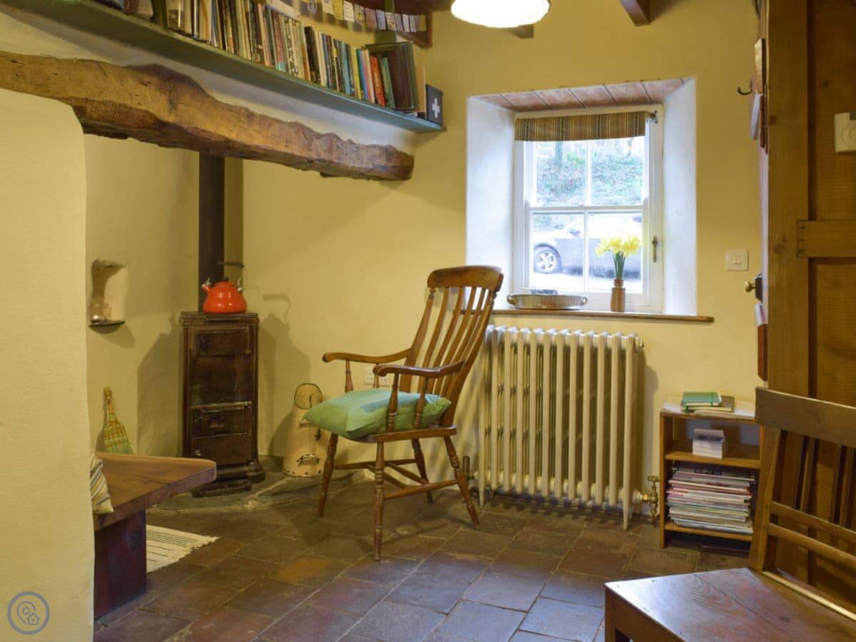 The stairs are quite steep, and the ceilings are low in places. The floors downstairs are the original quarry tiles, so they're hard and a bit uneven. There are two wood burners, one in the main living room and one in the smaller sitting room.