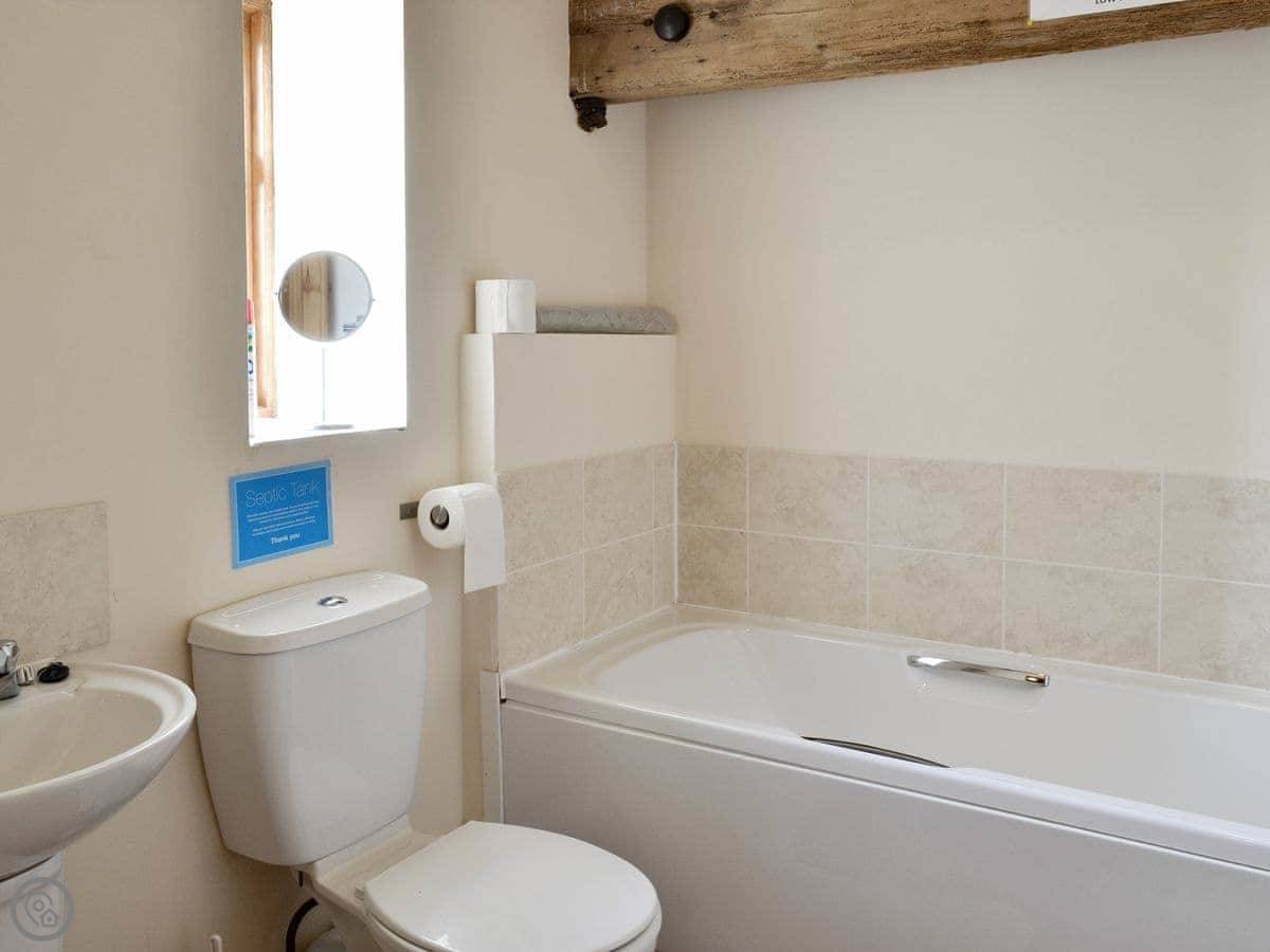 It sleeps six, with three bedrooms and two bathrooms, which helps. It's got a 4 Star rating. The place used to be a farm building, so there are some old beams and stone walls. There's underfloor heating on the ground floor, so it stays warm.