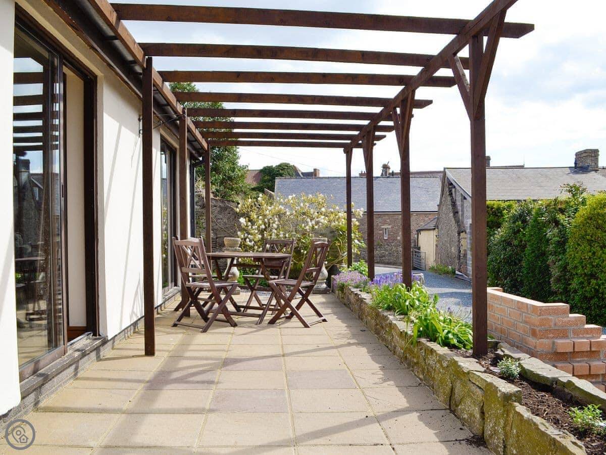 The garden is enclosed. There's a patio area and a barbecue. At the bottom of the garden is a sauna cabin. You can see the Black Mountains from there, and on a clear day you can see Pen y Fan in the distance.