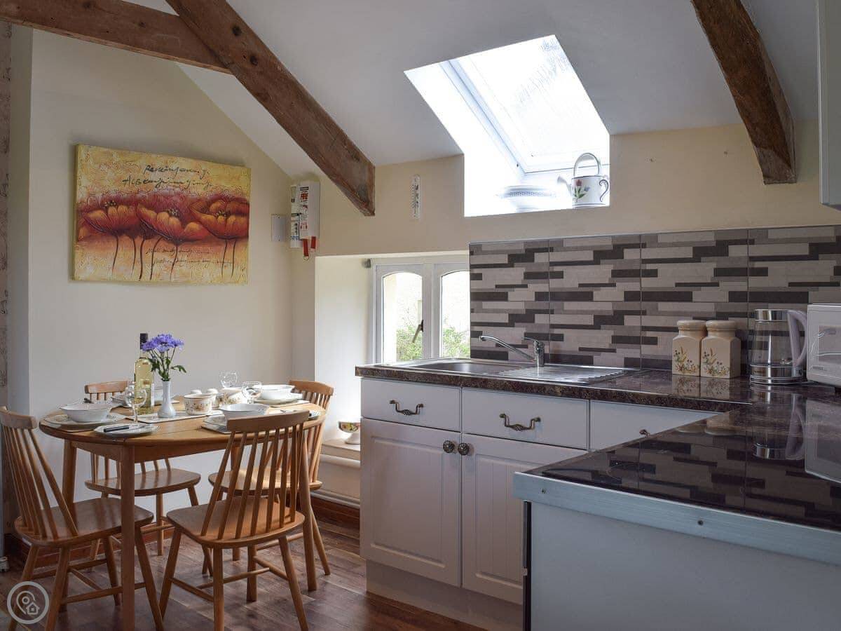 It sleeps four in two bedrooms, with one bathroom. It has a 3 Star rating. It's clean and comfortable. The living space is open plan with beamed ceilings. Because it's a converted barn, the ceilings are vaulted upstairs but the doorways are a bit lower than modern ones, so mind your head.