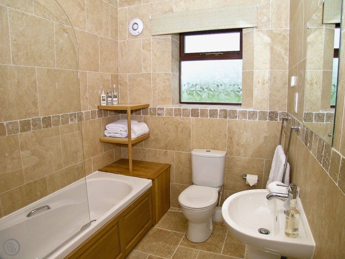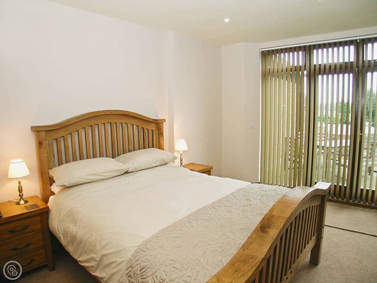 It sleeps four, in two bedrooms. Each bedroom has its own bathroom, which is handy. The rating is 5 Star, so it's well-finished. There's underfloor heating and a wood burner for cooler nights.