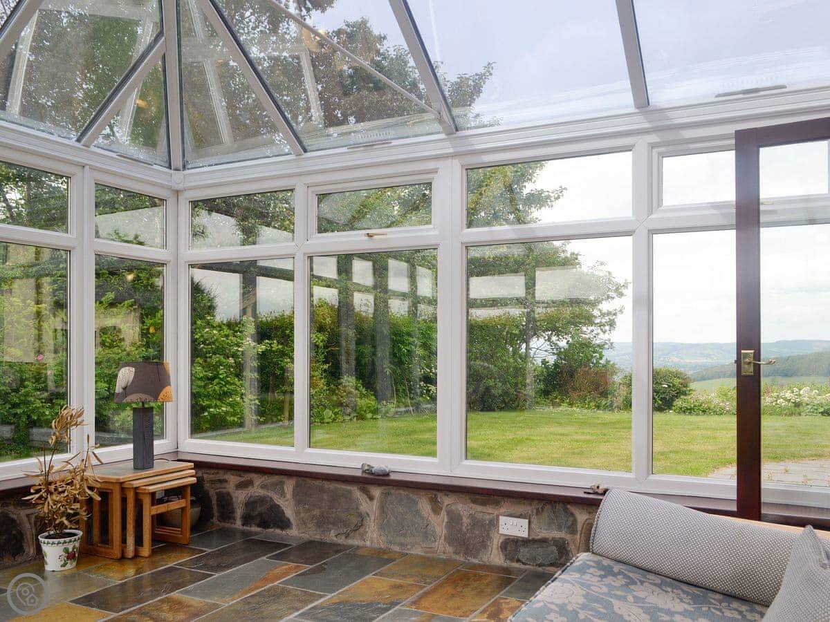 The kitchen is oak, handmade. Big table that seats everyone. The sitting room has a log burner and a good view down the Severn valley. The conservatory is bright, looks out over the garden.