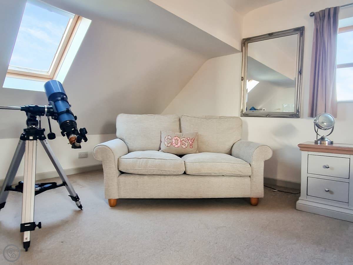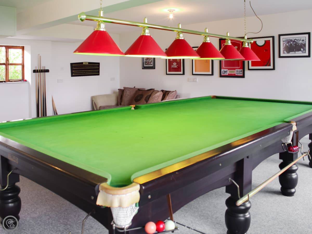 The games room is in the old garage. It's got a full-size snooker table, darts, and table football. There's a sofa area up there too.