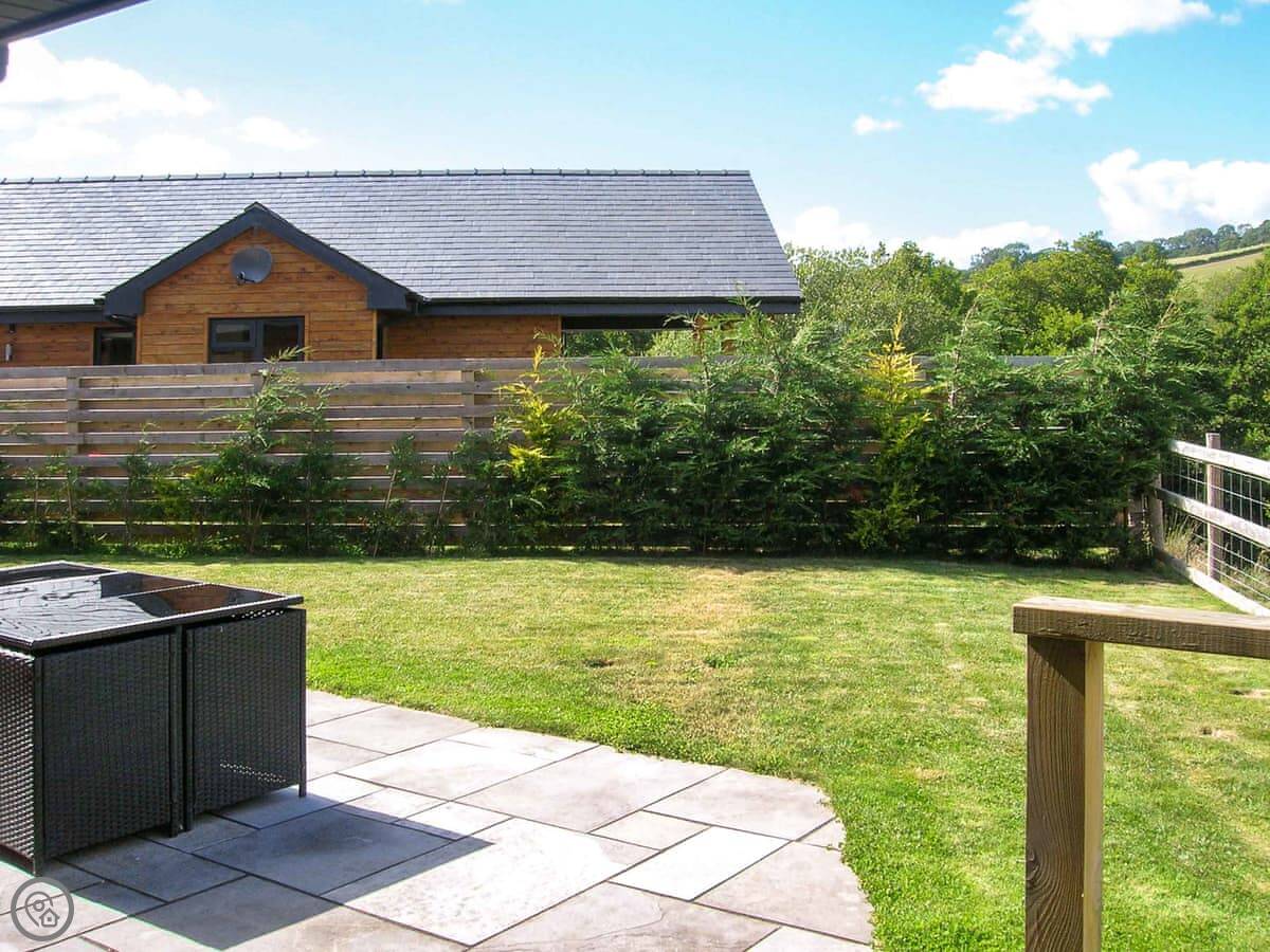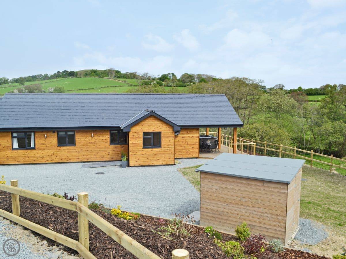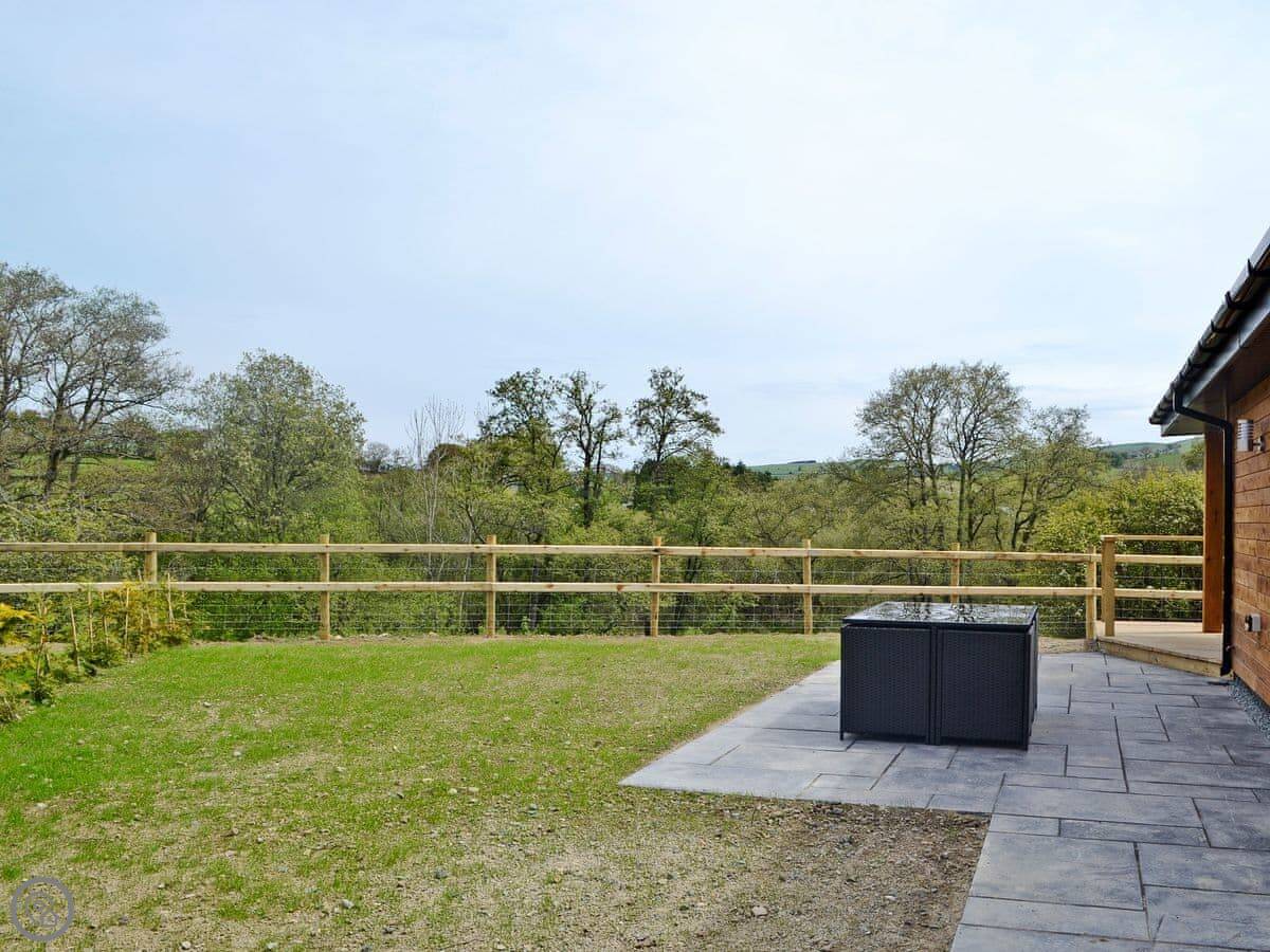 Woodland Lodge is in Hundred House, out near Builth Wells. It's a detached lodge. It's on the farm here, so you'll see sheep, maybe some cattle. The view from the front is just fields and trees.