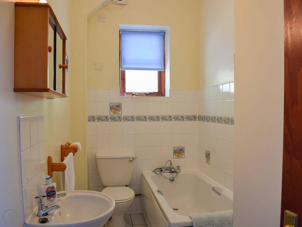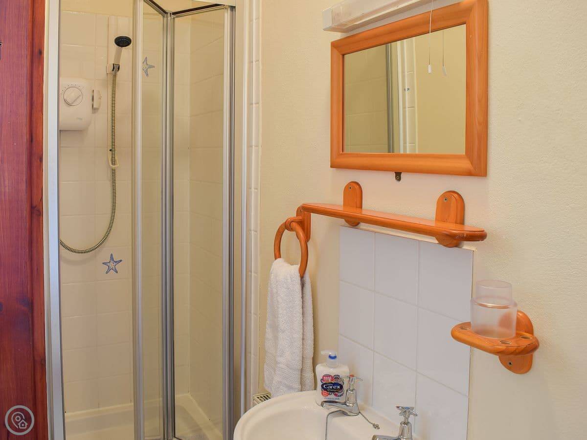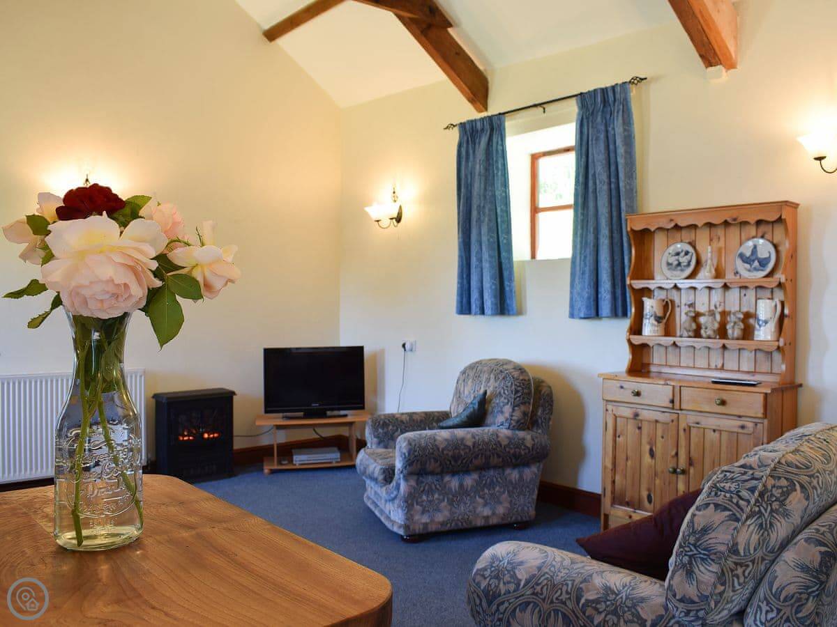 The interior of this detached barn boasts an airy feel with an A-frame structure and exposed beams over the large open plan living space. The spacious kitchen has a breakfast bar and flows nicely through to the dining and living area; which has a wood burner style electric fan heater. There is also a garden to the front with views across to the sea.