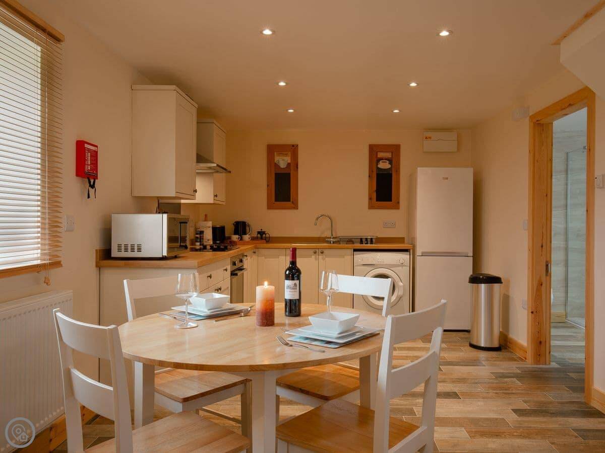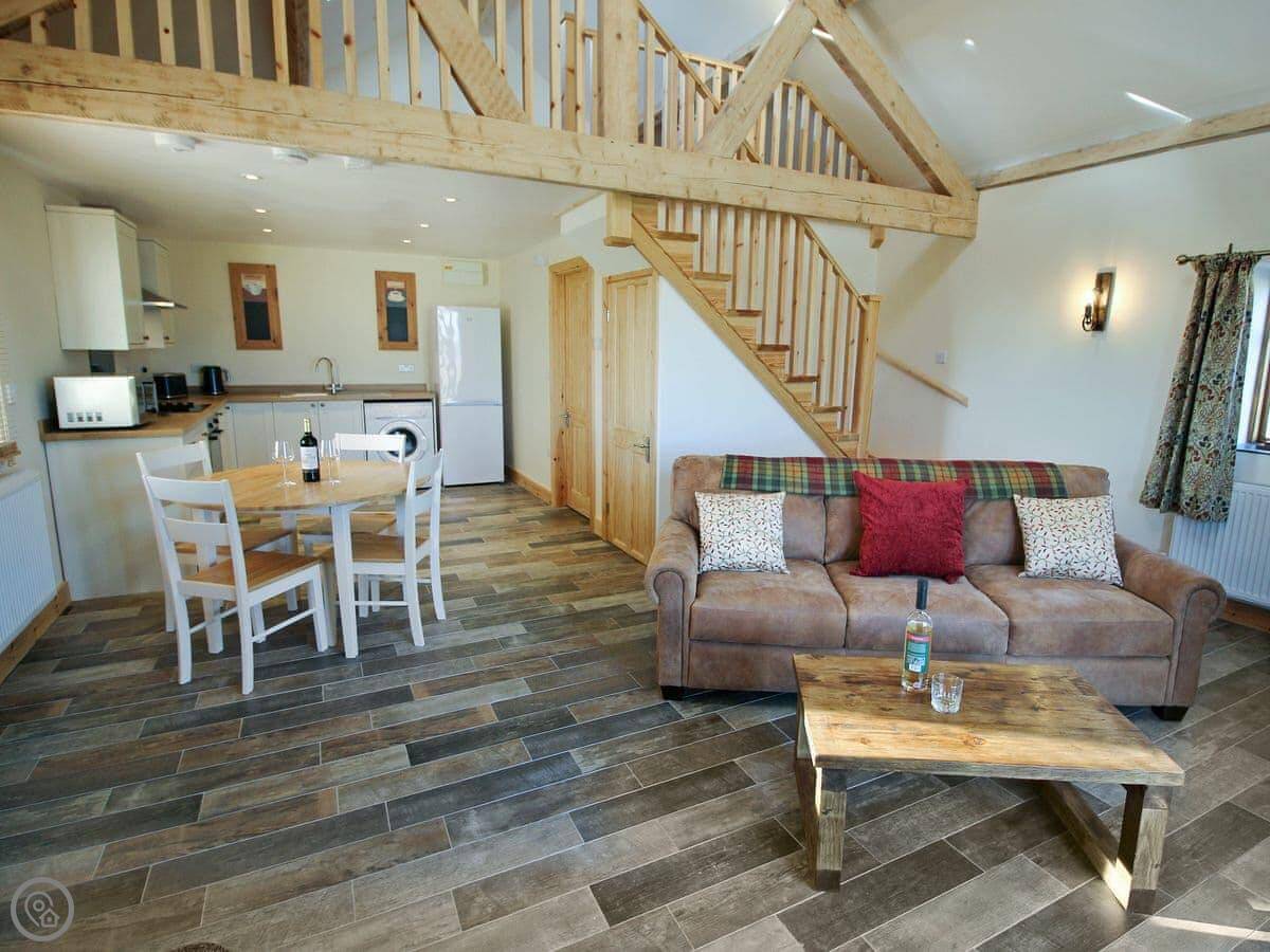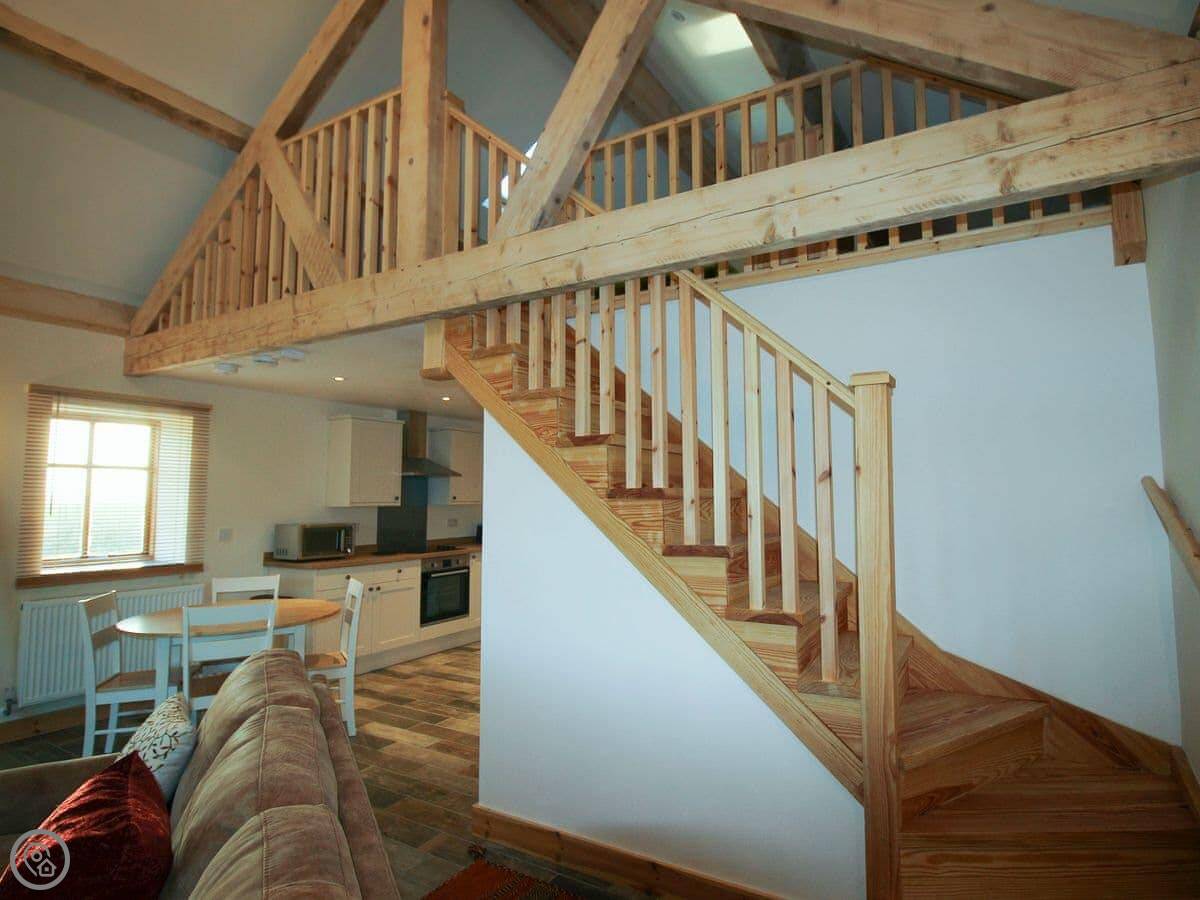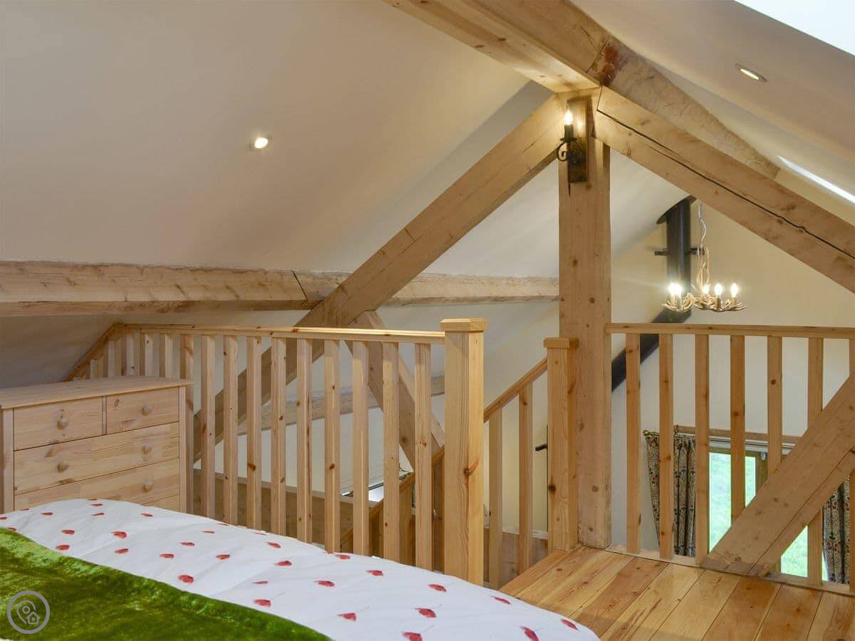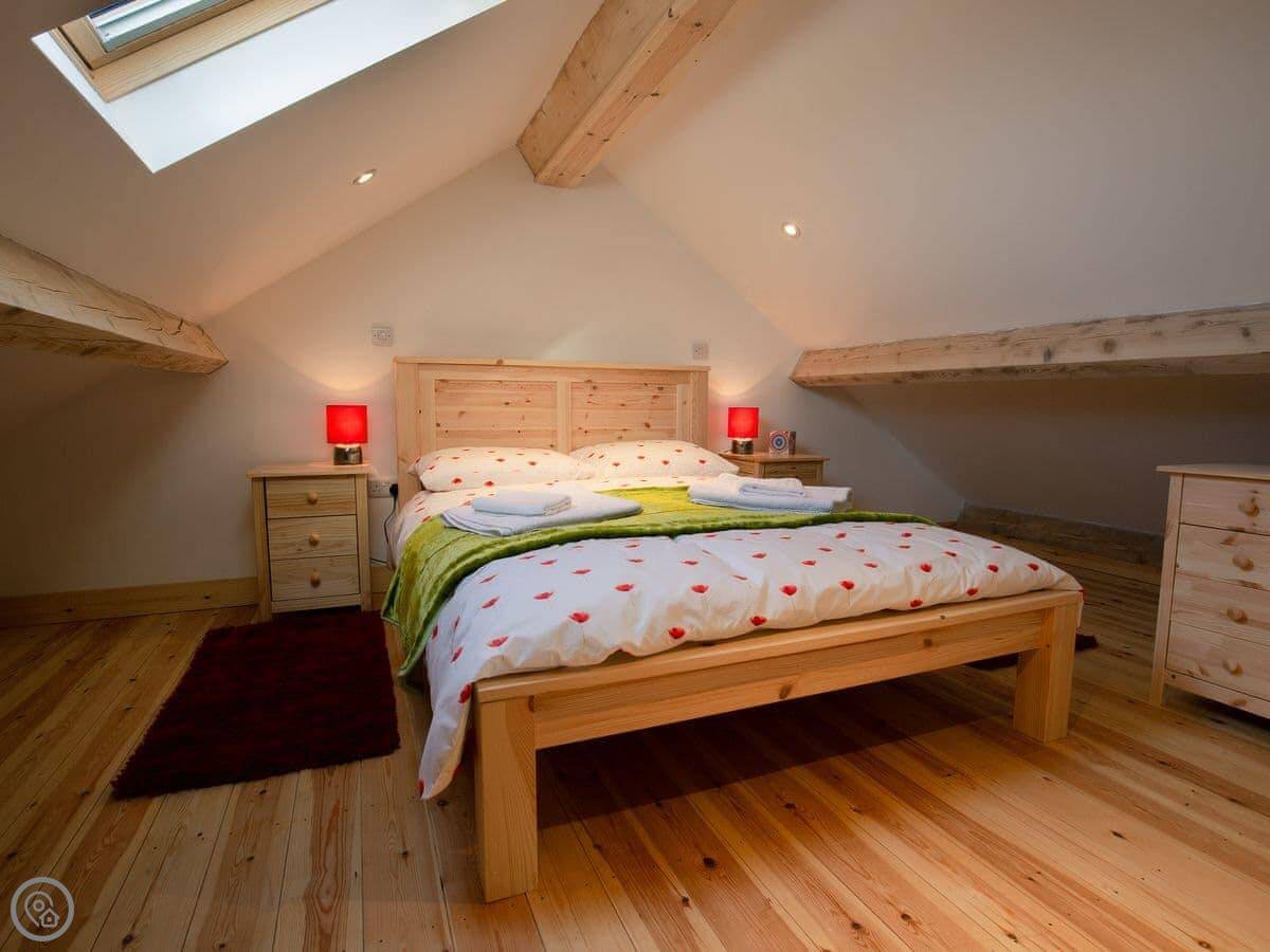 It sleeps two. One bedroom, one bathroom. It's got a 5 Star rating, which means it's well-finished and everything should work. The bedroom is up a proper staircase in a loft. The ceiling is low in parts, so taller people need to be careful.
