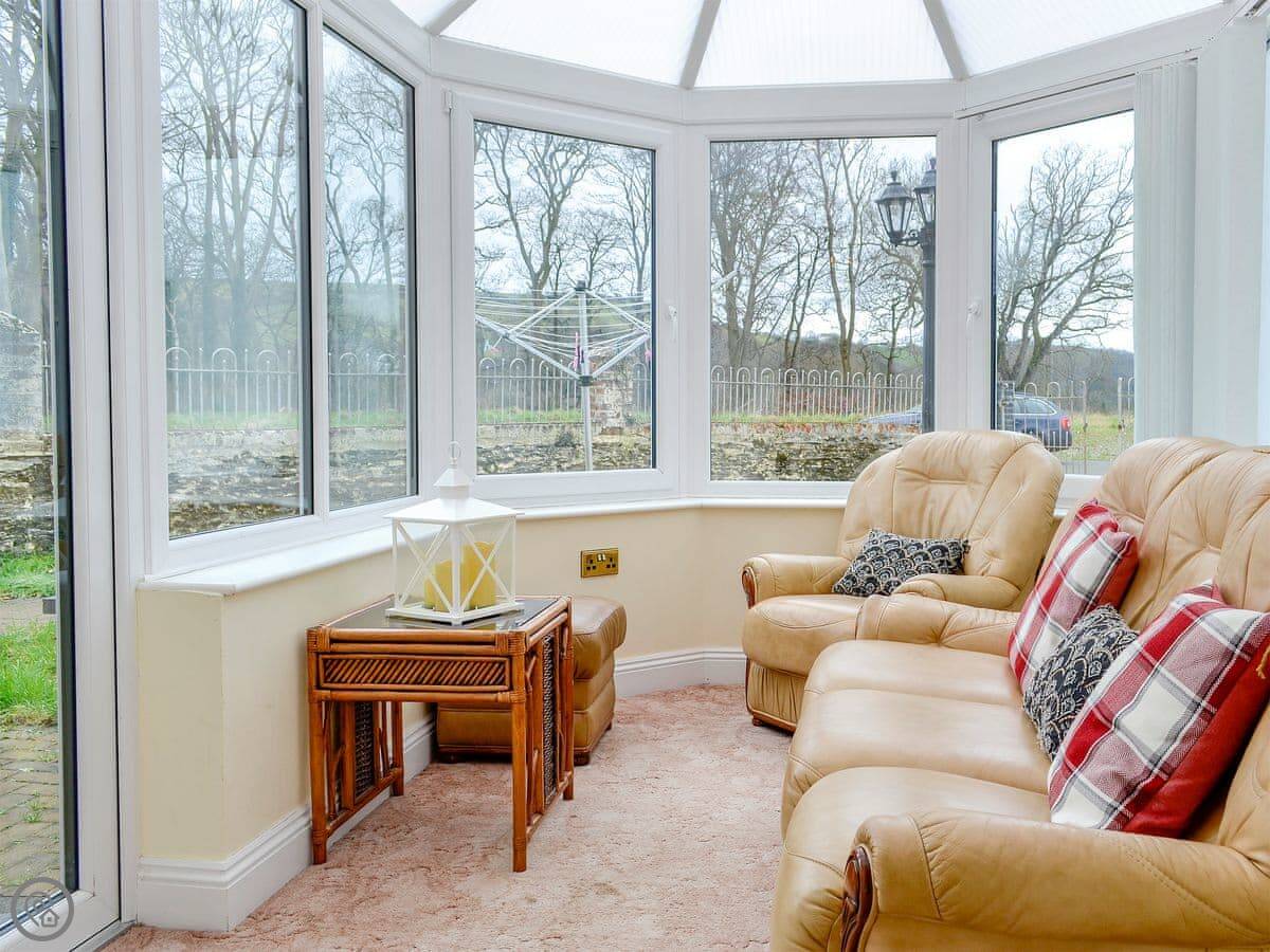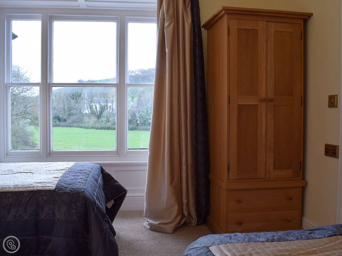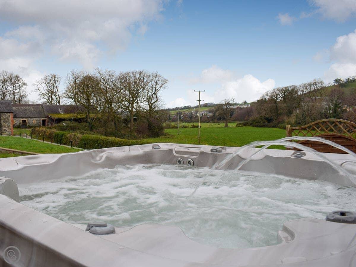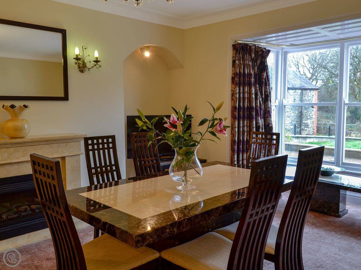 The front looks right out over the Rheidol Valley. There's a hot tub in the front garden. Inside, there are two living rooms, both with wood burners. One has a big TV. There's a large dining room with a wood burner too, and a conservatory that leads out to a small, enclosed terrace.