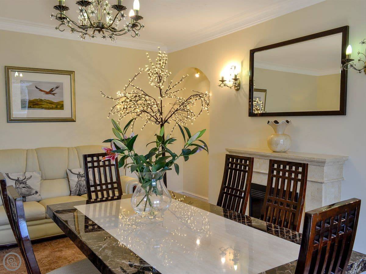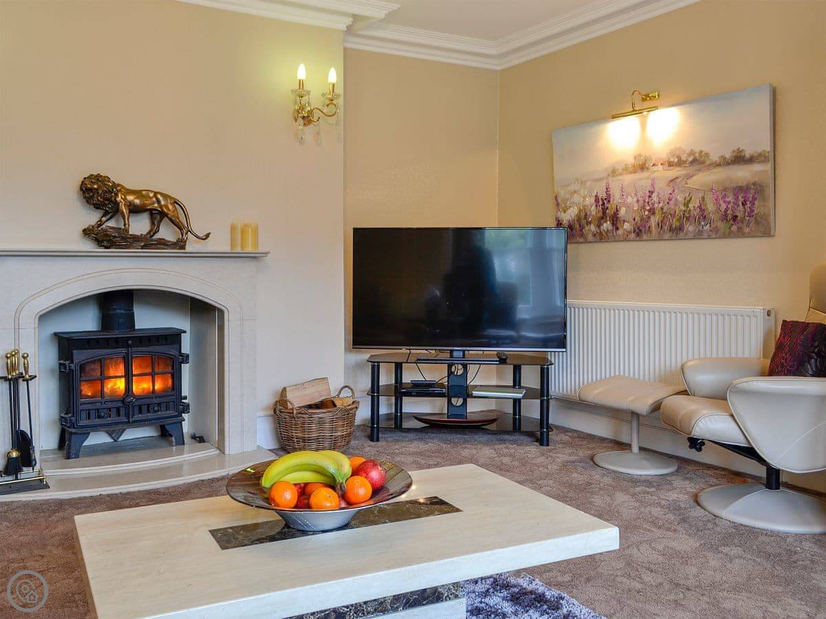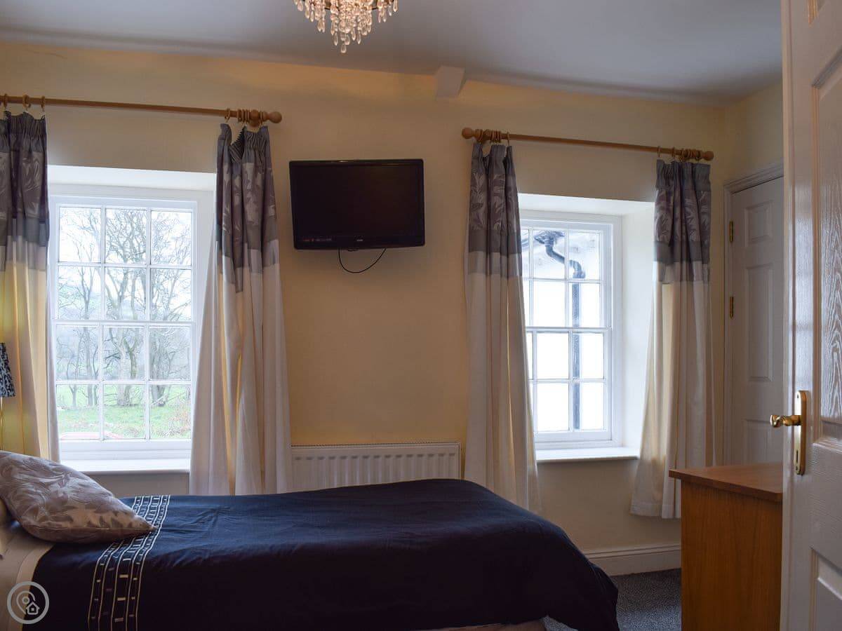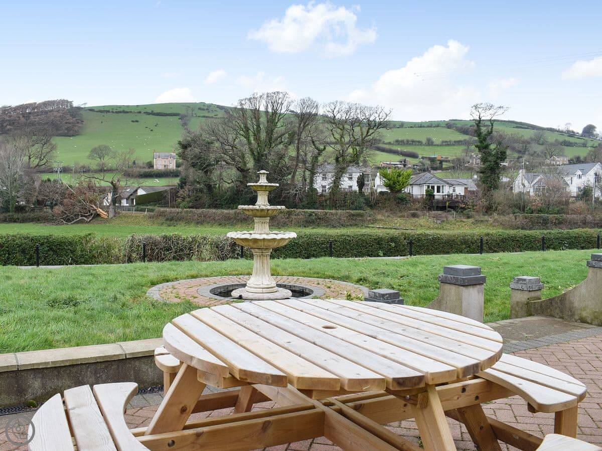 The front looks right out over the Rheidol Valley. There's a hot tub in the front garden. Inside, there are two living rooms, both with wood burners. One has a big TV. There's a large dining room with a wood burner too, and a conservatory that leads out to a small, enclosed terrace.