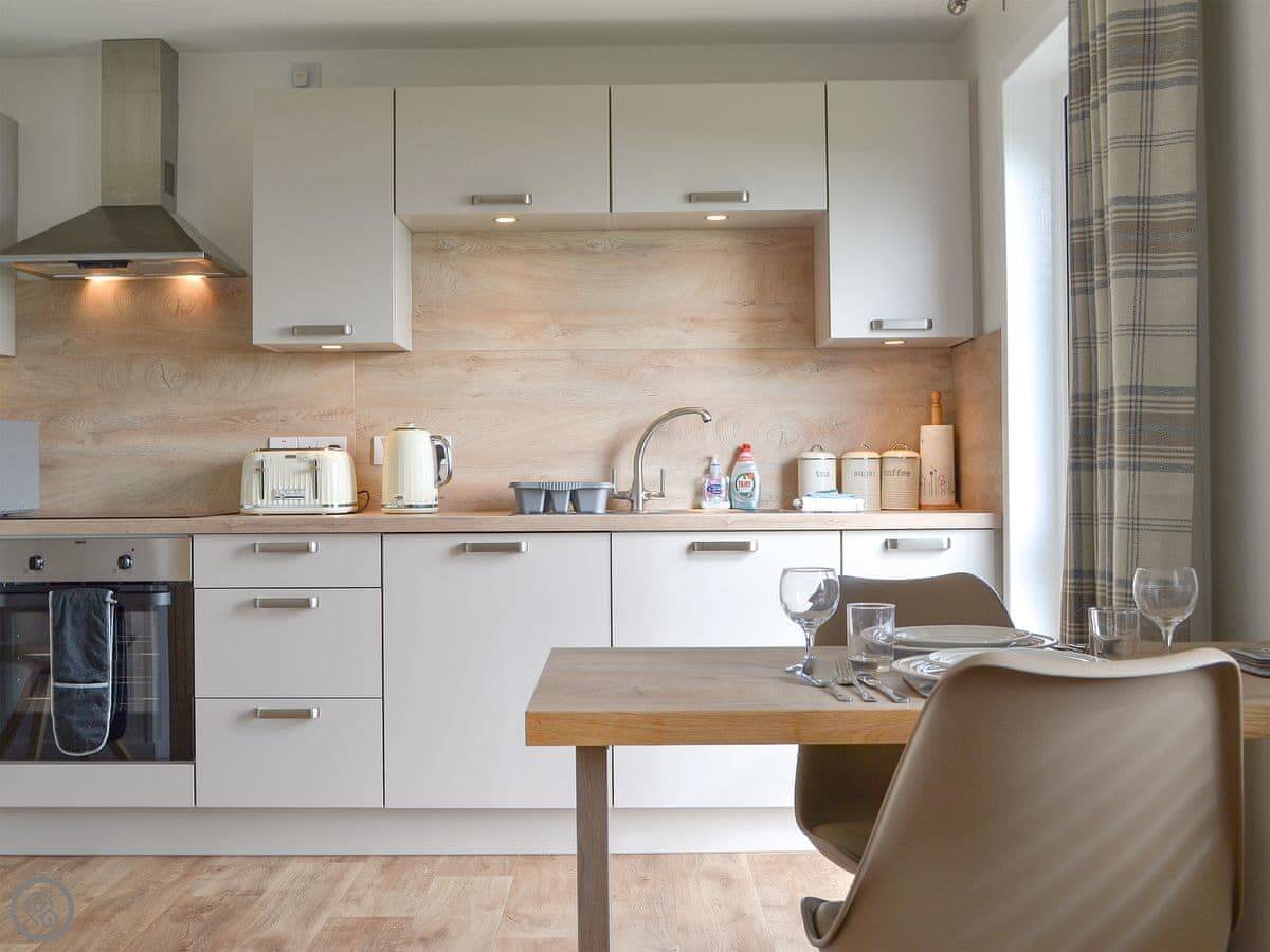 It sleeps two. One bedroom with twin beds, one bathroom with a shower. It's got a 4 Star rating. It's a modern build, so everything works and there's good light. The main space is open plan: kitchen, dining area, and living room all together. There's a TV and wifi. It's straightforward.
