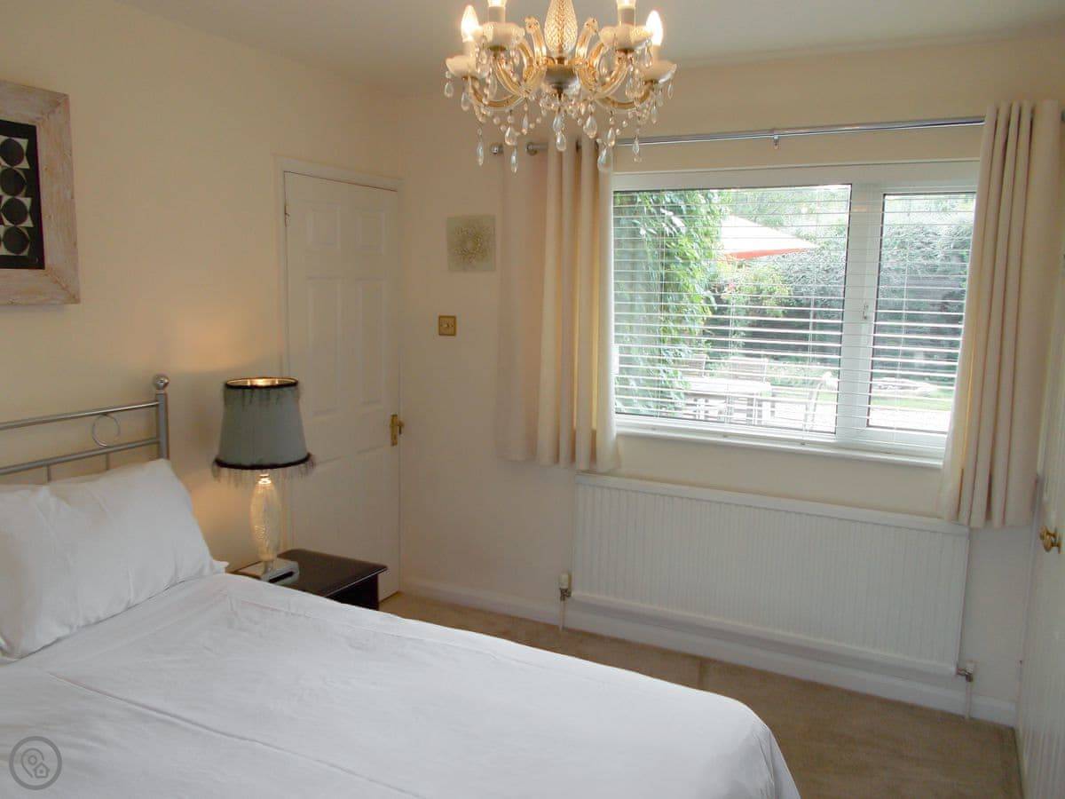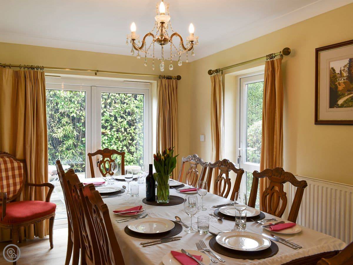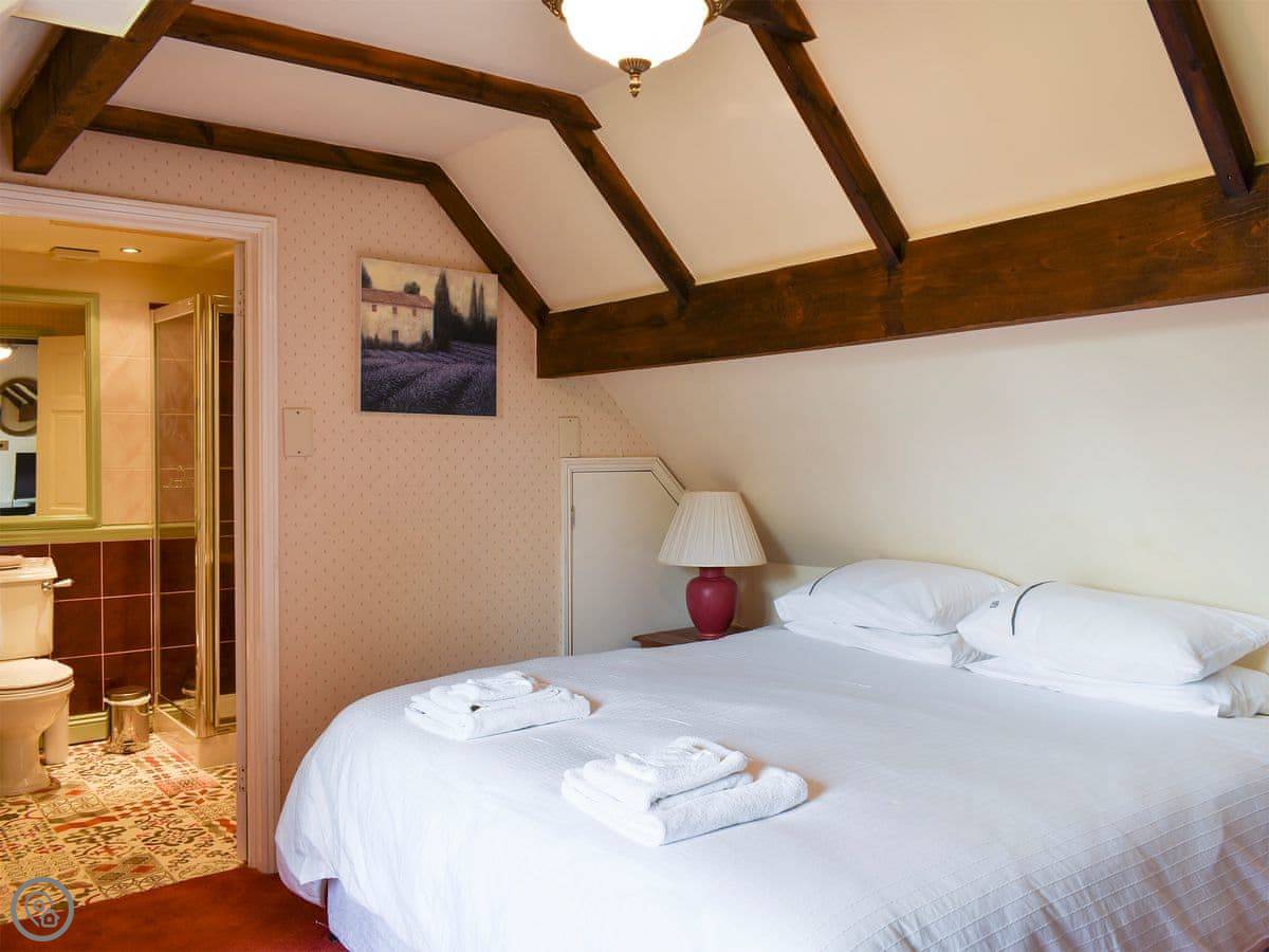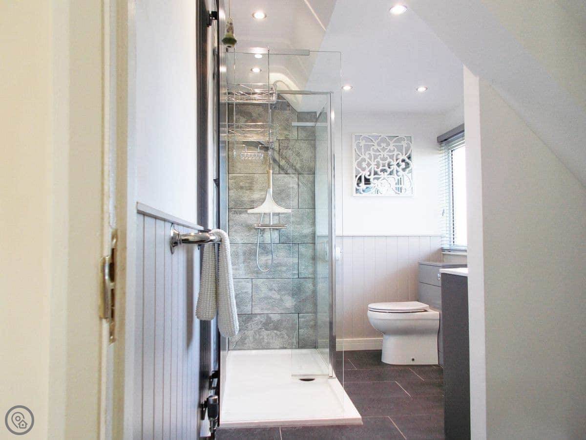 It sleeps ten people, which is a lot. There are four bedrooms and each one has its own bathroom or shower room. It's got a 5 Star rating, so it's well equipped and comfortable. Everything's on one level except for one bedroom, which is up a small set of stairs. There's parking for three cars on the gravel drive.