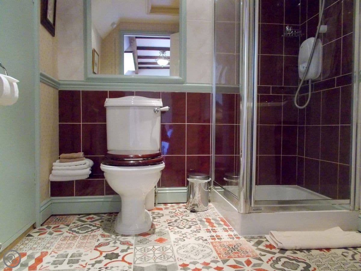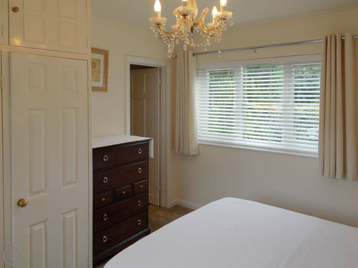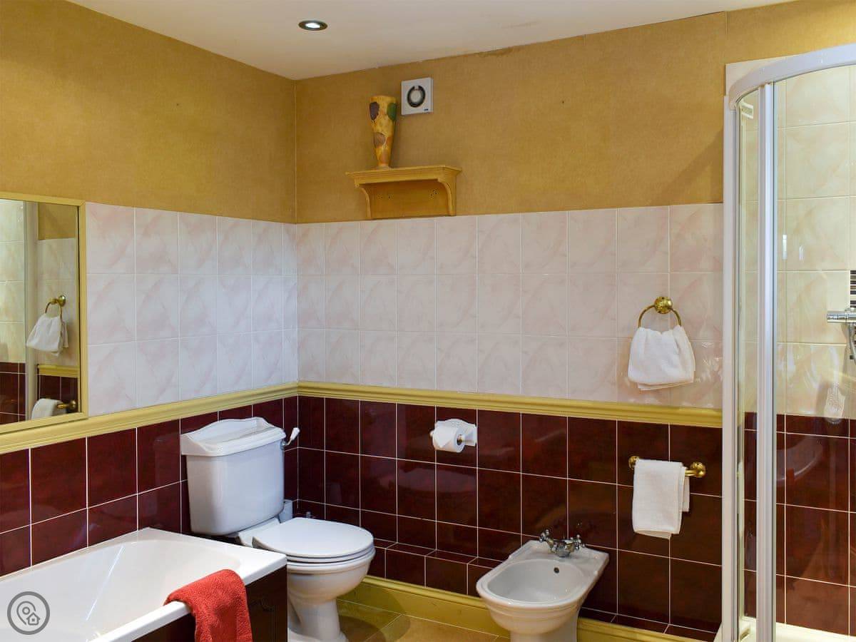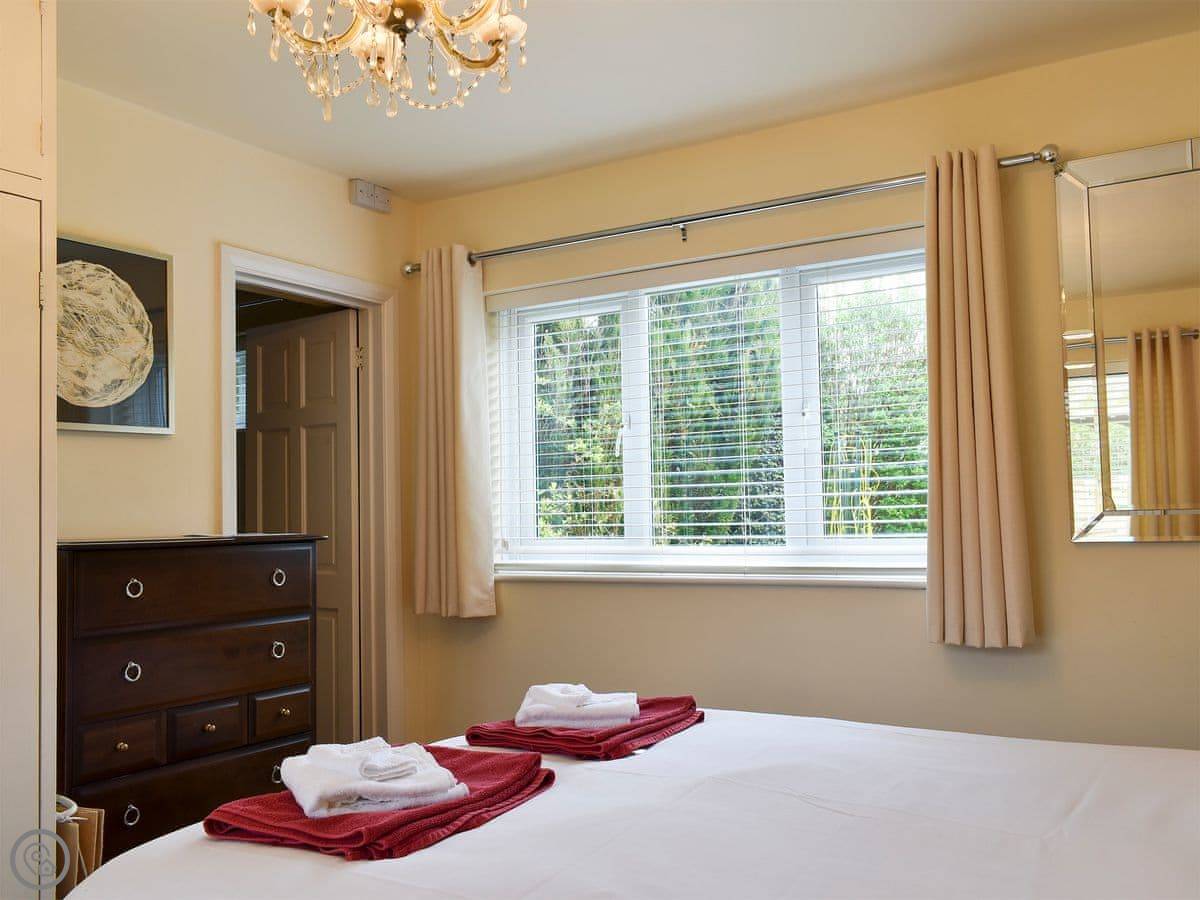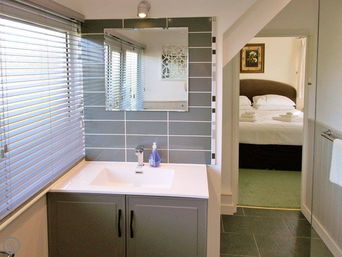 It sleeps ten people, which is a lot. There are four bedrooms and each one has its own bathroom or shower room. It's got a 5 Star rating, so it's well equipped and comfortable. Everything's on one level except for one bedroom, which is up a small set of stairs. There's parking for three cars on the gravel drive.