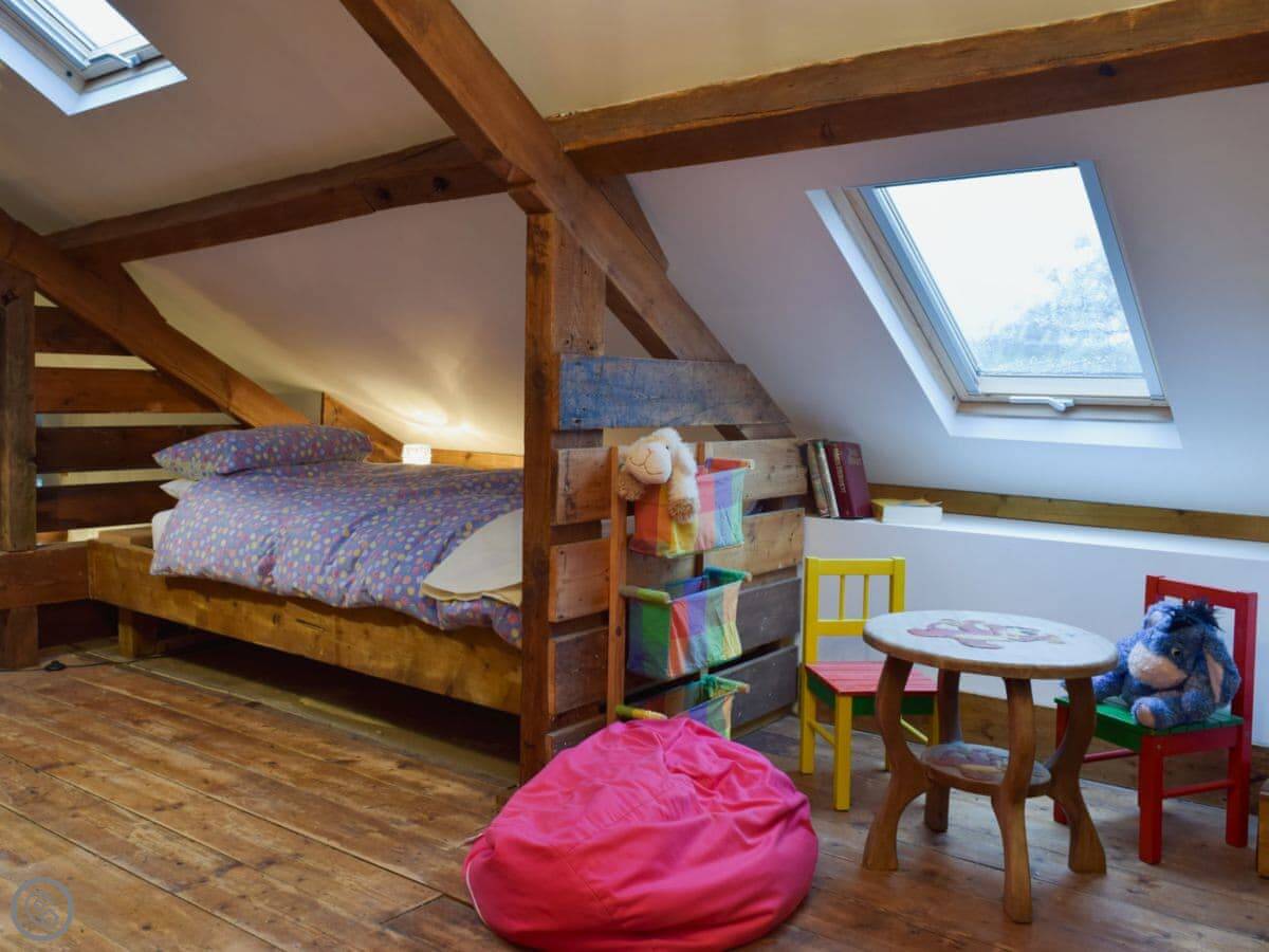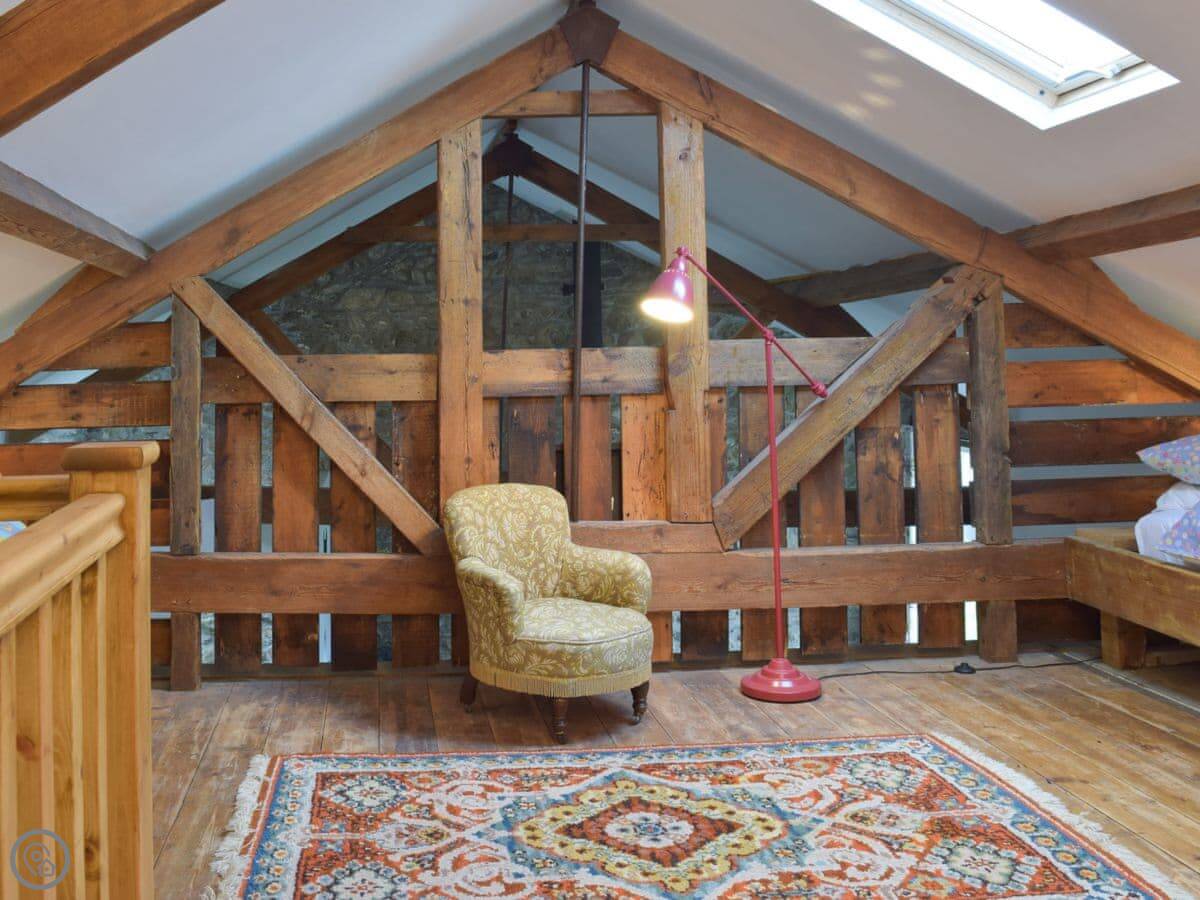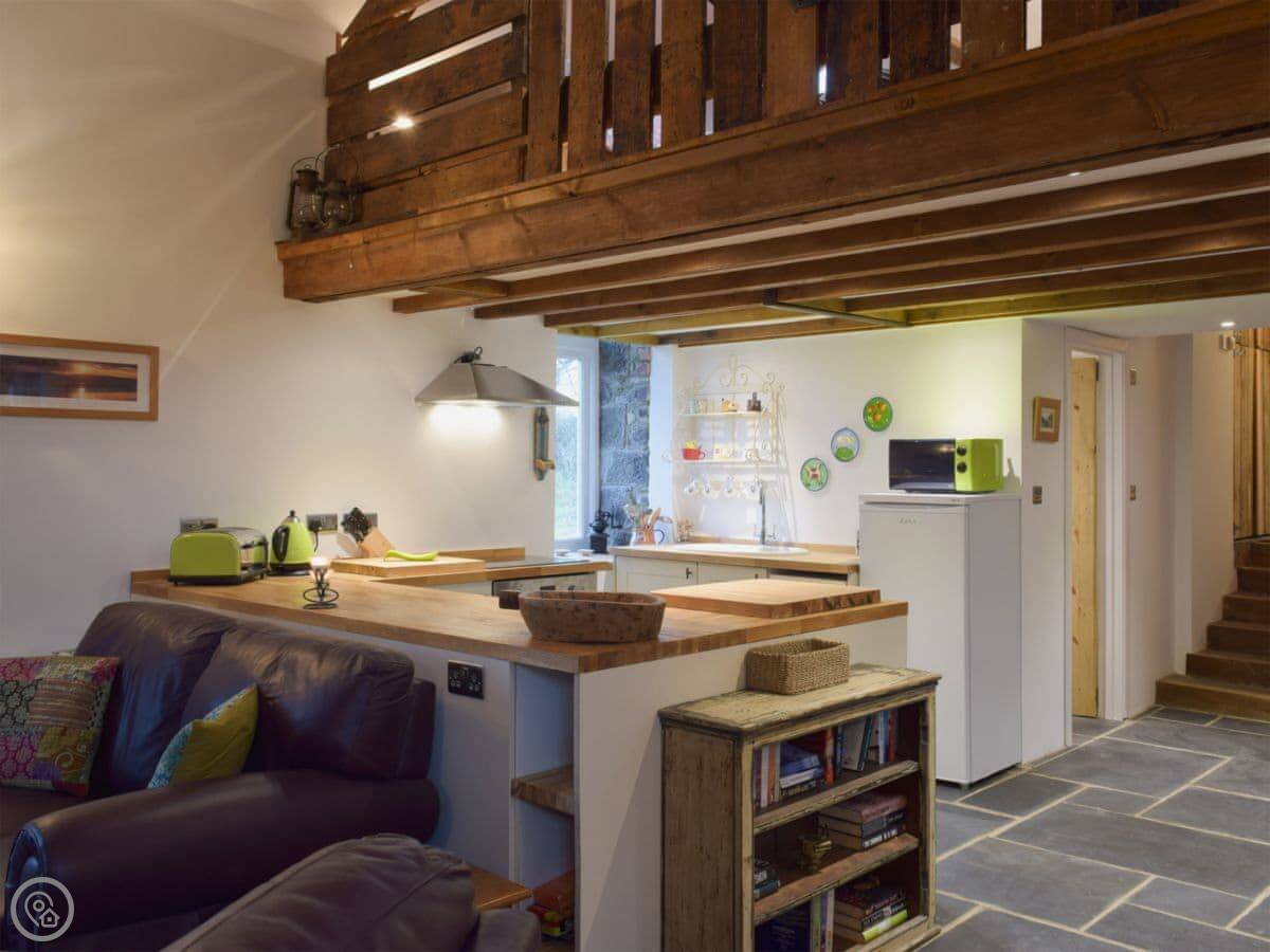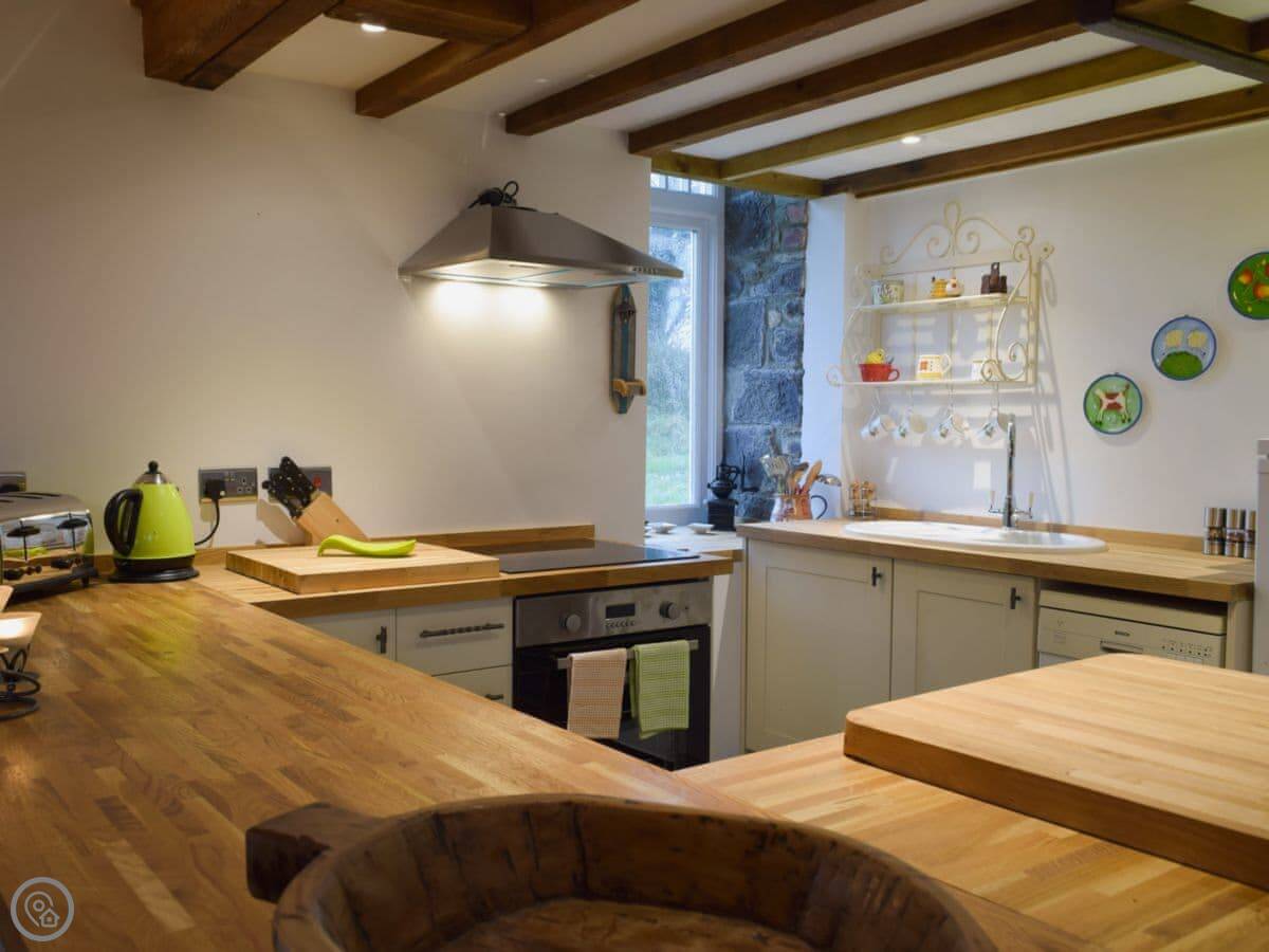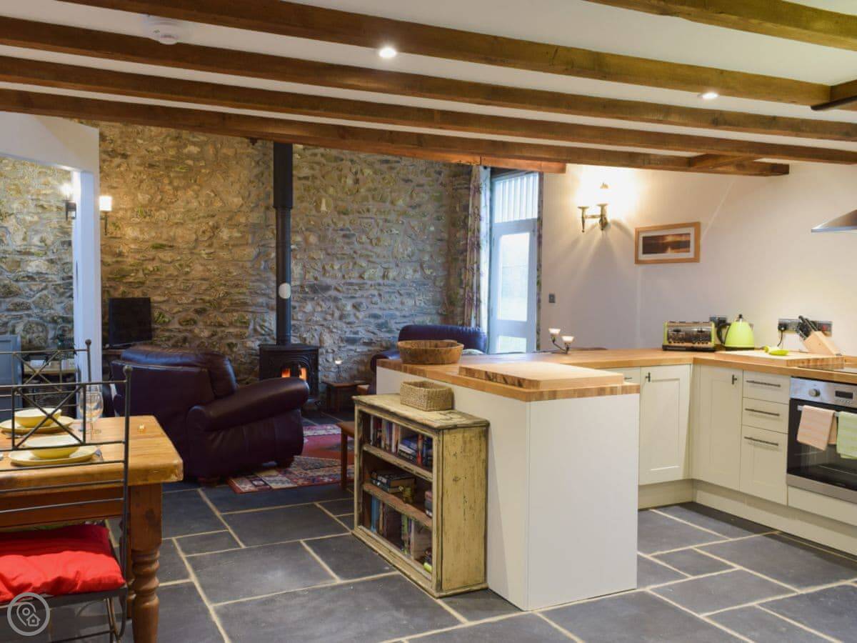 The main space is open plan. Kitchen, dining table, and living area with a wood burner. It has high ceilings with the original beams. The kitchen is well equipped with a dishwasher and washing machine.