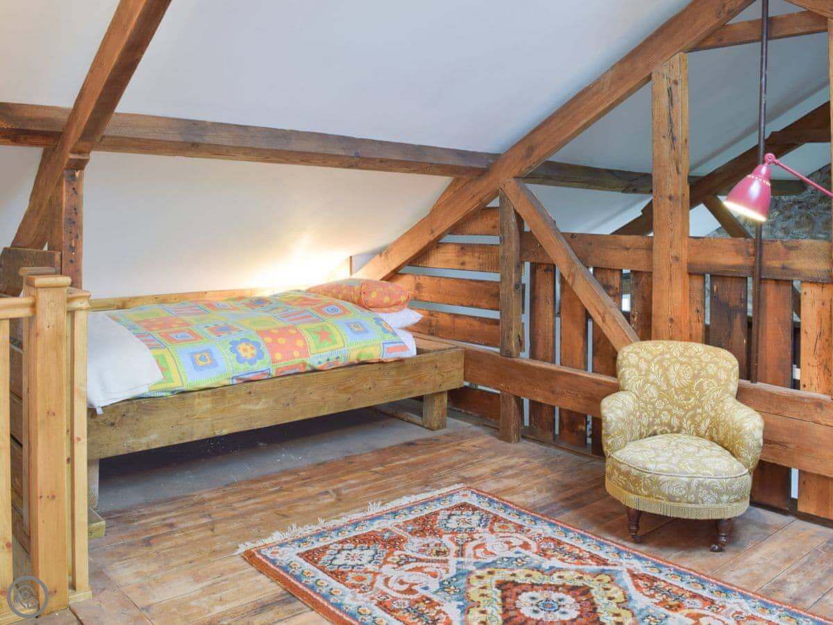 It sleeps four. Two bedrooms, both doubles, and two bathrooms, so it's straightforward. One bedroom is on the first floor, the other is on a mezzanine level above the living area. The stairs up to the mezzanine are a ship's ladder. They're steep and a bit narrow, but they're sturdy. It's fine for most people, but not ideal if you have mobility issues or very young children.