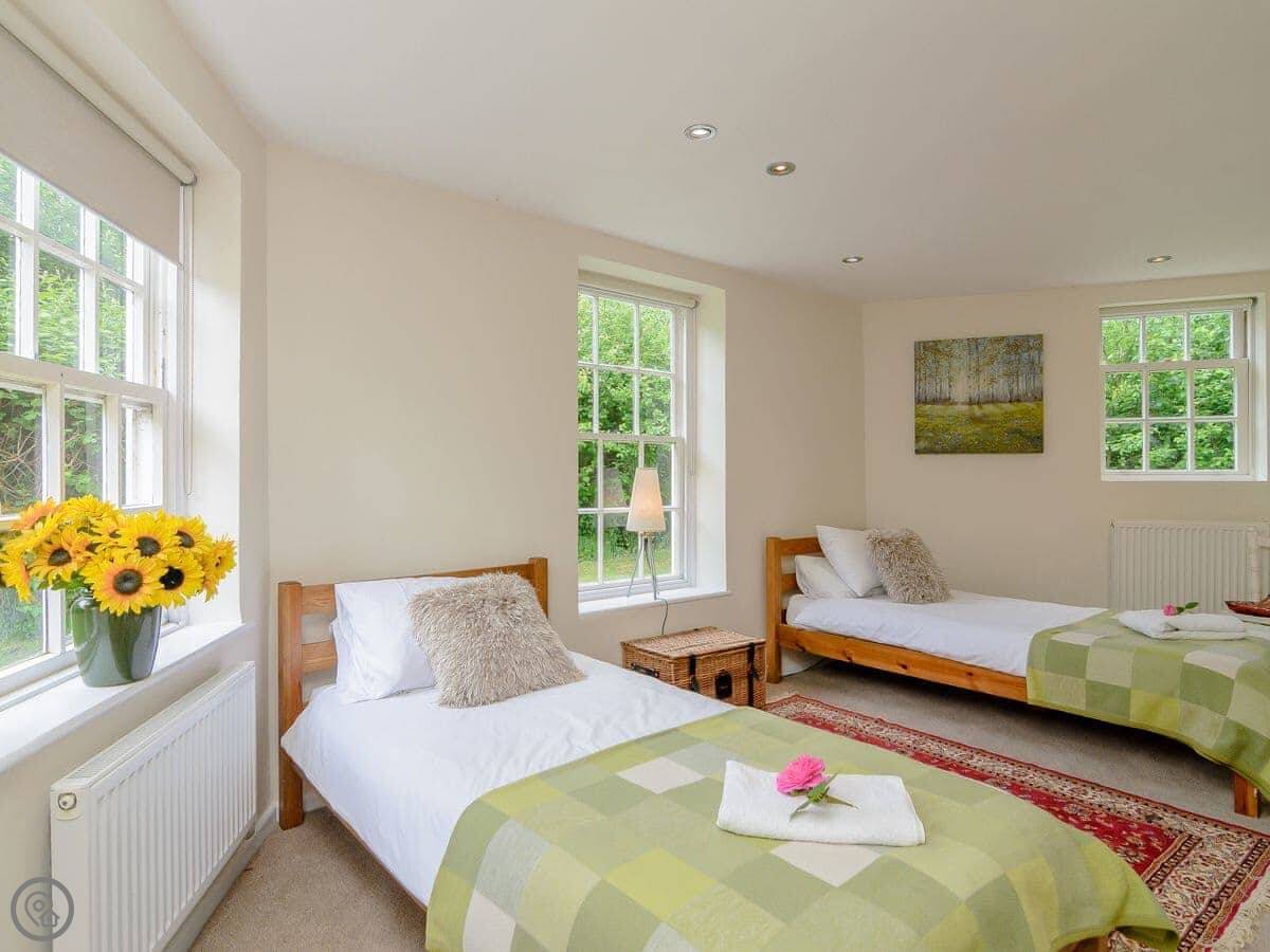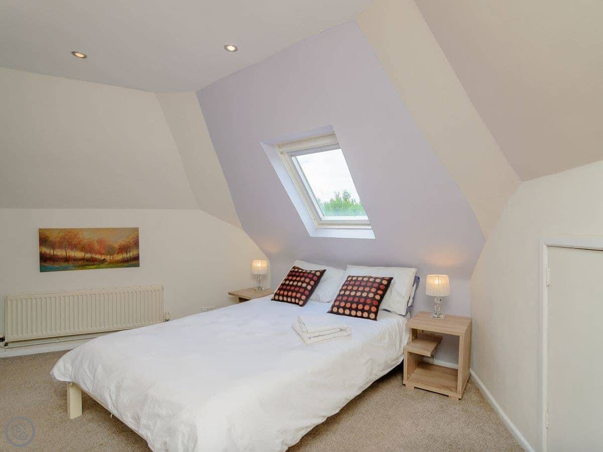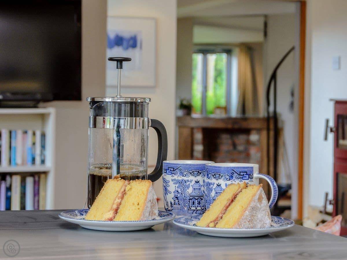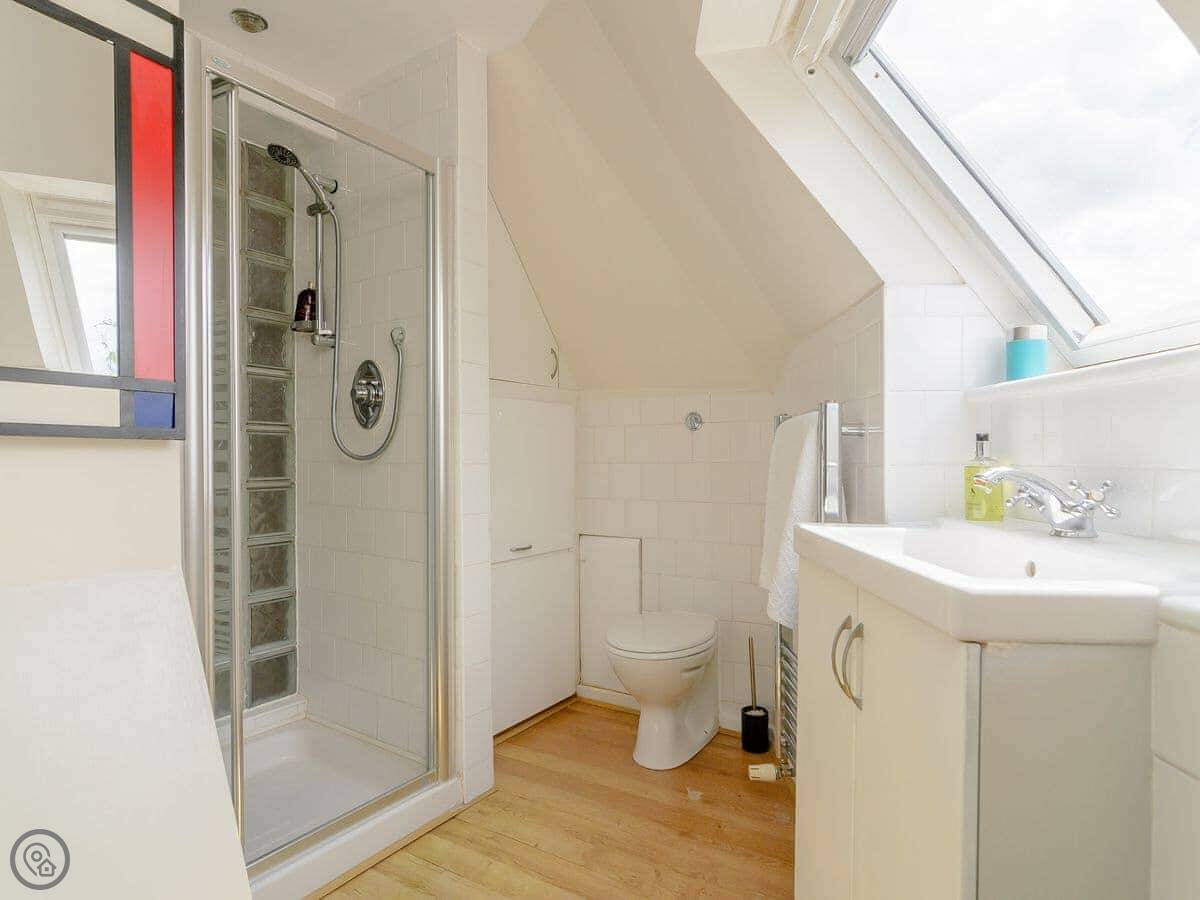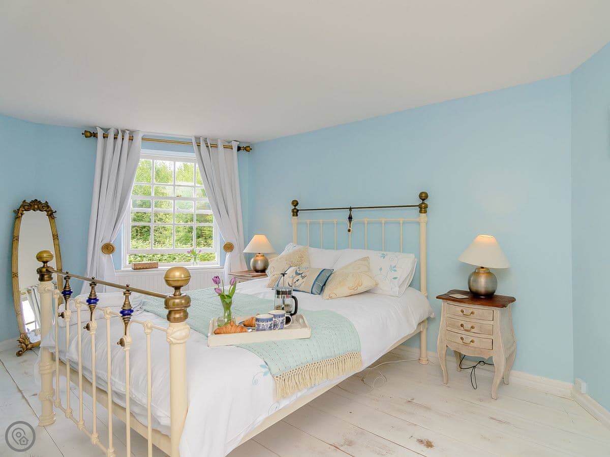 The two sitting rooms are on the ground floor; the octagonal sitting room is comfortable and cosy, with its wooden floors and Smart TV. The second sitting room is an absolute delight with its ‘High and Mighty’ wood burner stove by Chili Penguin. There’s even a top stove to cook pizzas on when the fire is roaring! A Freeview TV, library of books and board games are all available to while away the hours if the weather is bad. Upstairs, the master bedroom is a delight with a king-size brass bed, stripped wooden floors and stunning views from the generous windows.