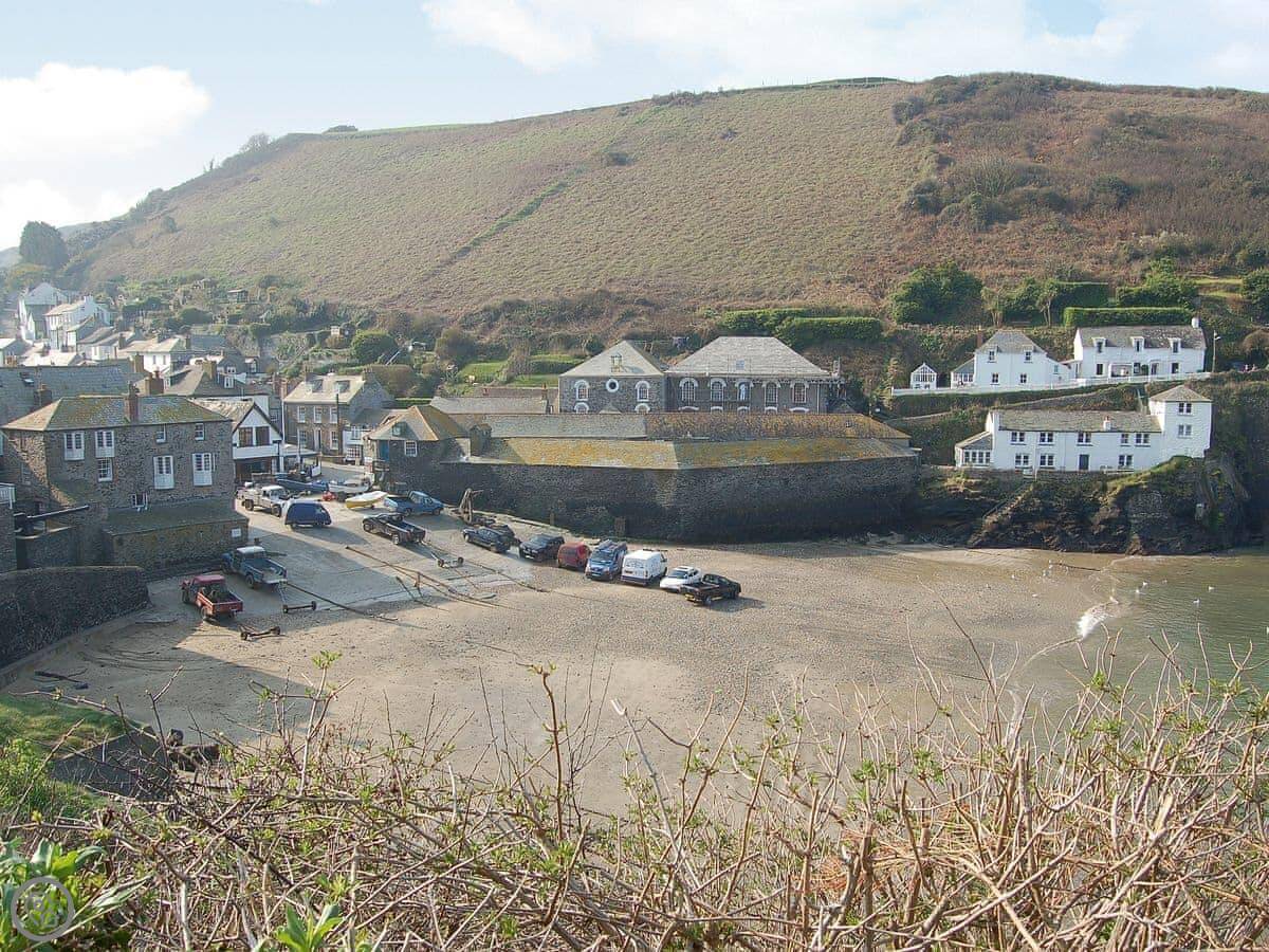 Port Isaac is a working fishing harbour. It's where they filmed a lot of Doc Martin. It's busy in summer, quieter in winter. The nearest sandy beach is at Port Gaverne, which is just around the headland, maybe a ten minute walk.