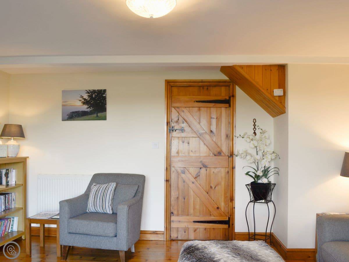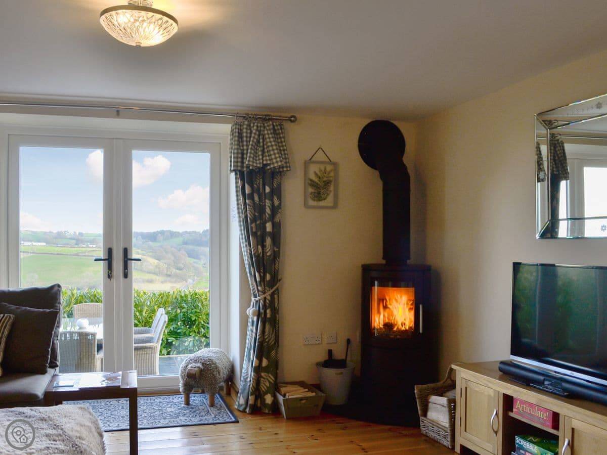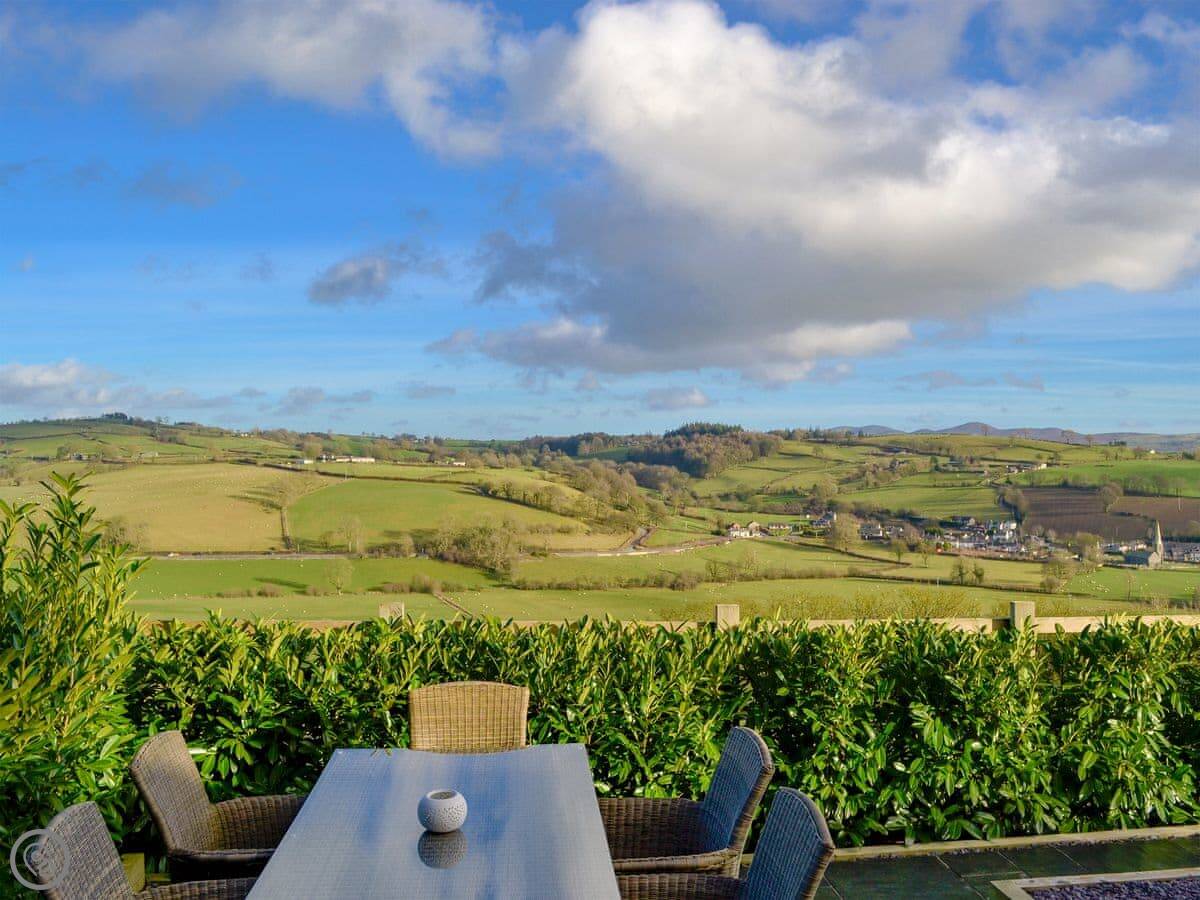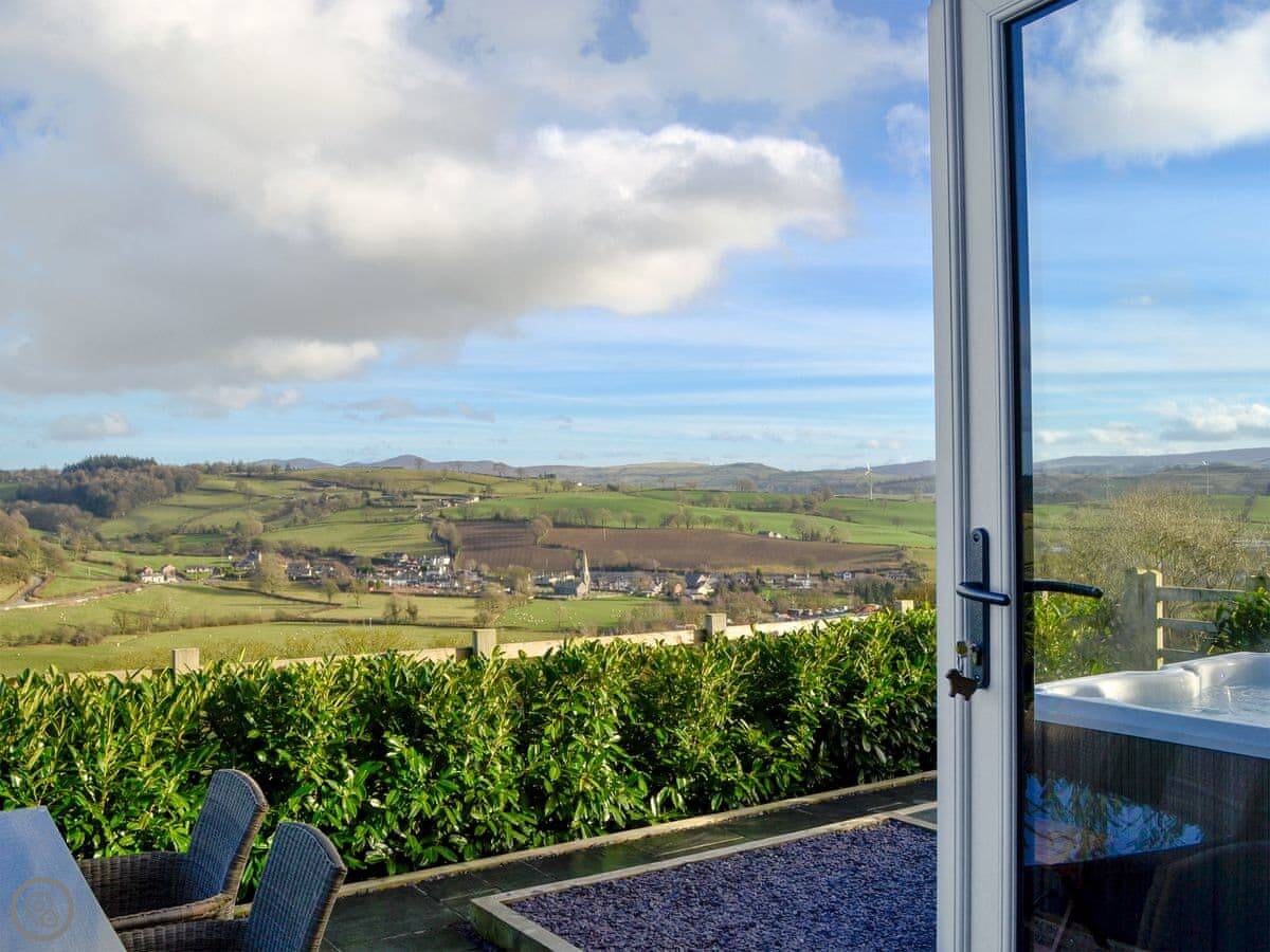It sleeps four. Two bedrooms and a family bathroom. It's got a 5 Star rating, which means it's well-finished and comfortable. The main thing is the view from the living room and the patio. It looks out over the village and the fields. It's a good spot to sit.