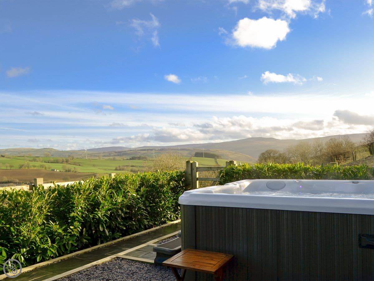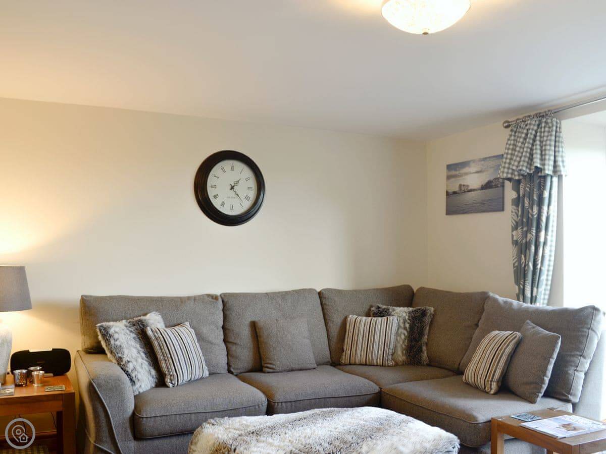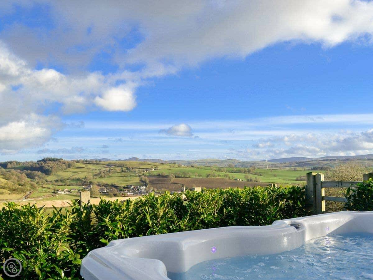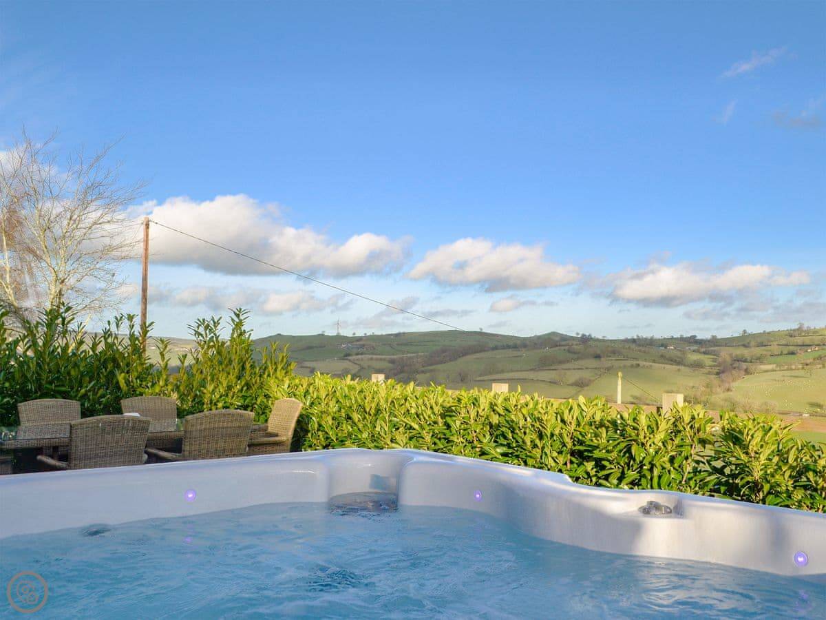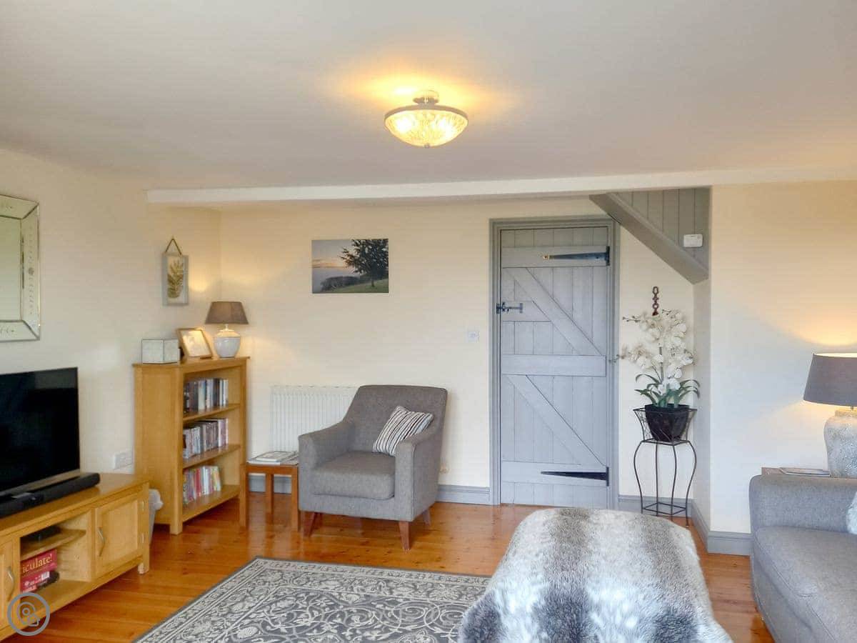 It sleeps four. Two bedrooms and a family bathroom. It's got a 5 Star rating, which means it's well-finished and comfortable. The main thing is the view from the living room and the patio. It looks out over the village and the fields. It's a good spot to sit.