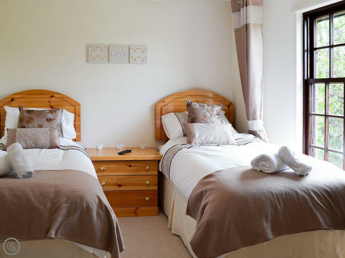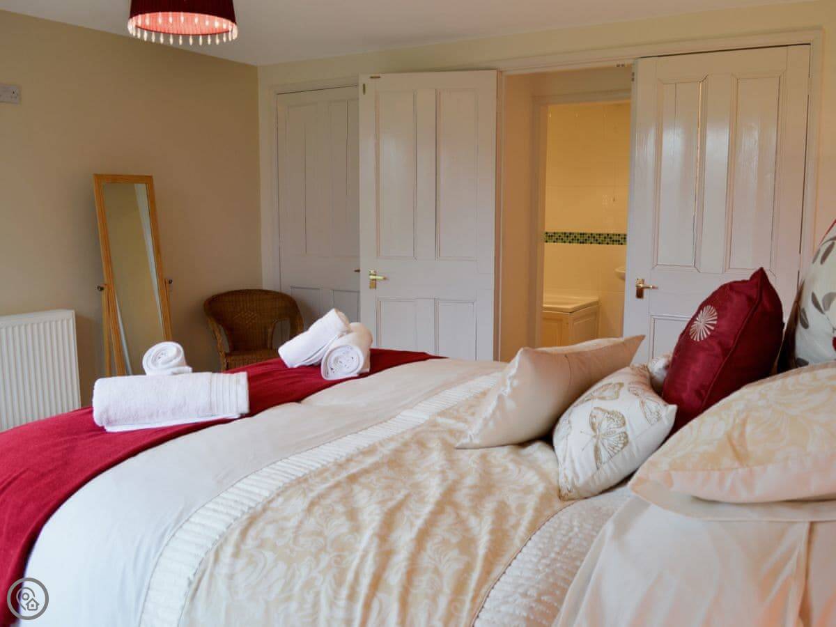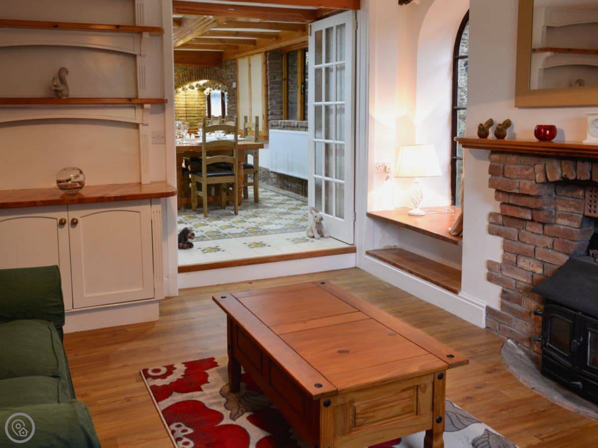 It sleeps eight in four bedrooms. There's a bathroom for each bedroom, which is handy. It's got a 5 Star rating, so it's well-equipped and comfortable. The main room has a big picture window and a wood burner.