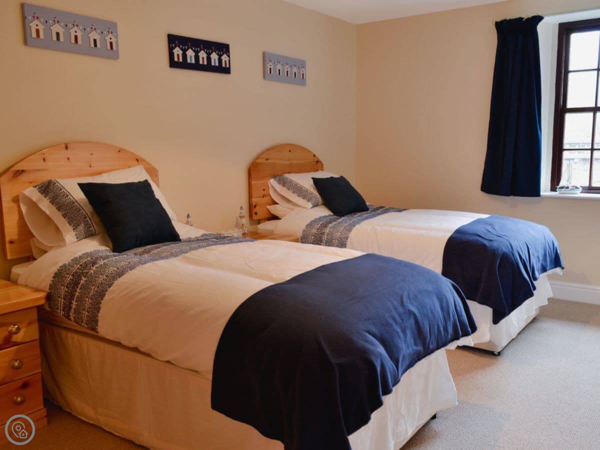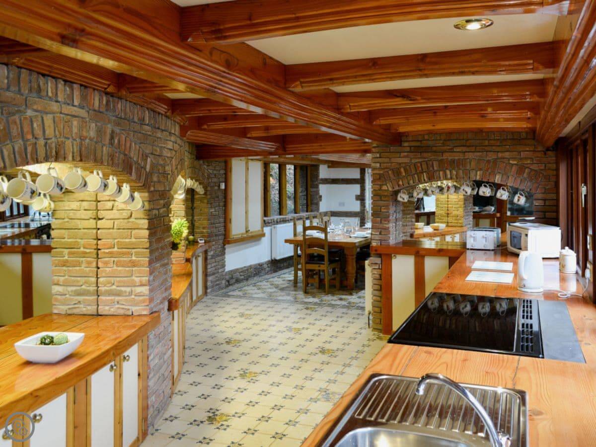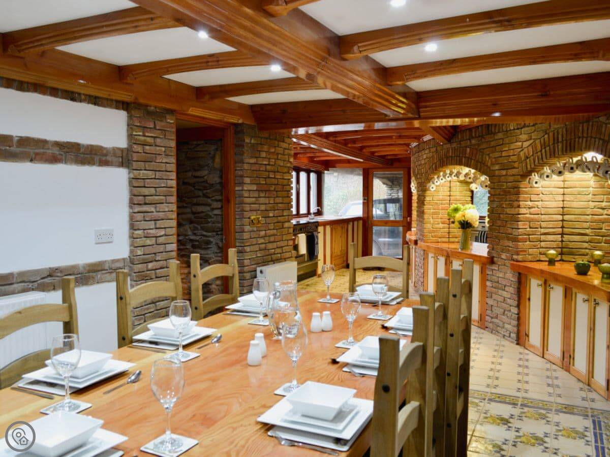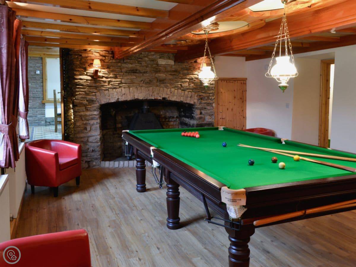 It sleeps eight in four bedrooms. There's a bathroom for each bedroom, which is handy. It's got a 5 Star rating, so it's well-equipped and comfortable. The main room has a big picture window and a wood burner.