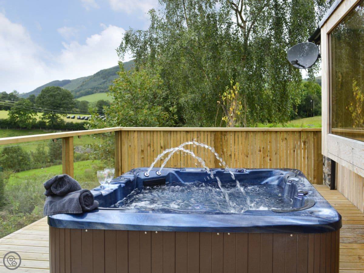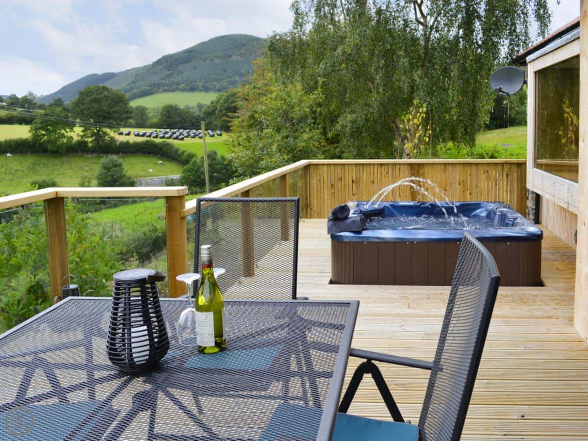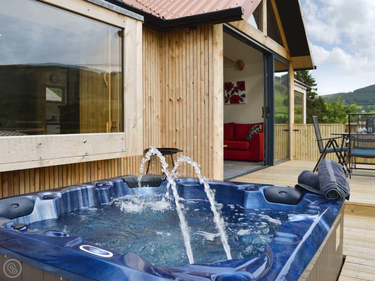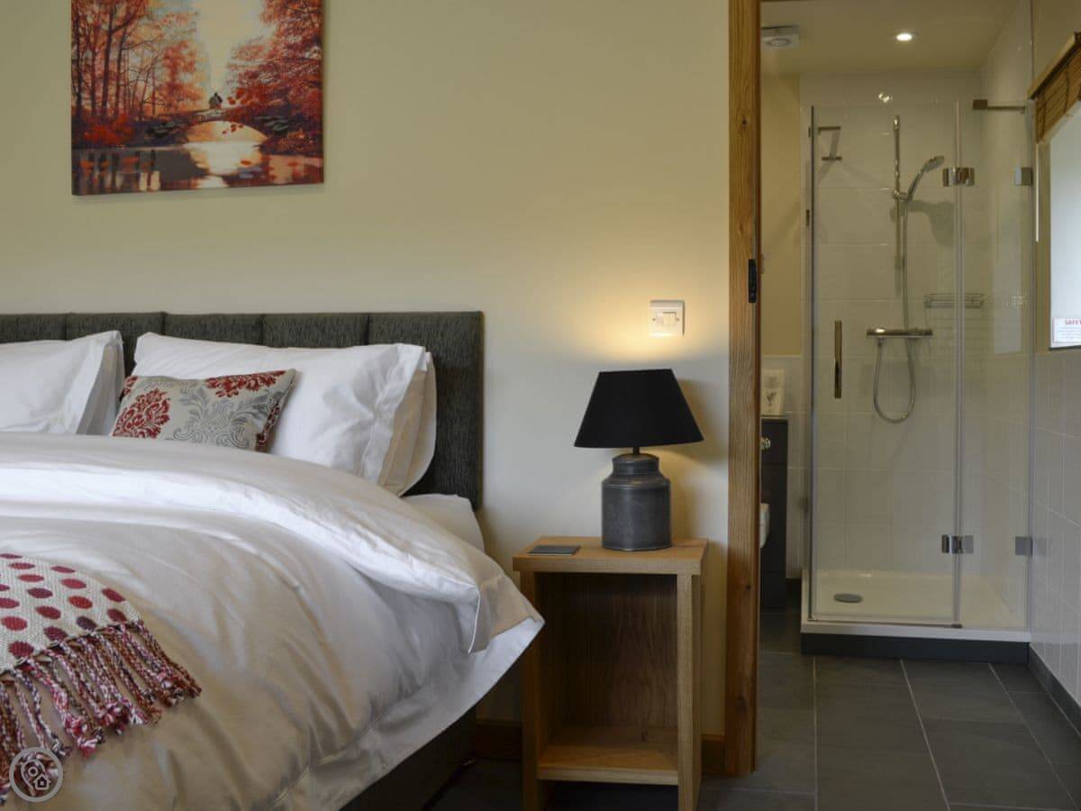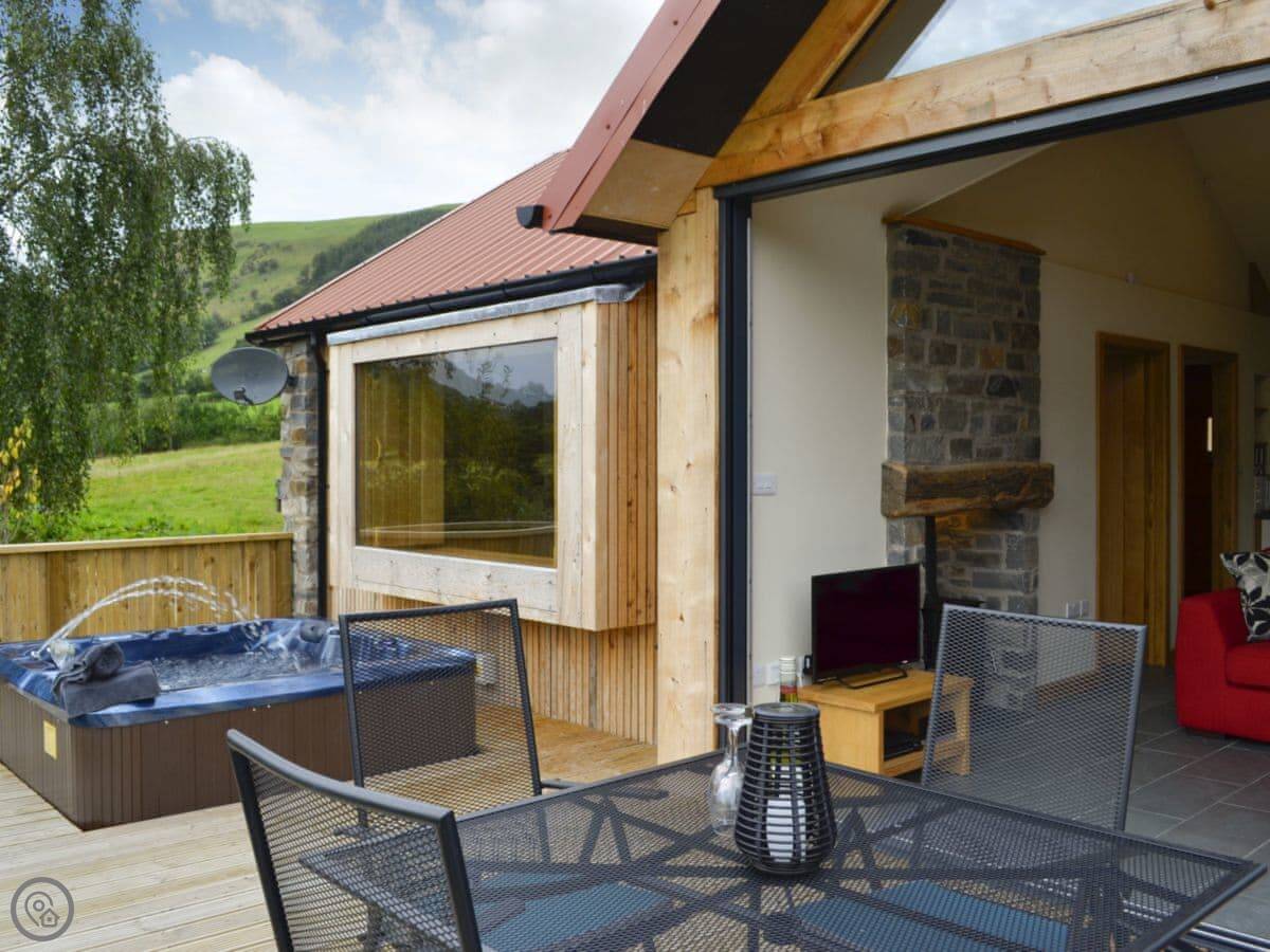 It sleeps four. Two bedrooms, both with their own bathrooms. It's got a 5 Star rating, which shows in the finish. Things like underfloor heating, a wood burner, good beds. There's a hot tub on the patio. The stairs are fine, not too steep.