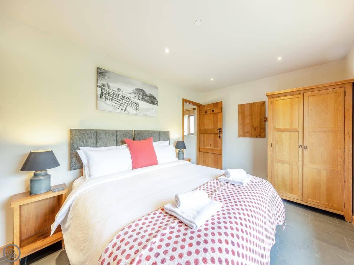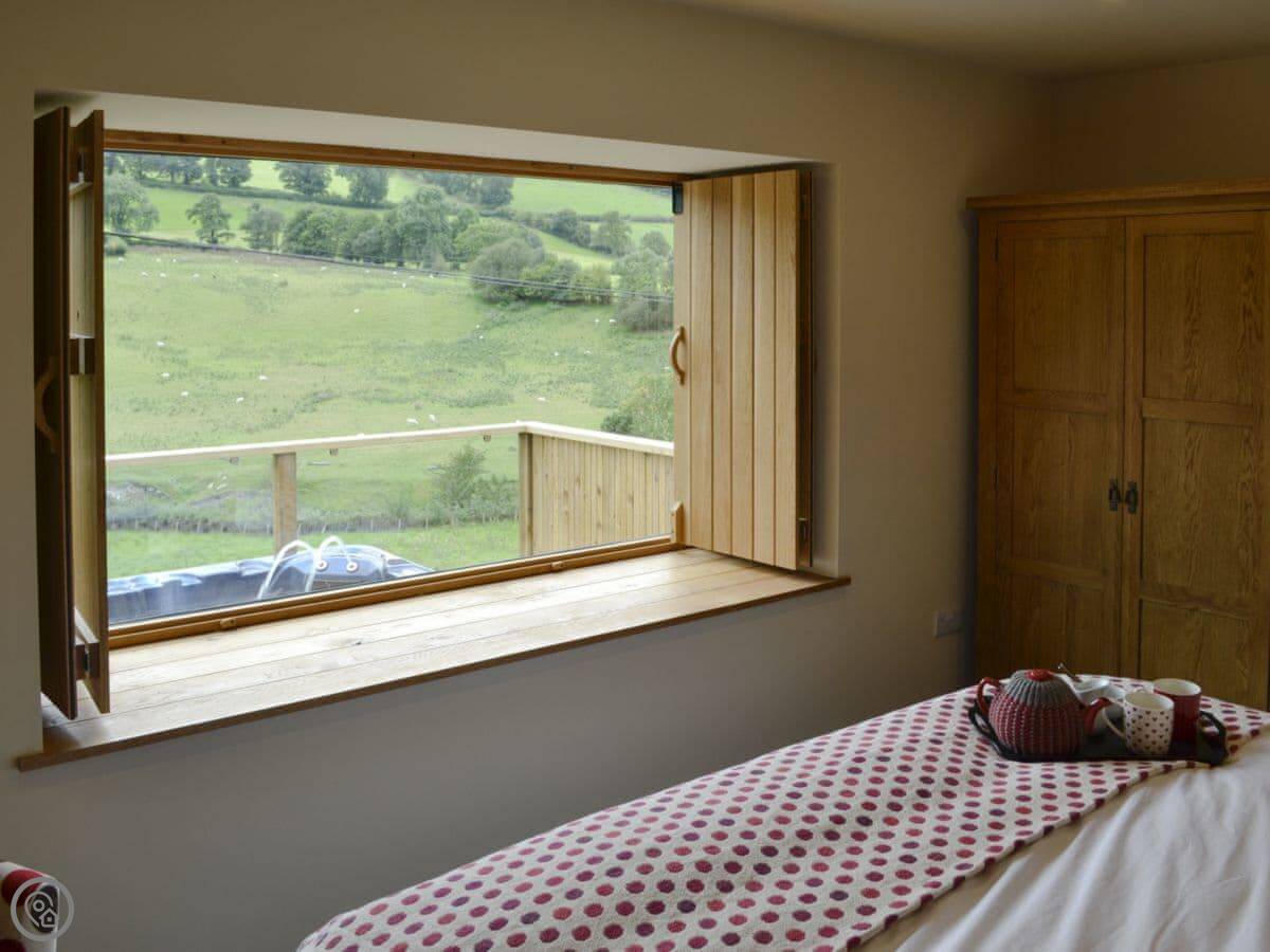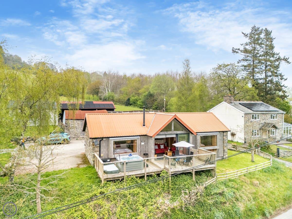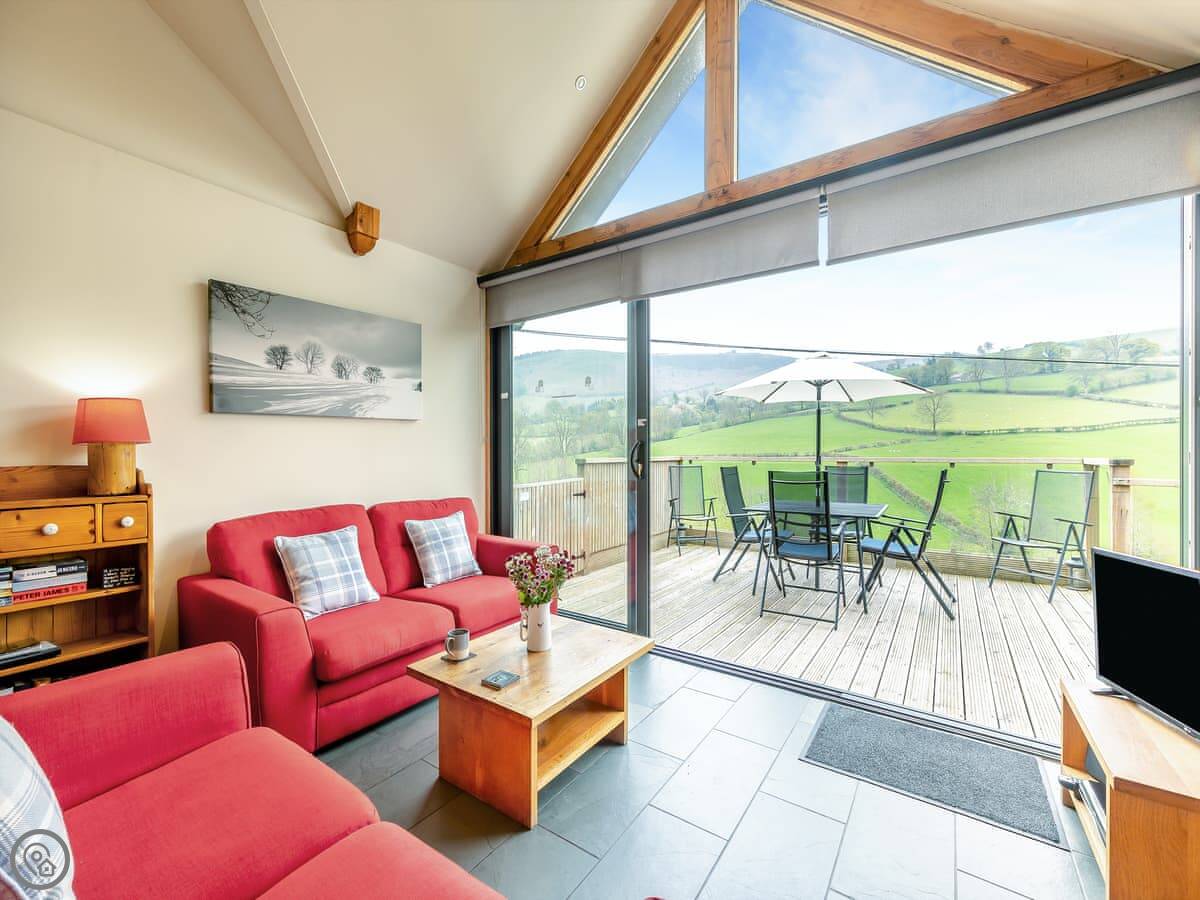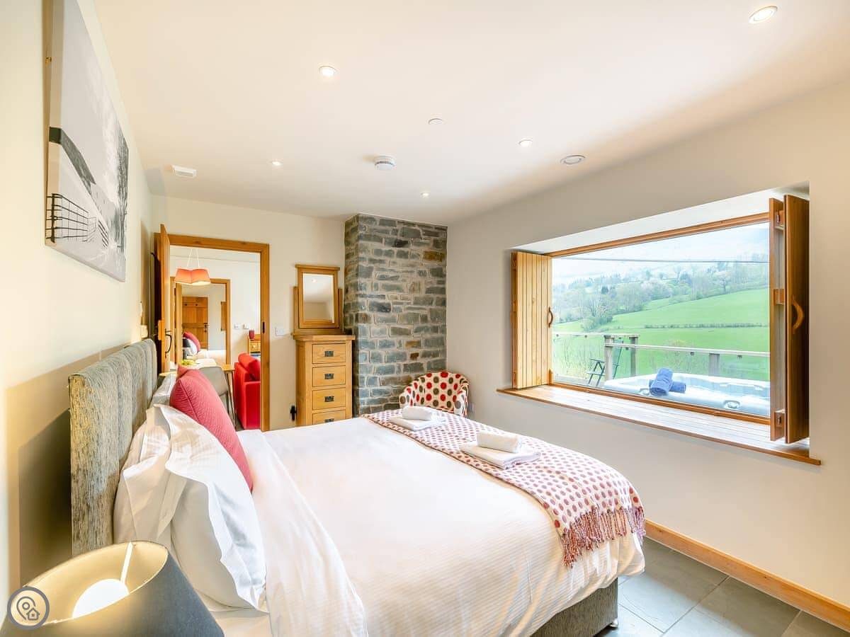 It sleeps four. Two bedrooms, both with their own bathrooms. It's got a 5 Star rating, which shows in the finish. Things like underfloor heating, a wood burner, good beds. There's a hot tub on the patio. The stairs are fine, not too steep.