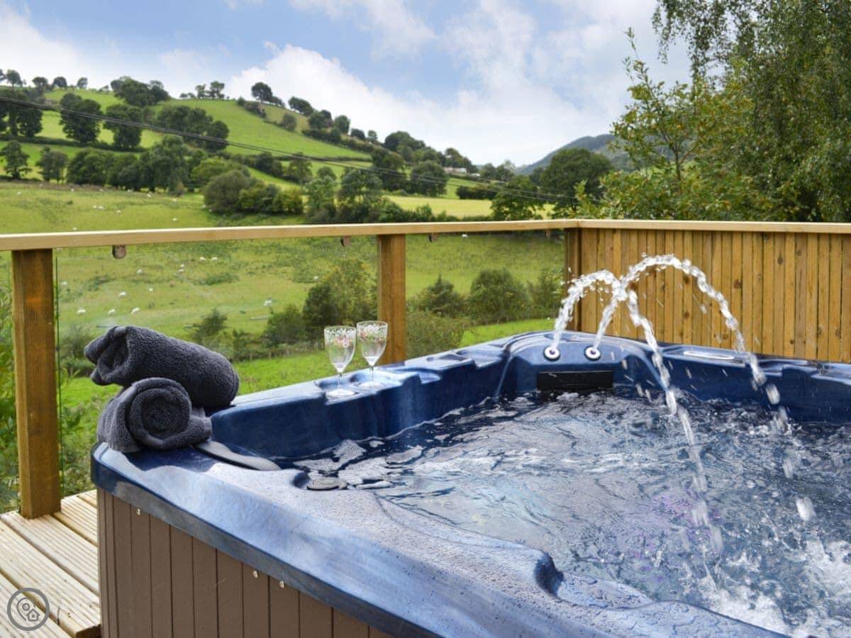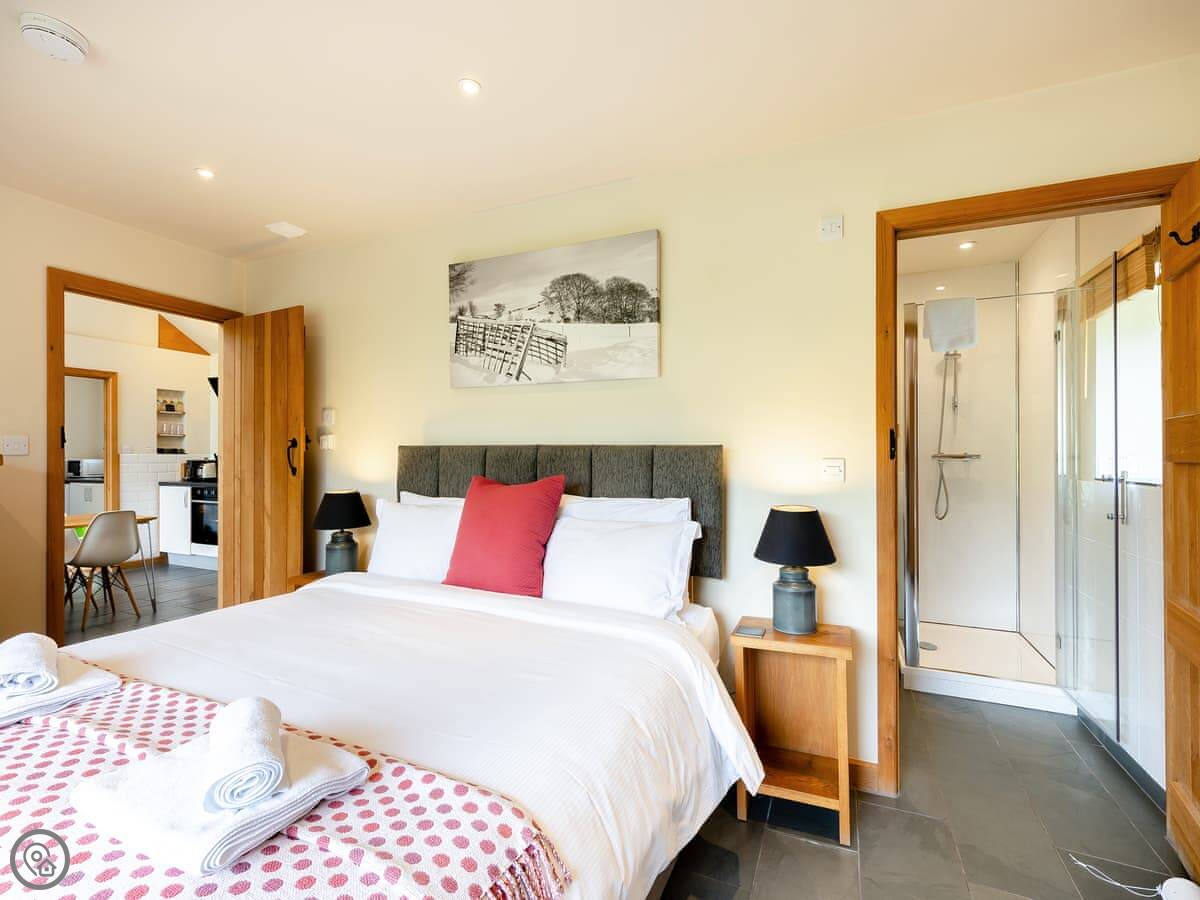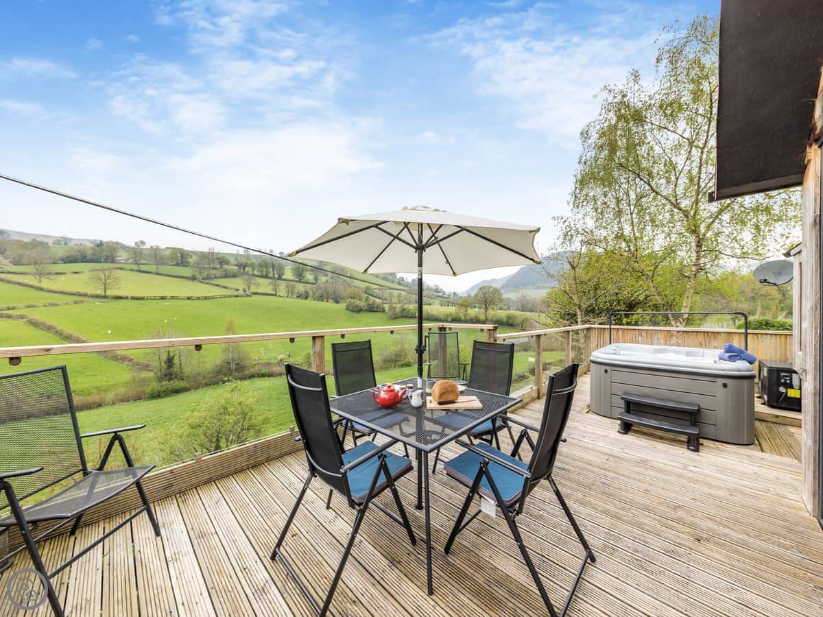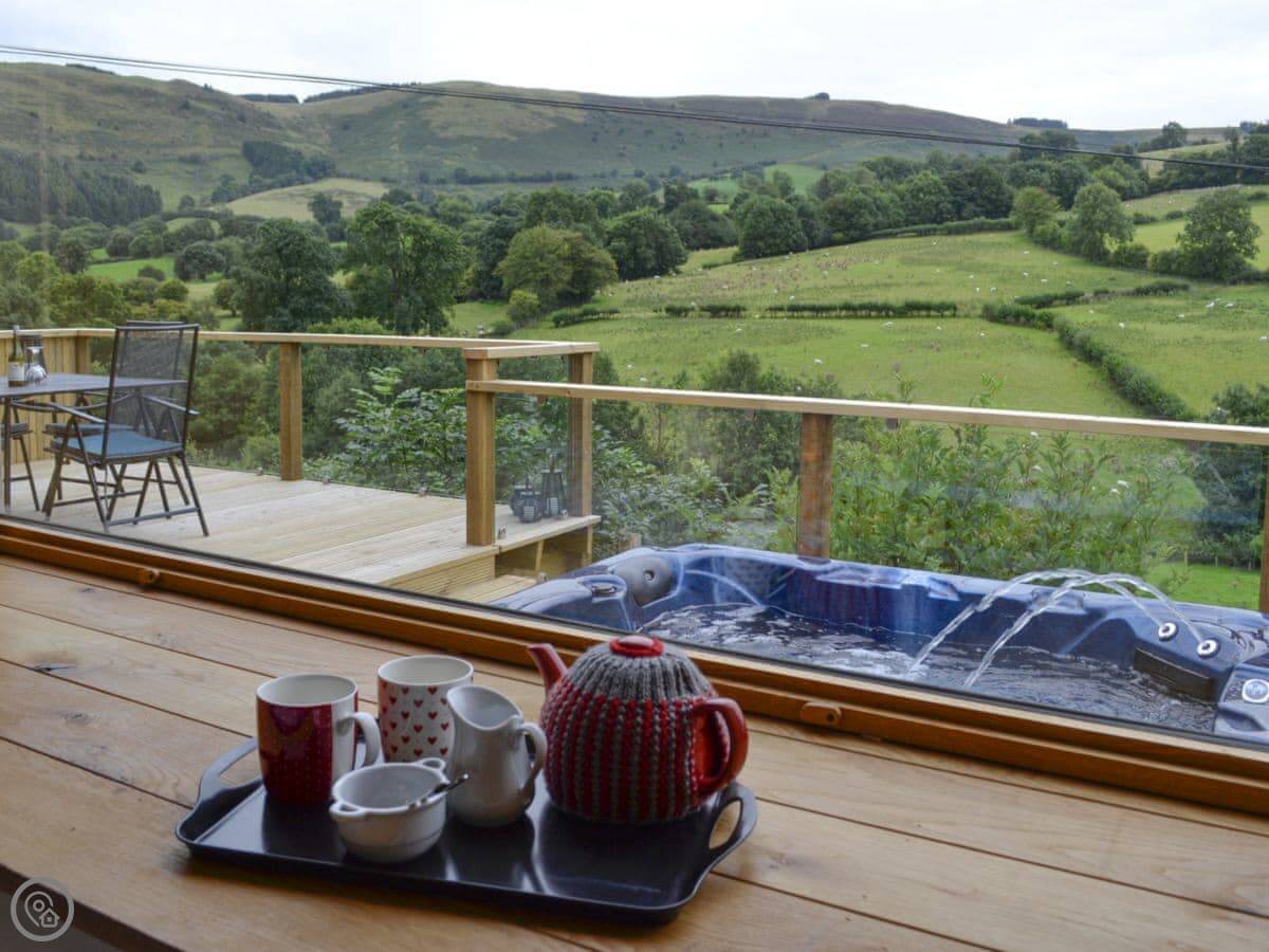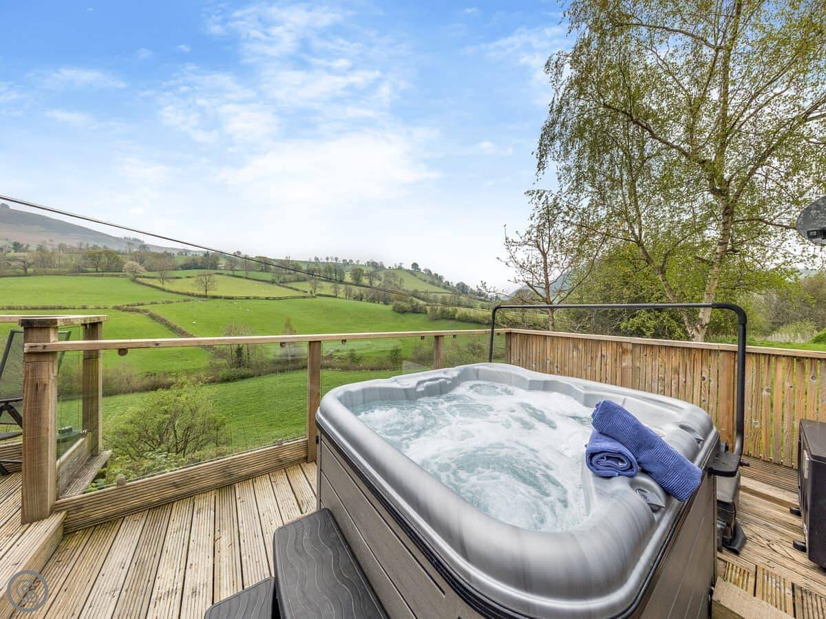 It sleeps four. Two bedrooms, both with their own bathrooms. It's got a 5 Star rating, which shows in the finish. Things like underfloor heating, a wood burner, good beds. There's a hot tub on the patio. The stairs are fine, not too steep.
