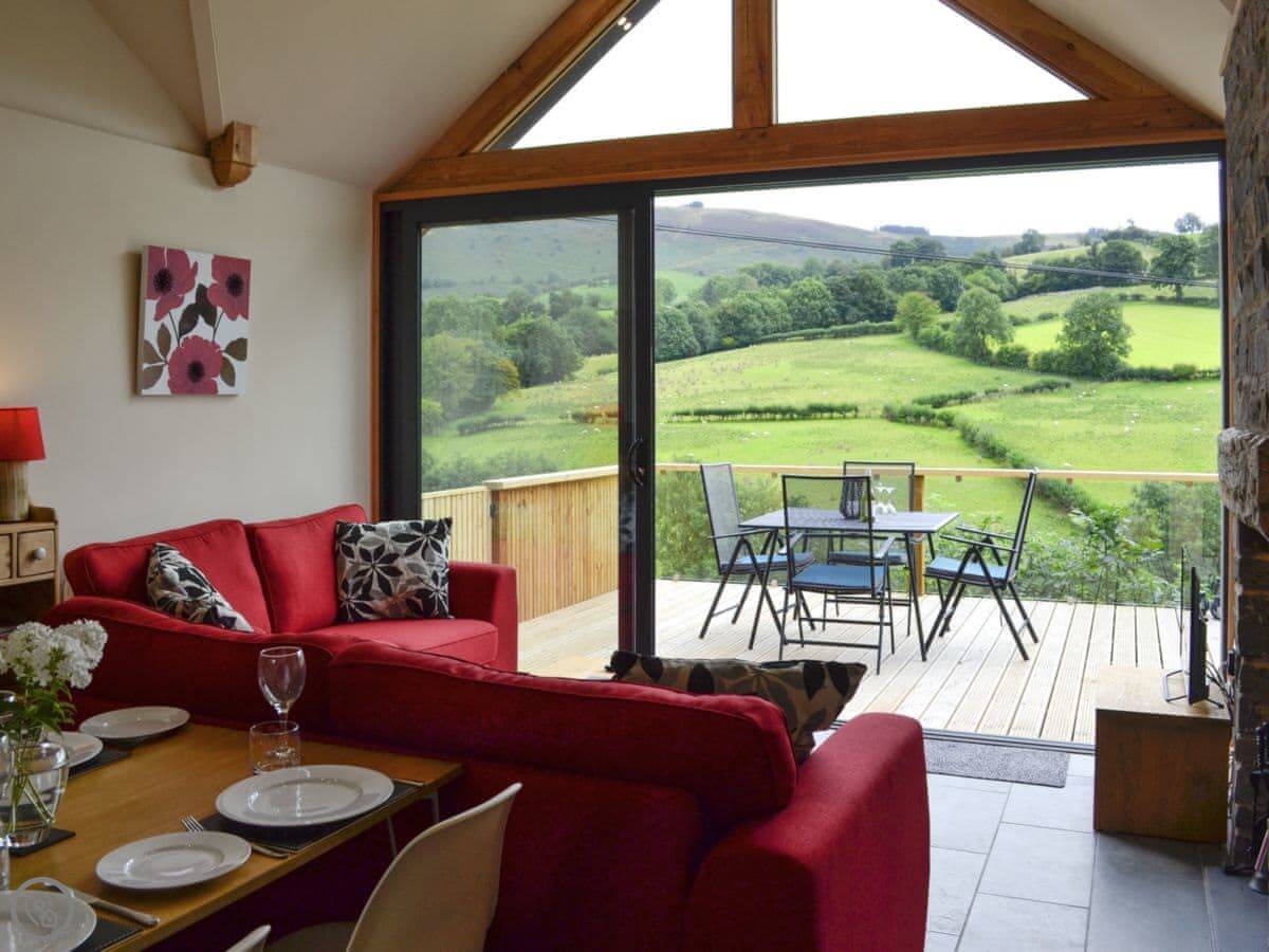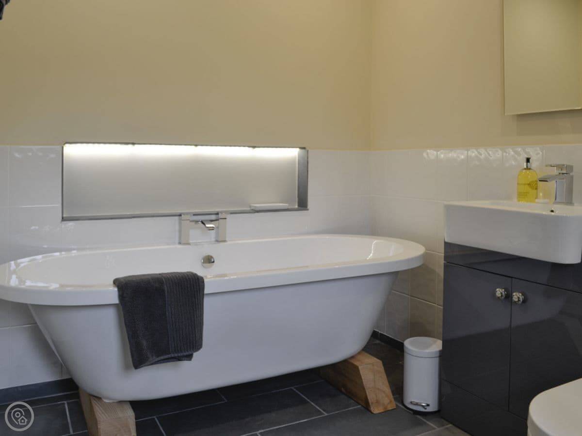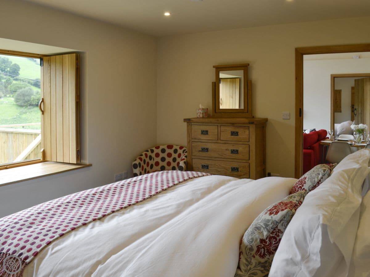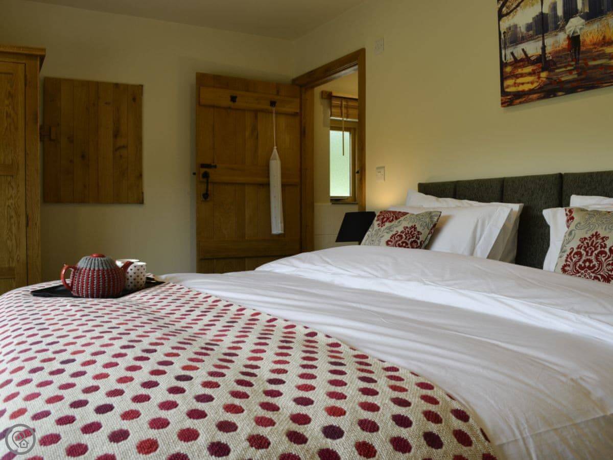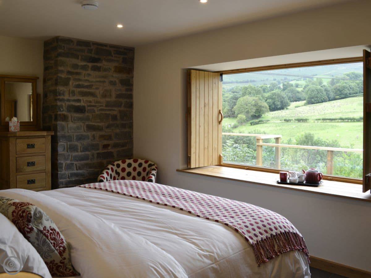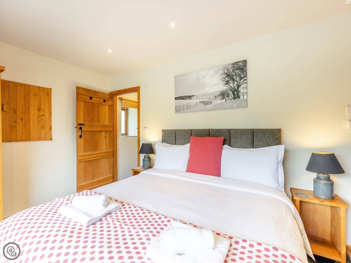 It sleeps four. Two bedrooms, both with their own bathrooms. It's got a 5 Star rating, which shows in the finish. Things like underfloor heating, a wood burner, good beds. There's a hot tub on the patio. The stairs are fine, not too steep.