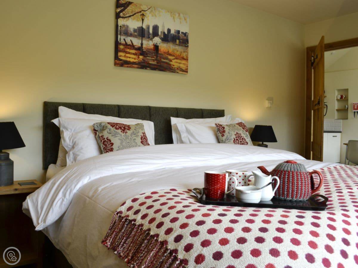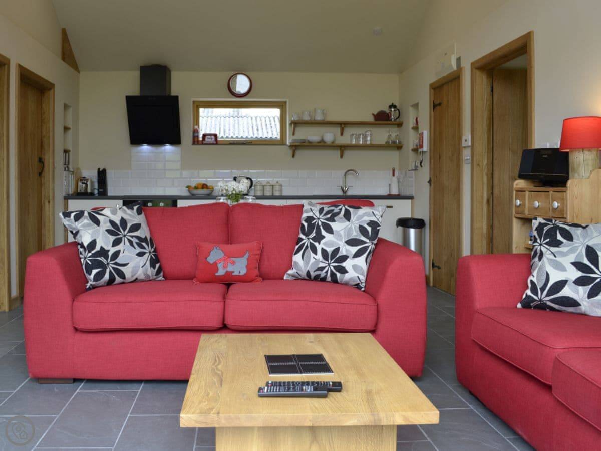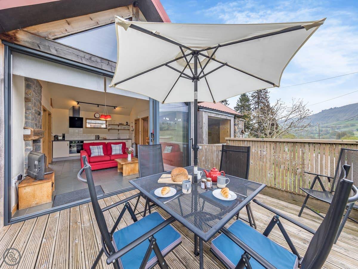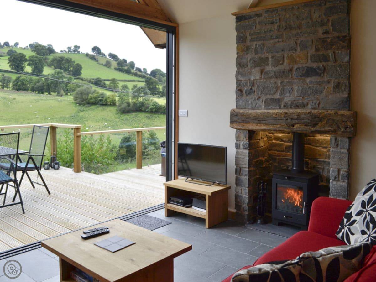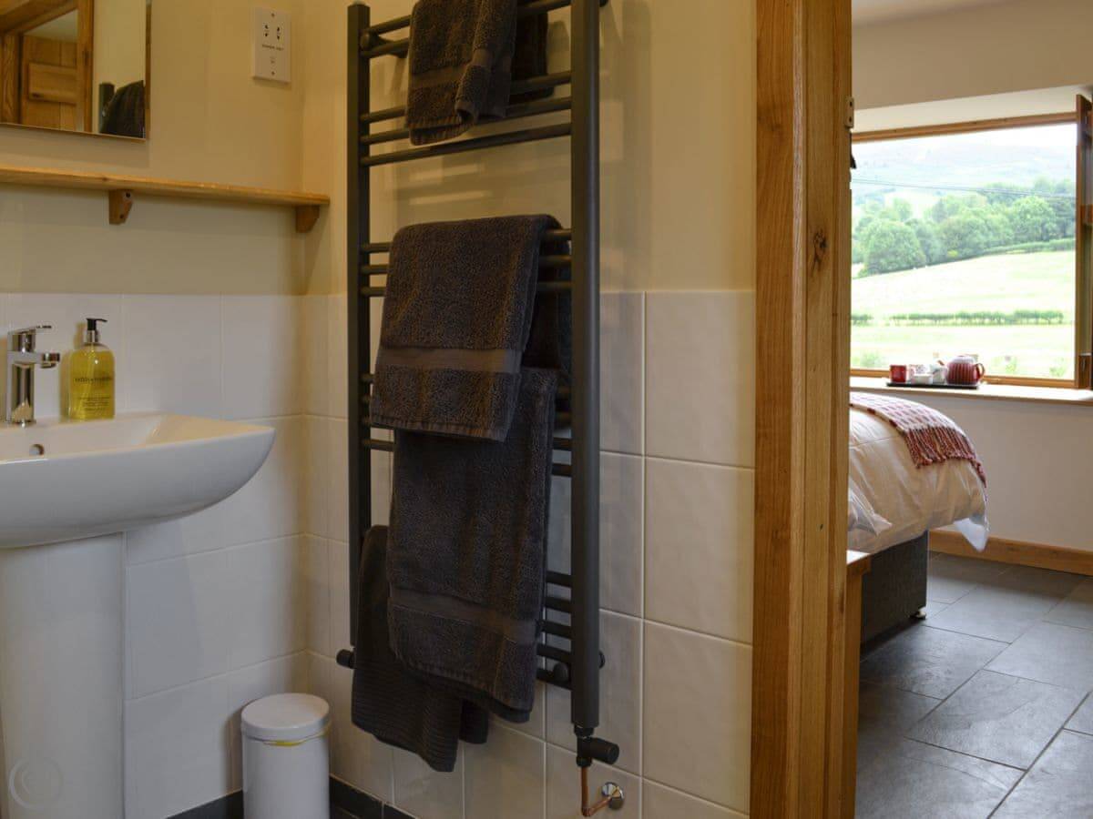 It sleeps four. Two bedrooms, both with their own bathrooms. It's got a 5 Star rating, which shows in the finish. Things like underfloor heating, a wood burner, good beds. There's a hot tub on the patio. The stairs are fine, not too steep.