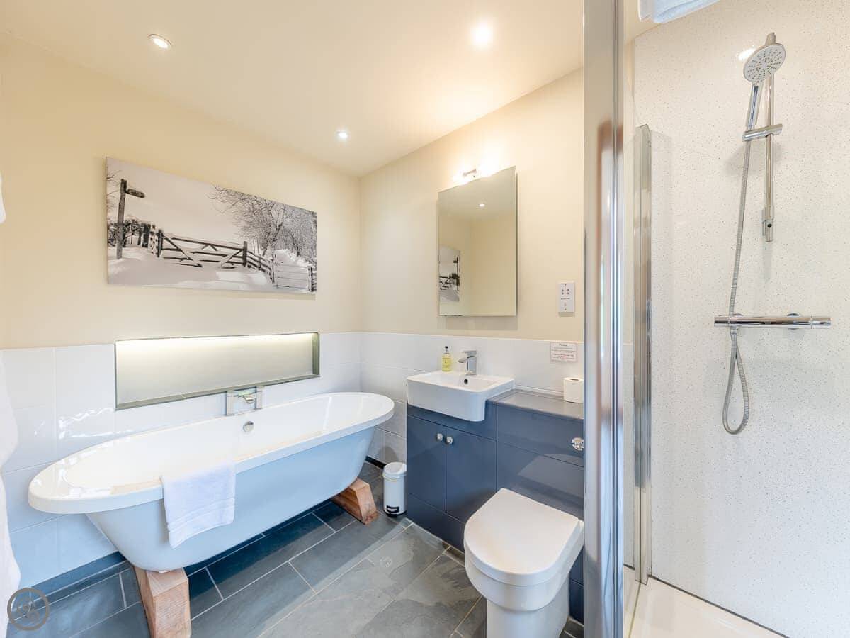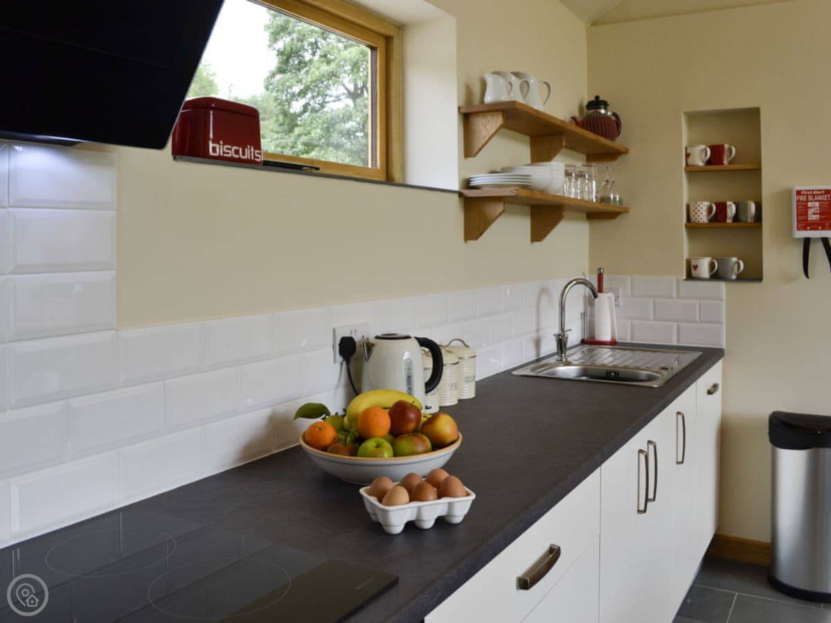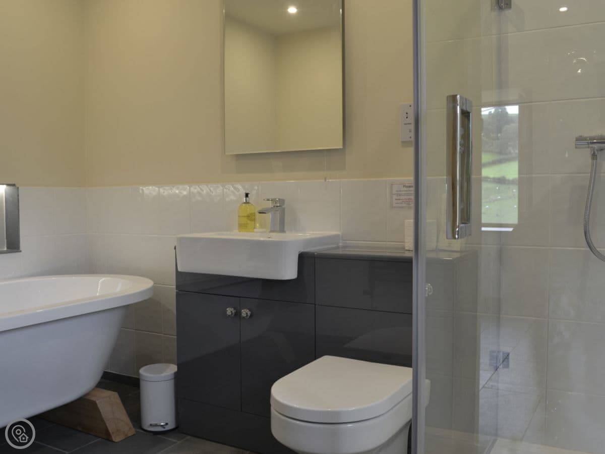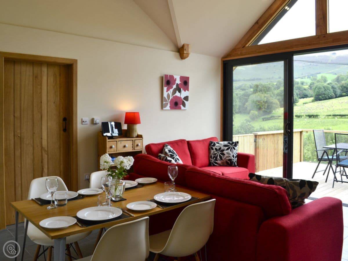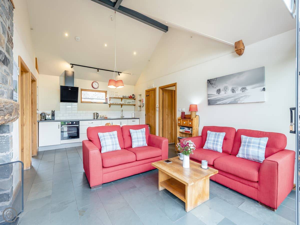 It sleeps four. Two bedrooms, both with their own bathrooms. It's got a 5 Star rating, which shows in the finish. Things like underfloor heating, a wood burner, good beds. There's a hot tub on the patio. The stairs are fine, not too steep.