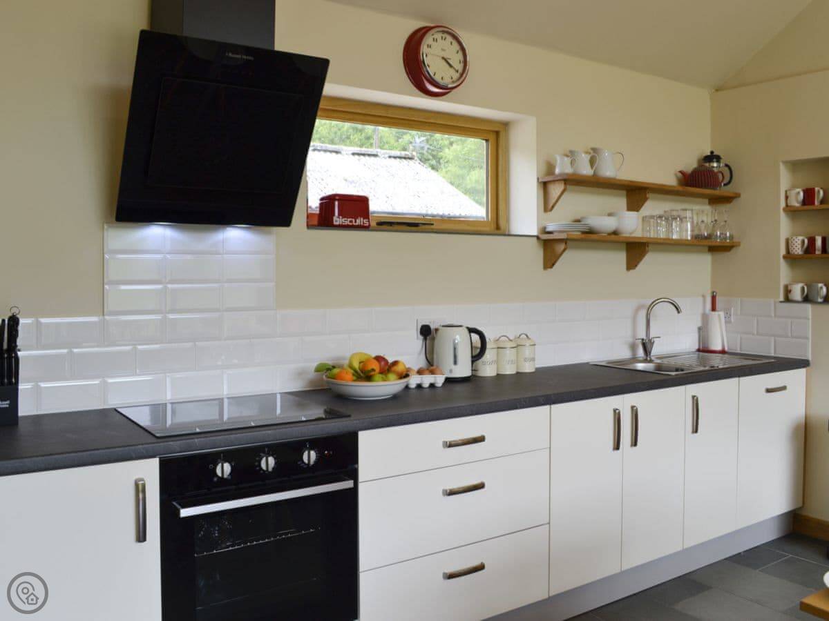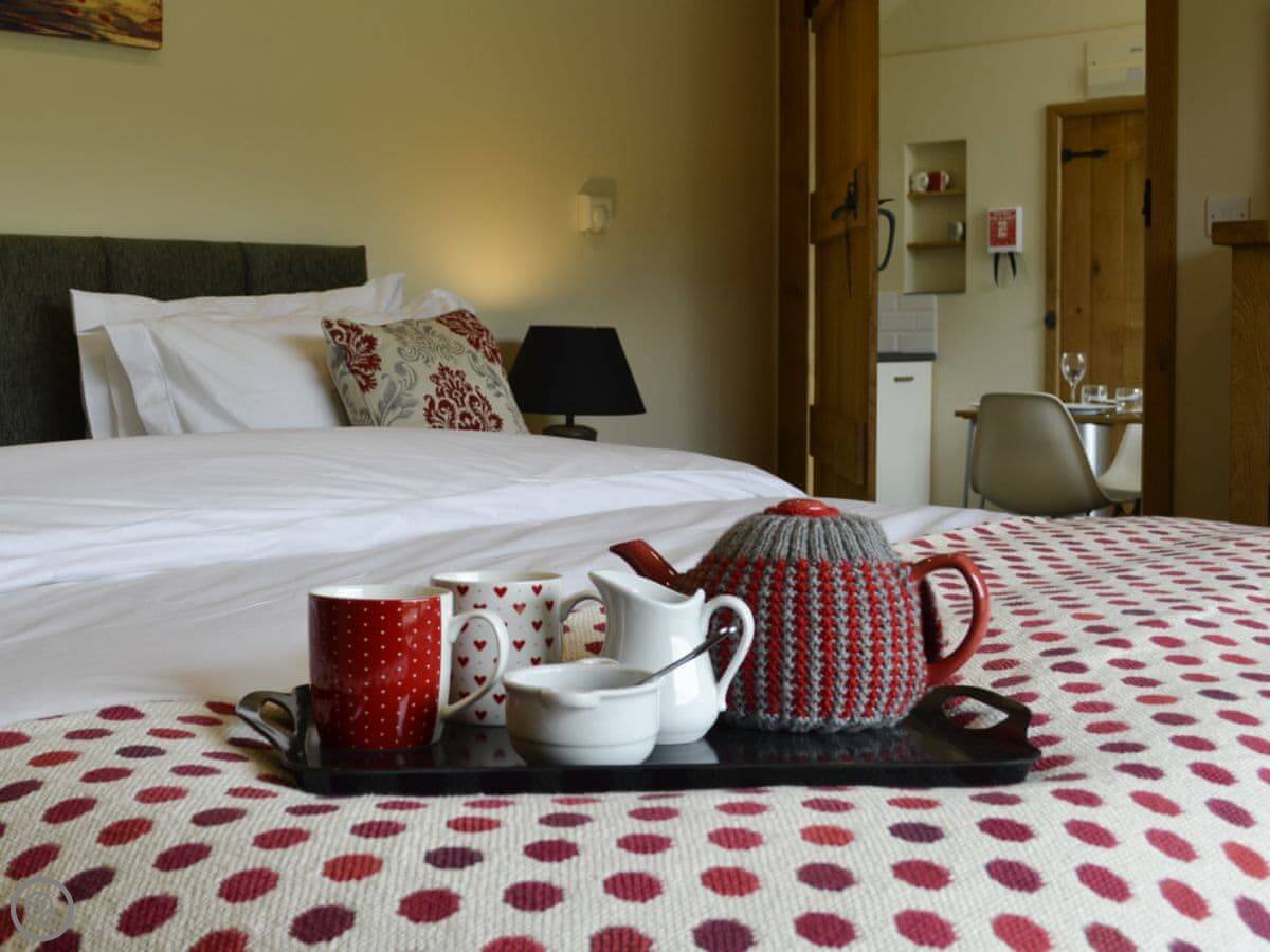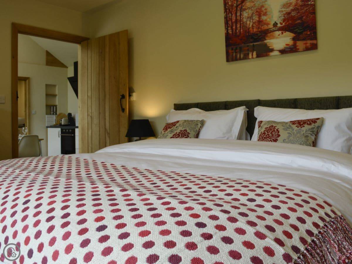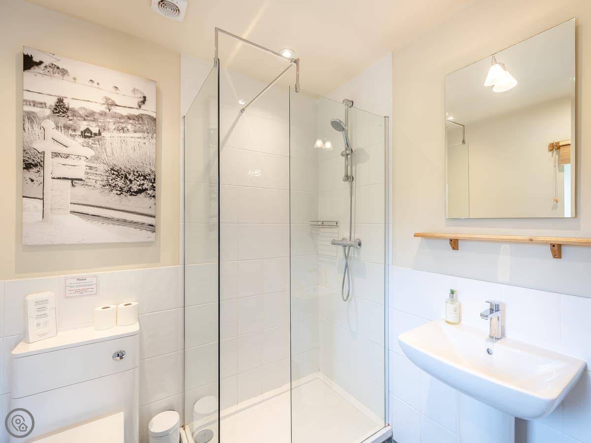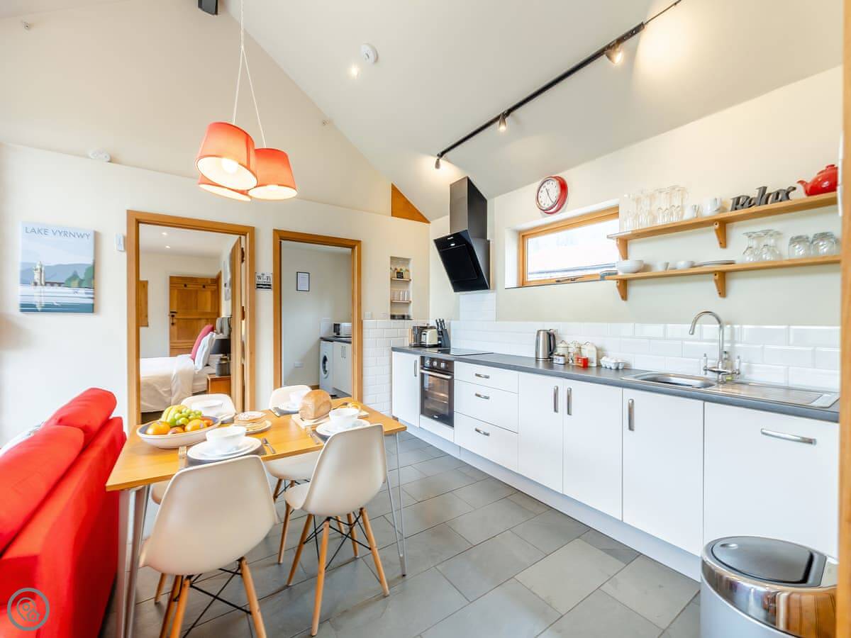 It sleeps four. Two bedrooms, both with their own bathrooms. It's got a 5 Star rating, which shows in the finish. Things like underfloor heating, a wood burner, good beds. There's a hot tub on the patio. The stairs are fine, not too steep.