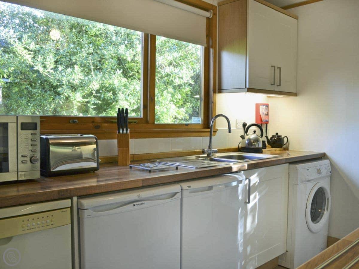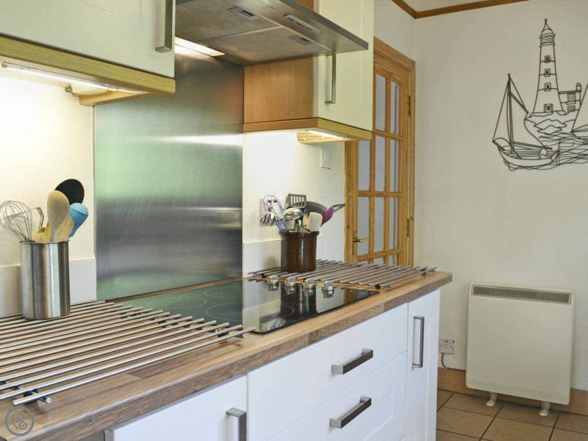 Inside, it’s straightforward. Comfortable beds, a well-equipped kitchen, a dining area, and the wood burner. There’s a TV, wifi, a washing machine, and a dishwasher. Bedding and towels are included. There’s a cot and highchair if you need them. Parking is on site.