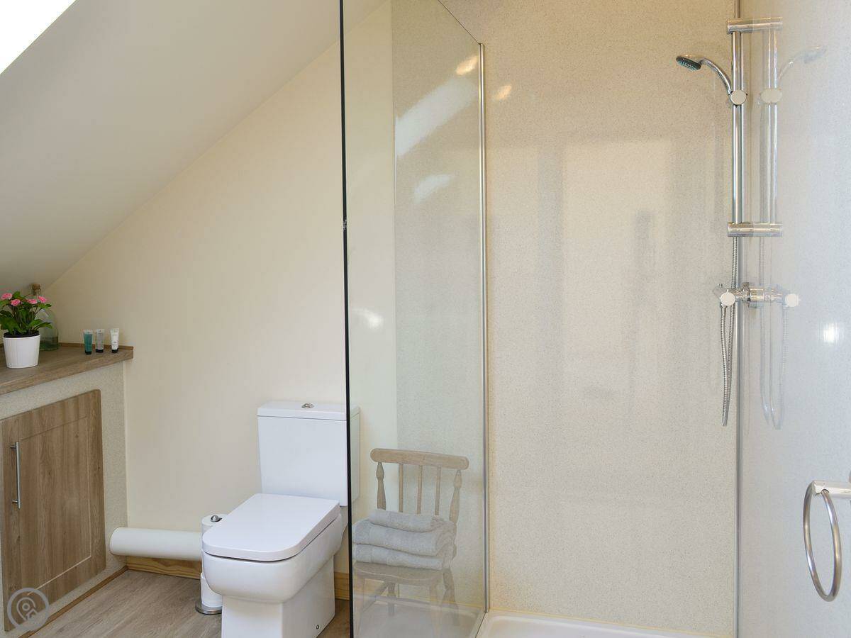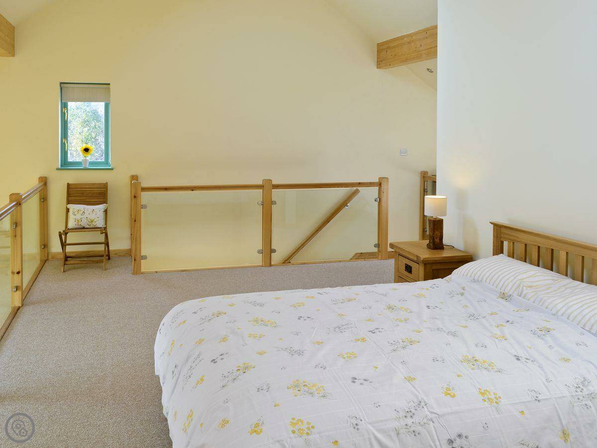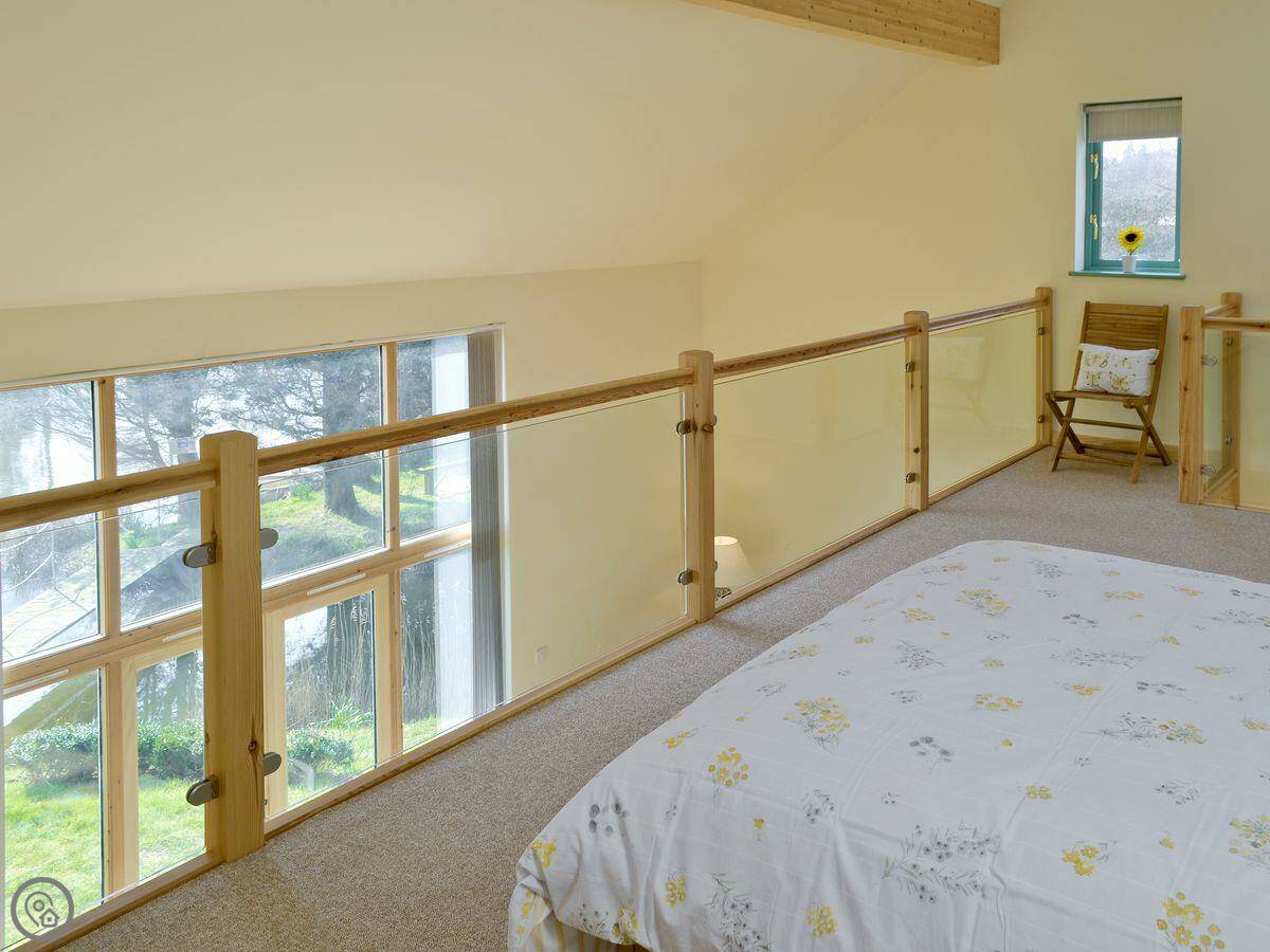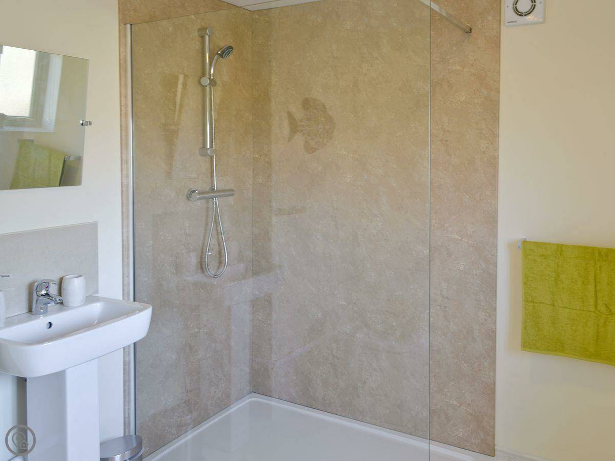 It sleeps two, in one bedroom. There are two bathrooms, both with a walk-in shower. It's got a 5 Star rating, which means it's well-equipped and modern. The whole site is about three acres, with two fishing lakes. You're welcome to walk around them. You can fish if you want, it's by invitation only so it's never crowded. There's a shed to put your gear in.
