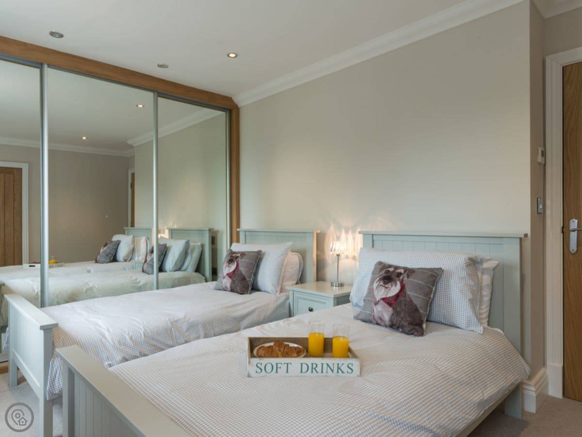 It sleeps six. All three bedrooms have their own bathrooms, which is handy. There's one parking space on the gravel drive behind the house.
