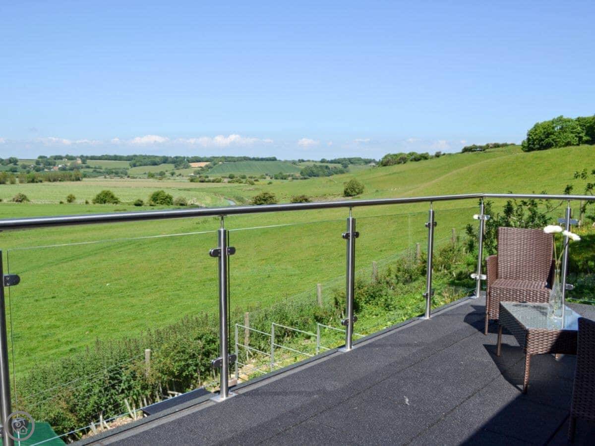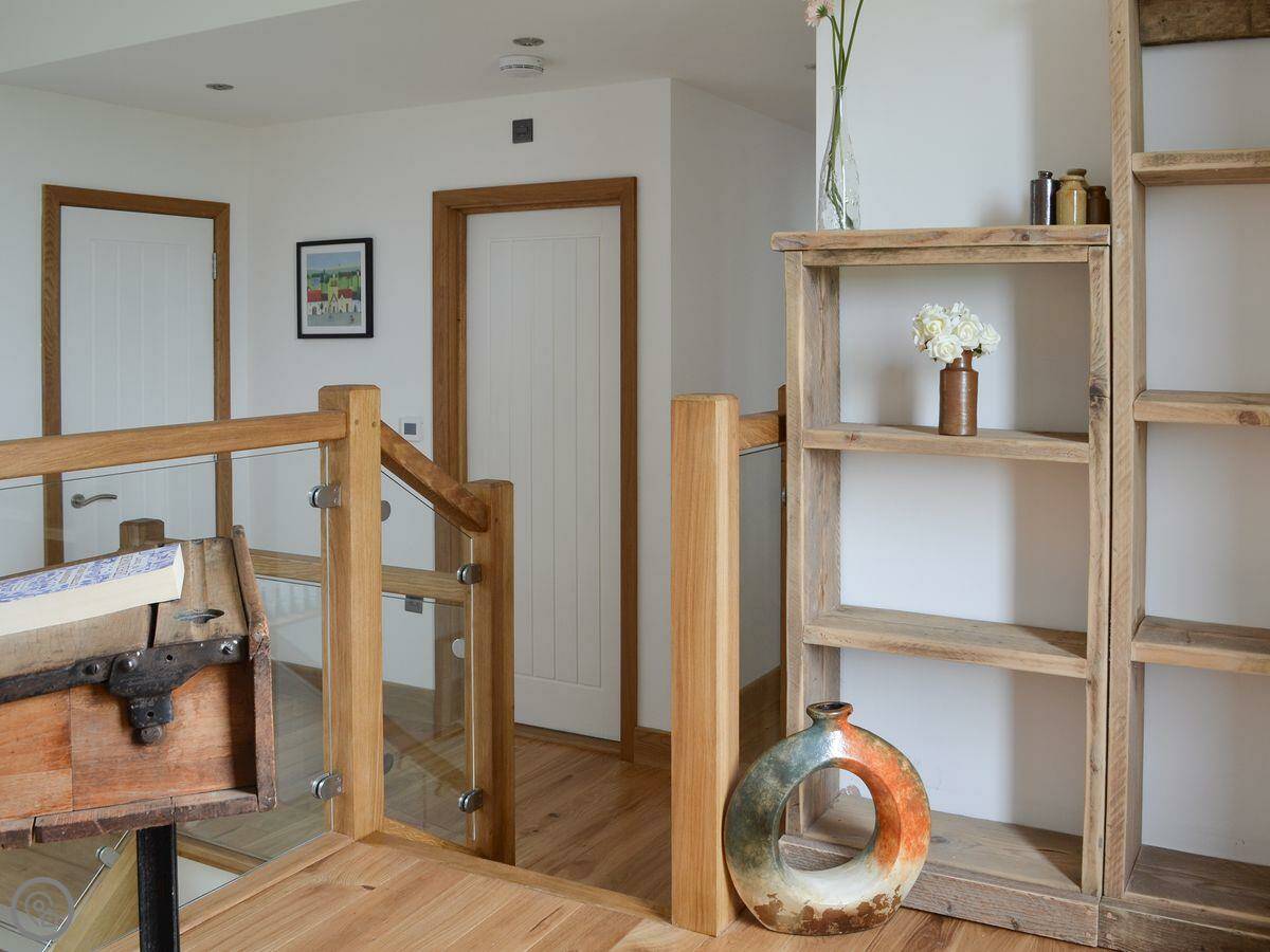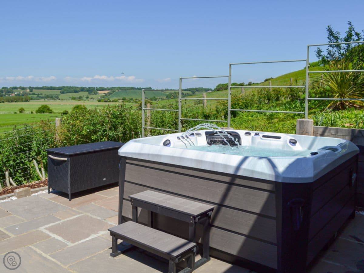 There’s a wood burner for the evenings. The stairs go up to a galleried landing, which leads out to a small balcony. The view from up there is good, especially at sunset. The terrace has a hot tub.