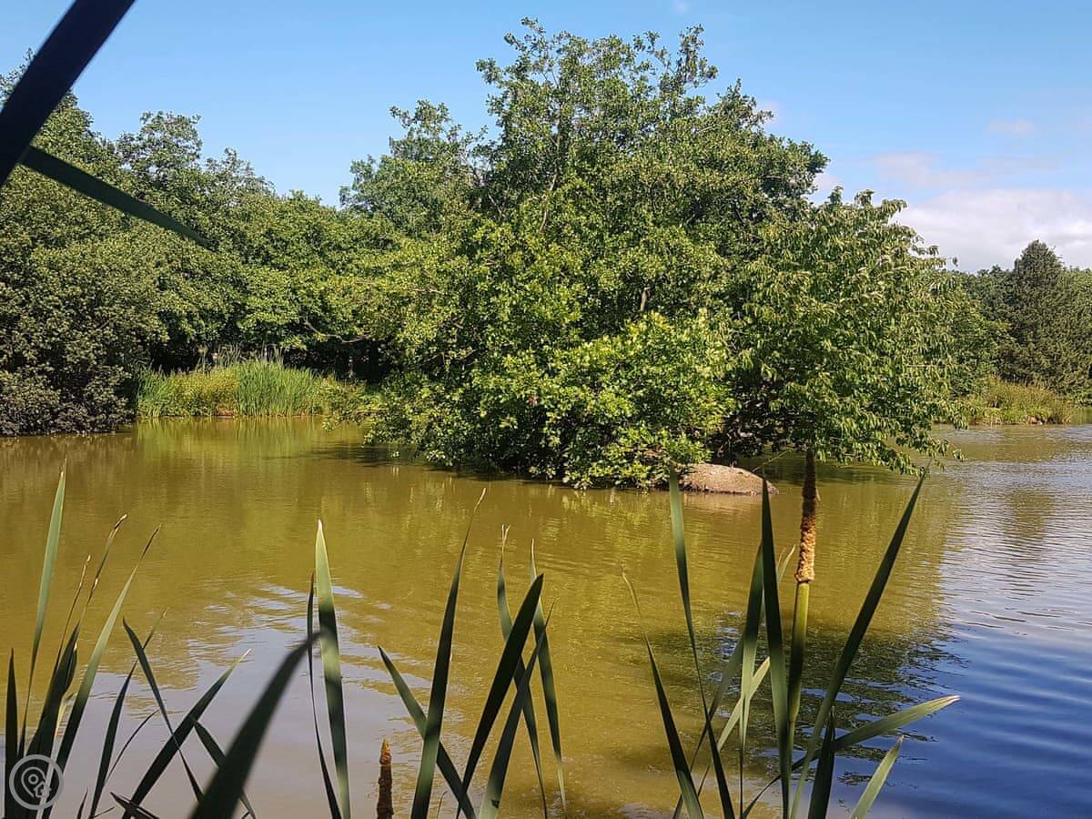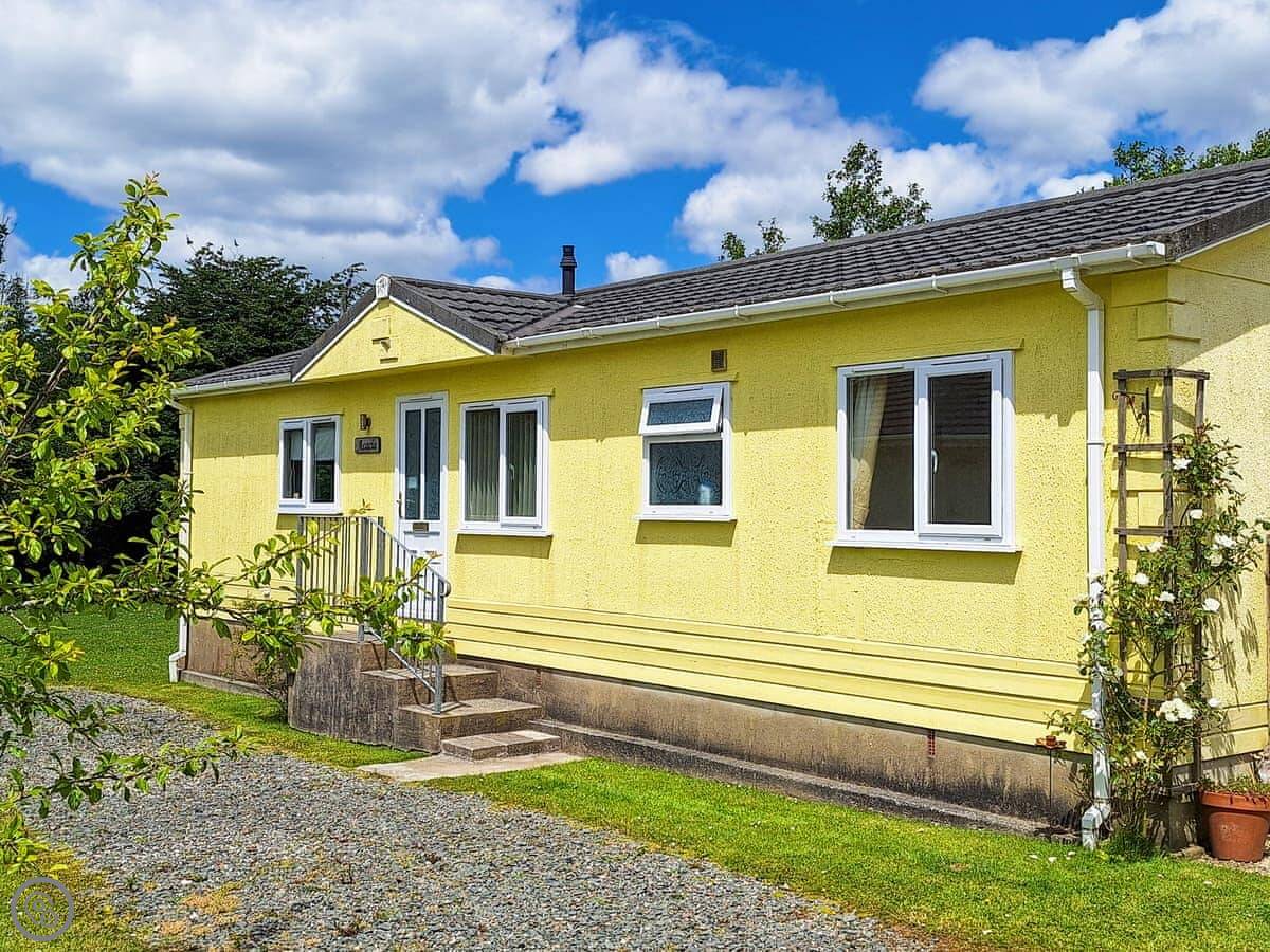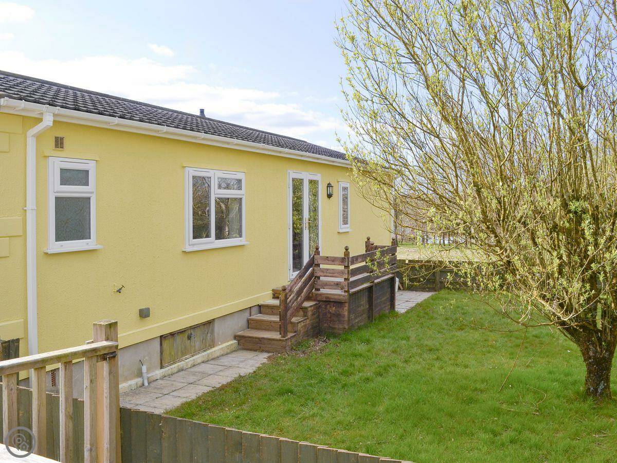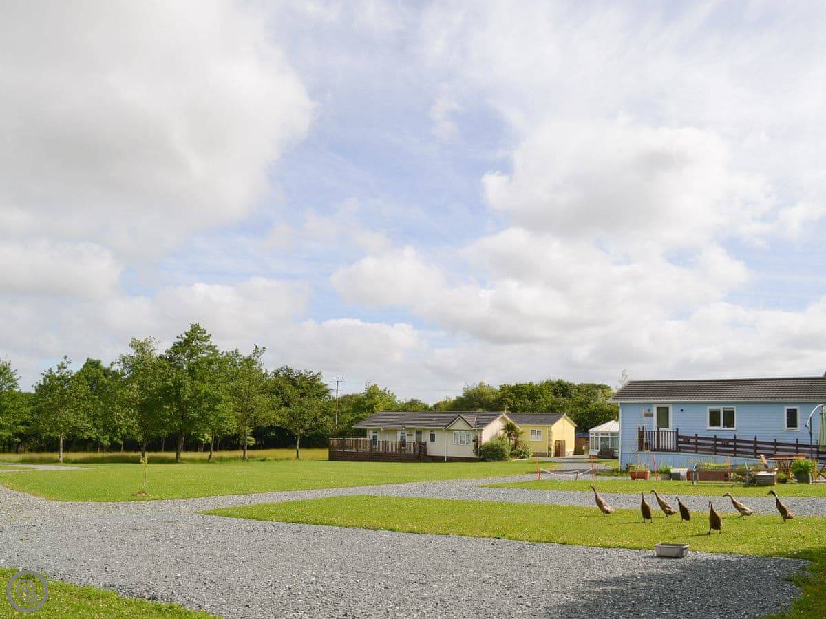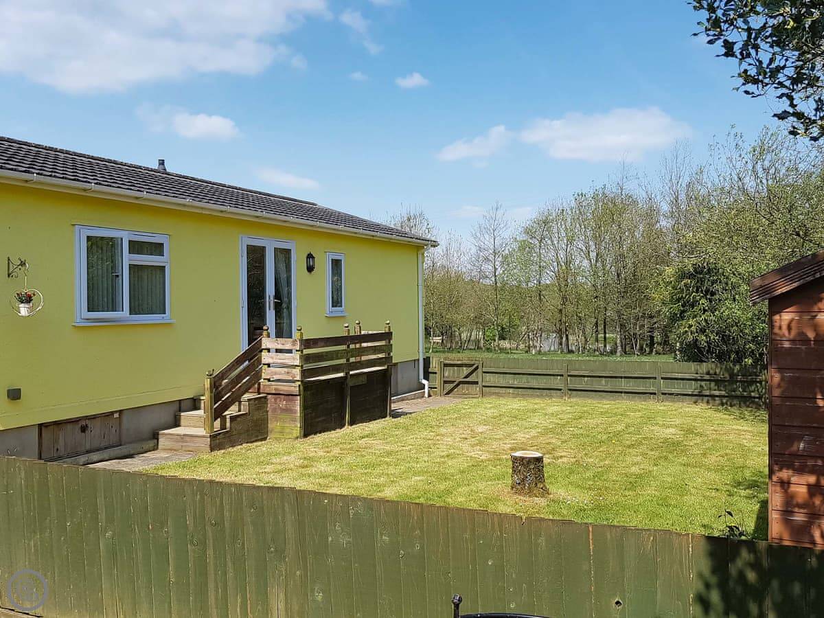 This is Acacia. It's a detached lodge on Thornbury Holiday Park, near Woodacott in Devon. It looks out over one of the fishing lakes here.