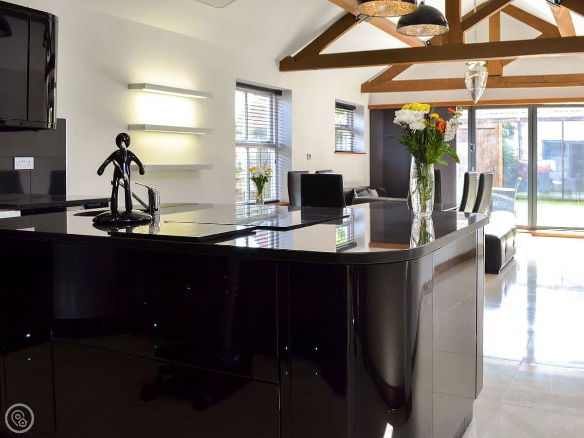 It's modern inside. Open plan kitchen and living area with those big folding doors that open onto a small, enclosed garden. There's a wood burner. Floors are tiled. It's very clean and new.