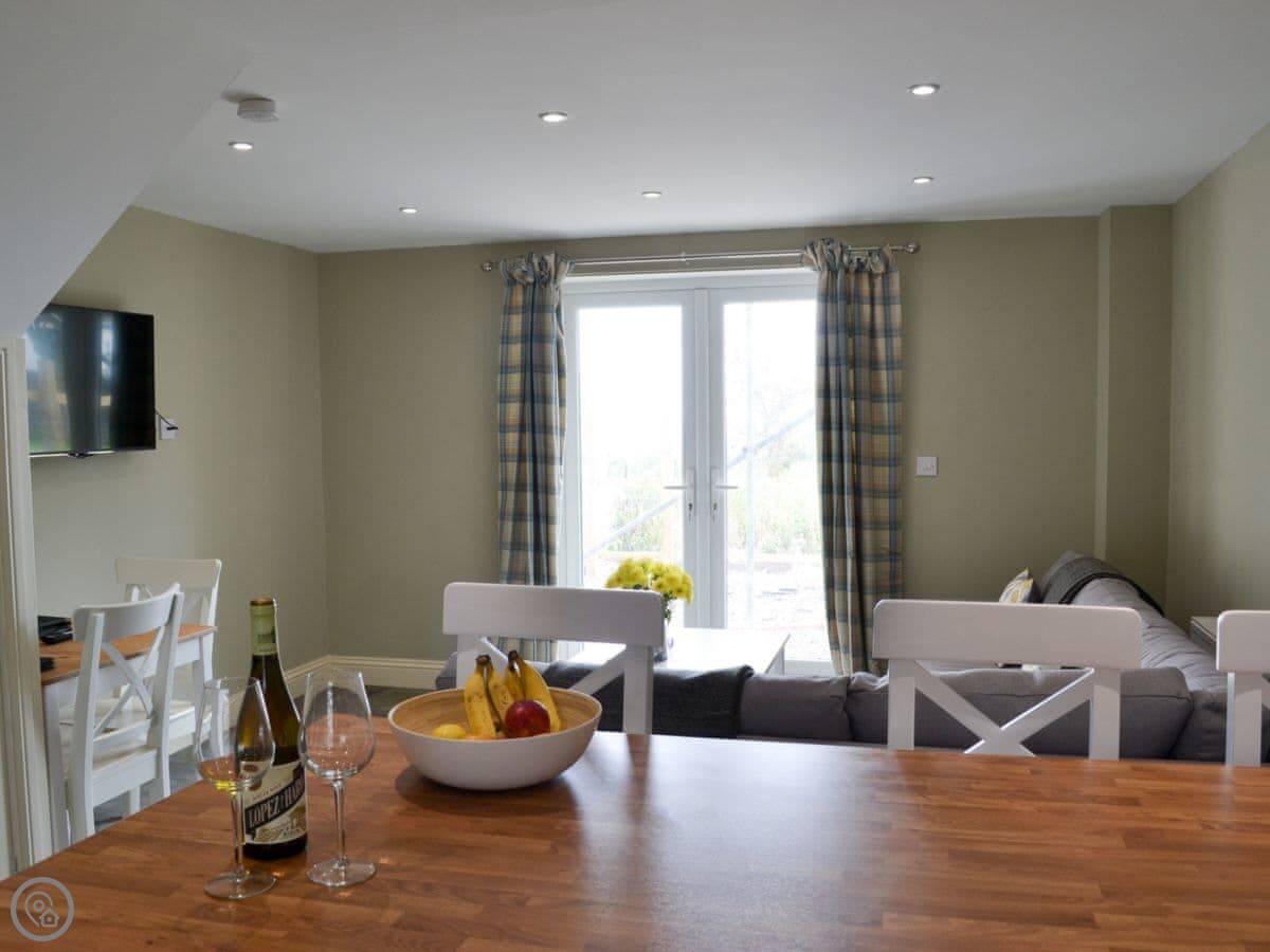 It sleeps three. There are two bedrooms and two bathrooms, which is handy. It's got a 4 Star rating. It's comfortable and well looked after. The main living area is open plan, with French doors. There's a wood burner for cooler evenings.