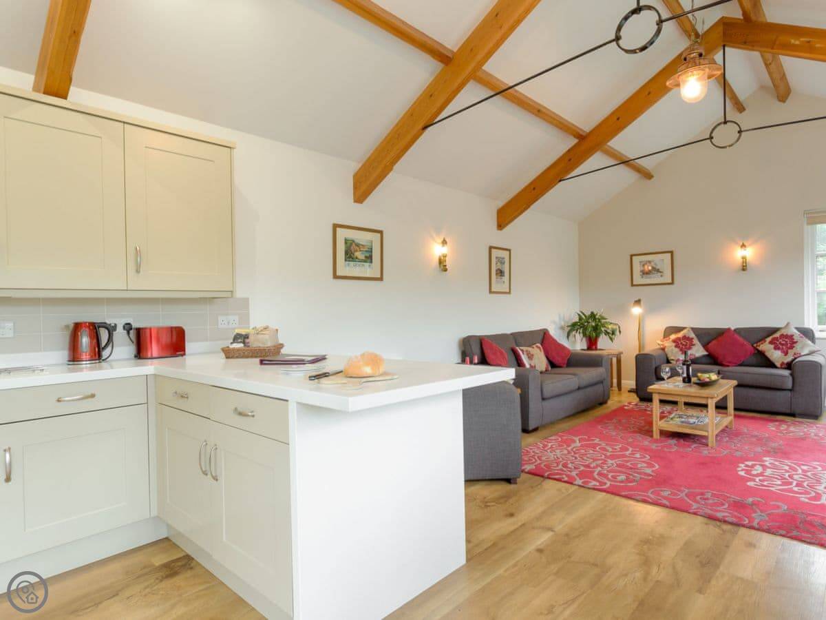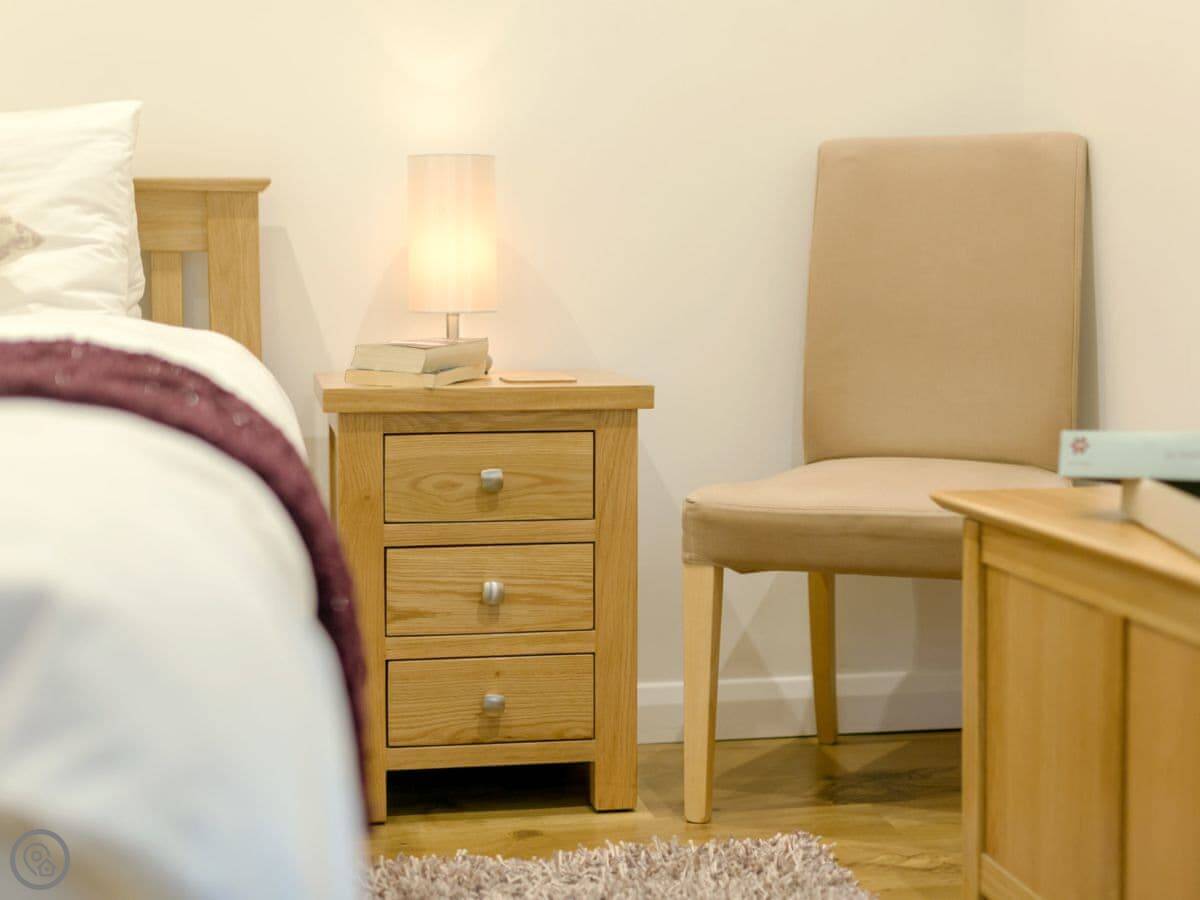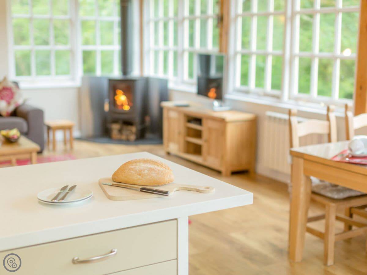 It sleeps three people. Two bedrooms and one bathroom downstairs. It's a 5 Star place, so it's well finished and comfortable. The layout is upside down. The living area, kitchen and dining space are all open-plan upstairs. That's where you get the best views. There's a wood burner for cooler evenings. A spiral staircase takes you downstairs to the bedrooms and shower room. It's a proper spiral staircase, so you need to be careful on it.
