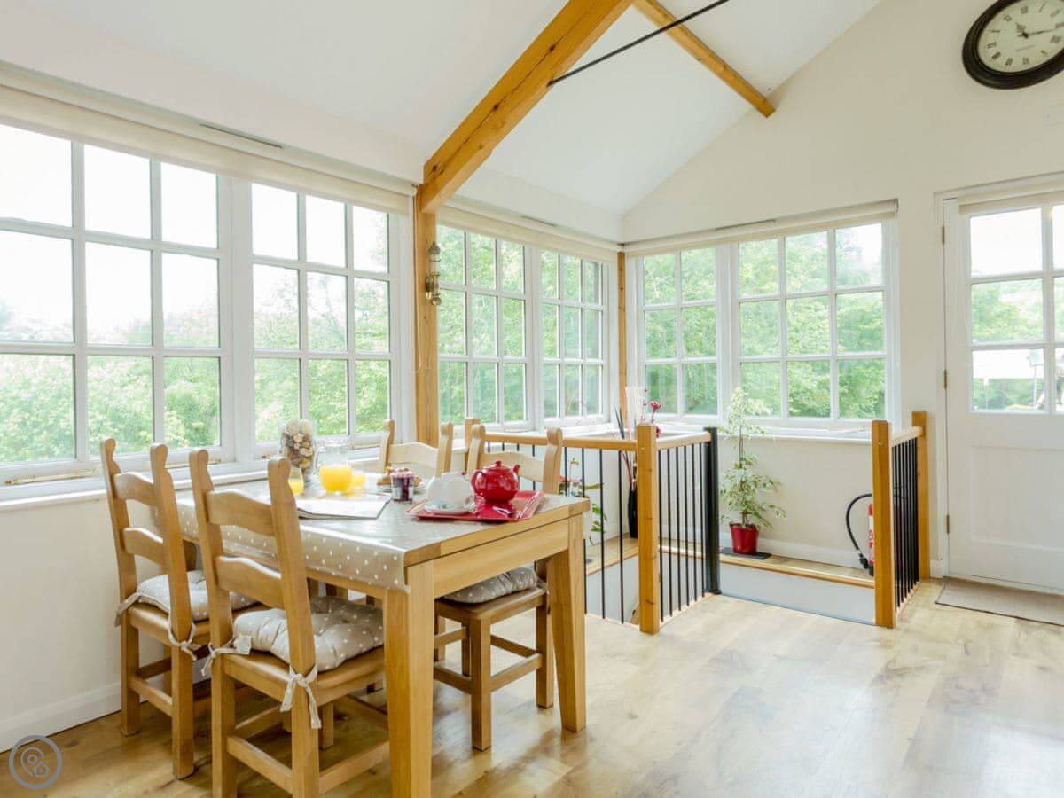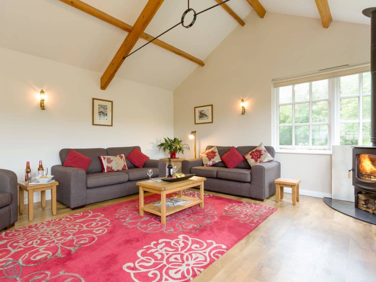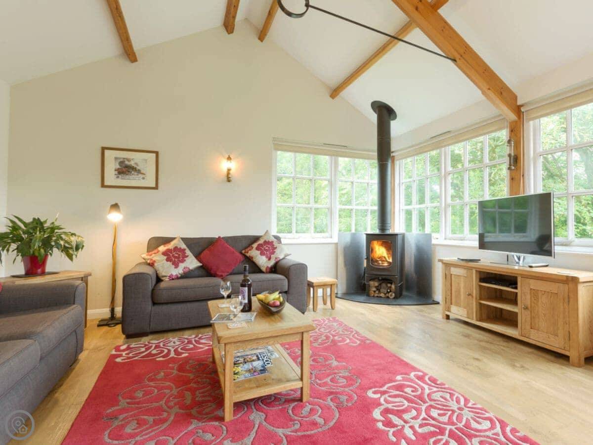 It sleeps three people. Two bedrooms and one bathroom downstairs. It's a 5 Star place, so it's well finished and comfortable. The layout is upside down. The living area, kitchen and dining space are all open-plan upstairs. That's where you get the best views. There's a wood burner for cooler evenings. A spiral staircase takes you downstairs to the bedrooms and shower room. It's a proper spiral staircase, so you need to be careful on it.