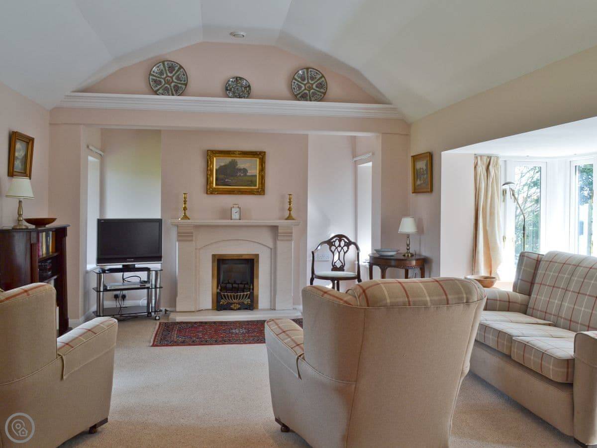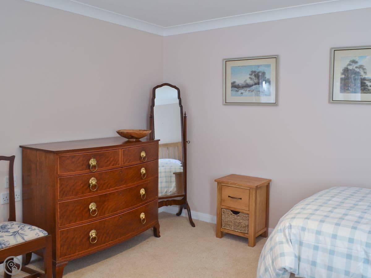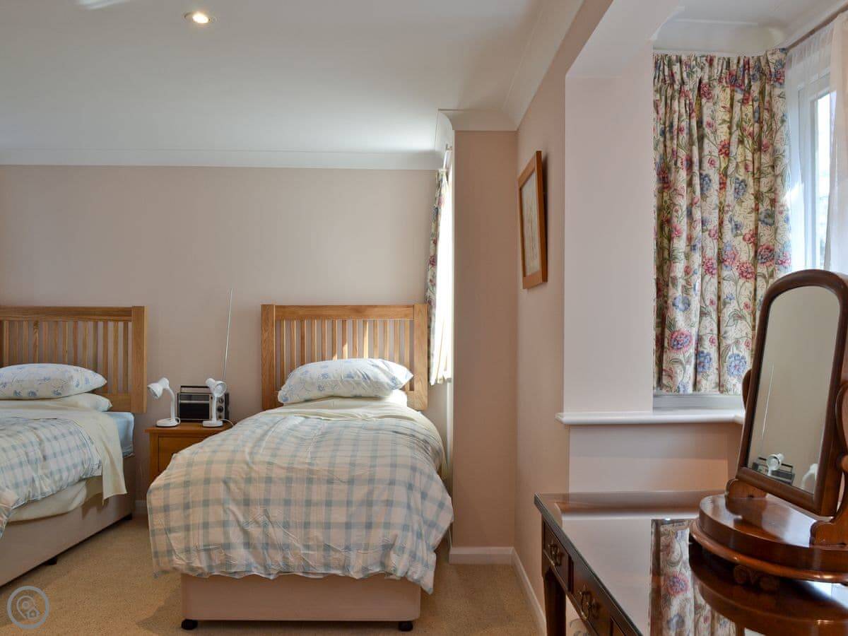 It sleeps four. Two bedrooms, both downstairs, and each has its own bathroom. One has a wet room which is good if you have mobility issues. It's got a 4 Star rating. It's comfortable. It's an upside-down house, so you live upstairs. That's because the views are better from there. You can see the fields and Arundel Castle in the distance.