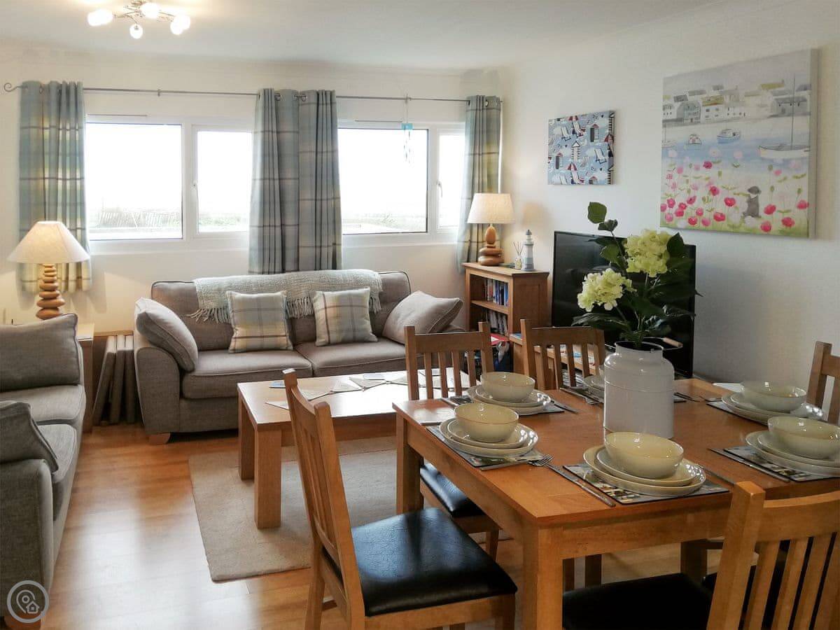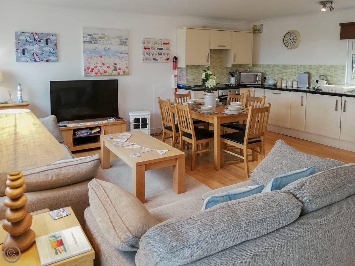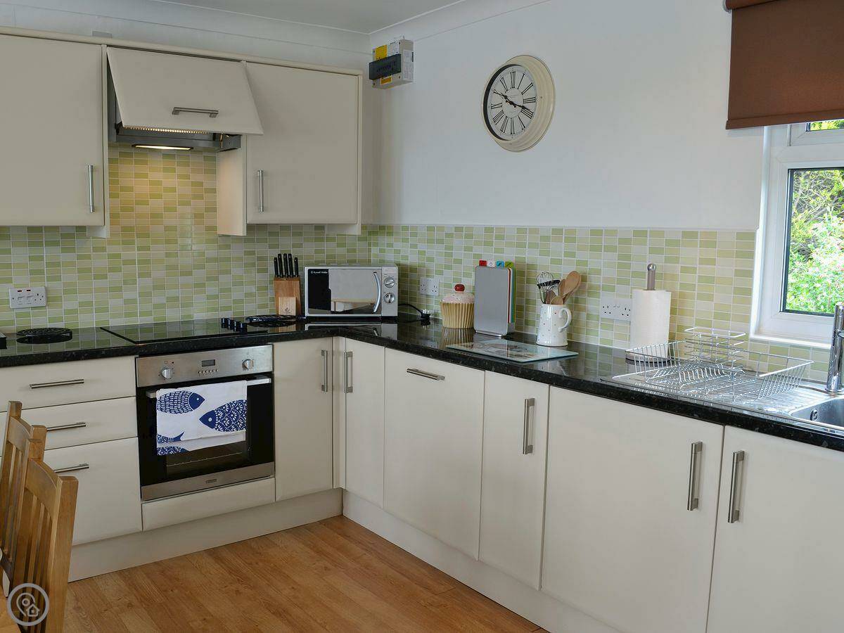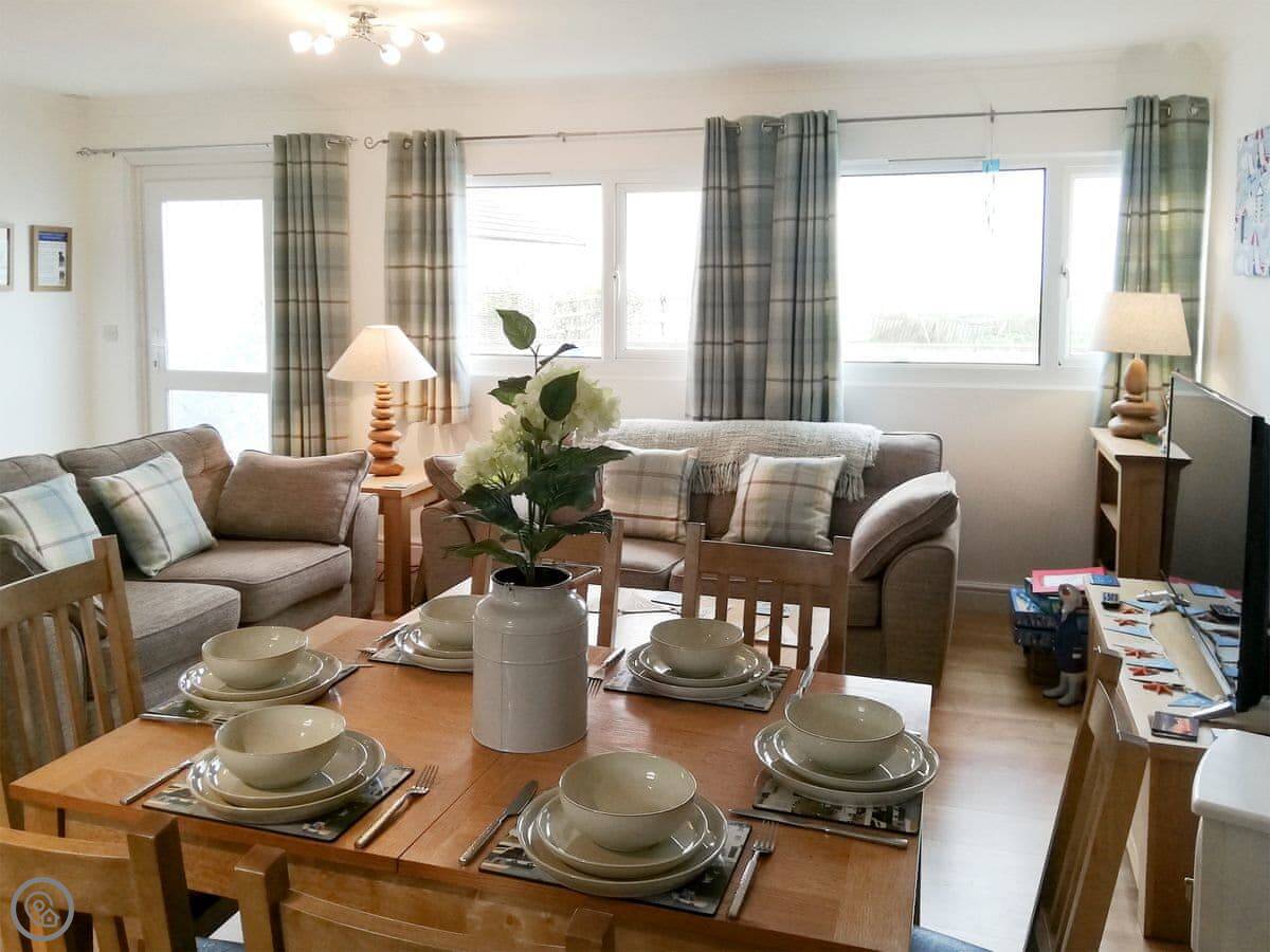 The place is light inside. There's an open plan living area. You've got a washing machine and a dishwasher. Bedding is included, and we can provide a cot and highchair. There's a patio and garden to use, and parking right outside.