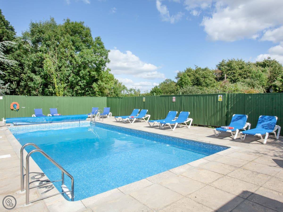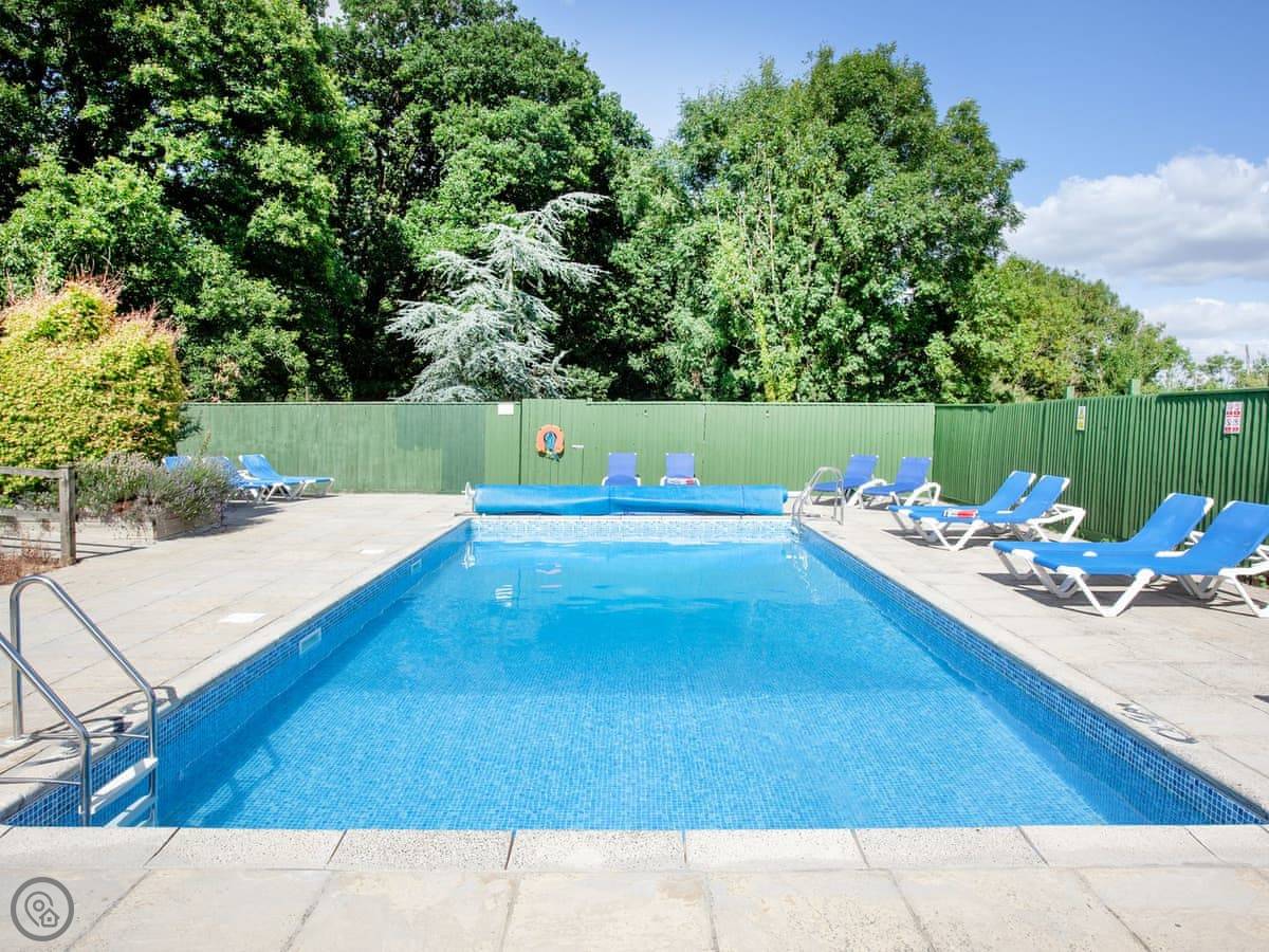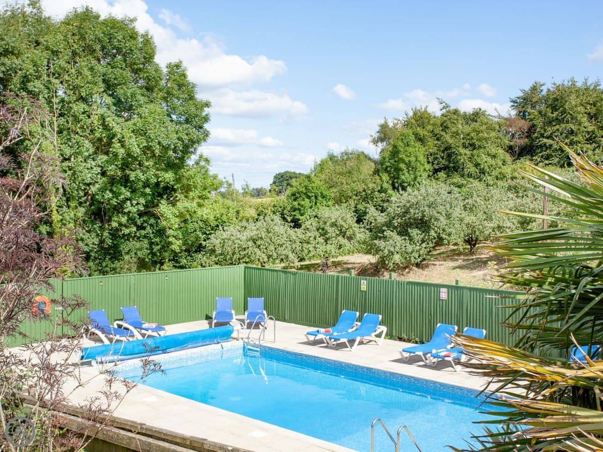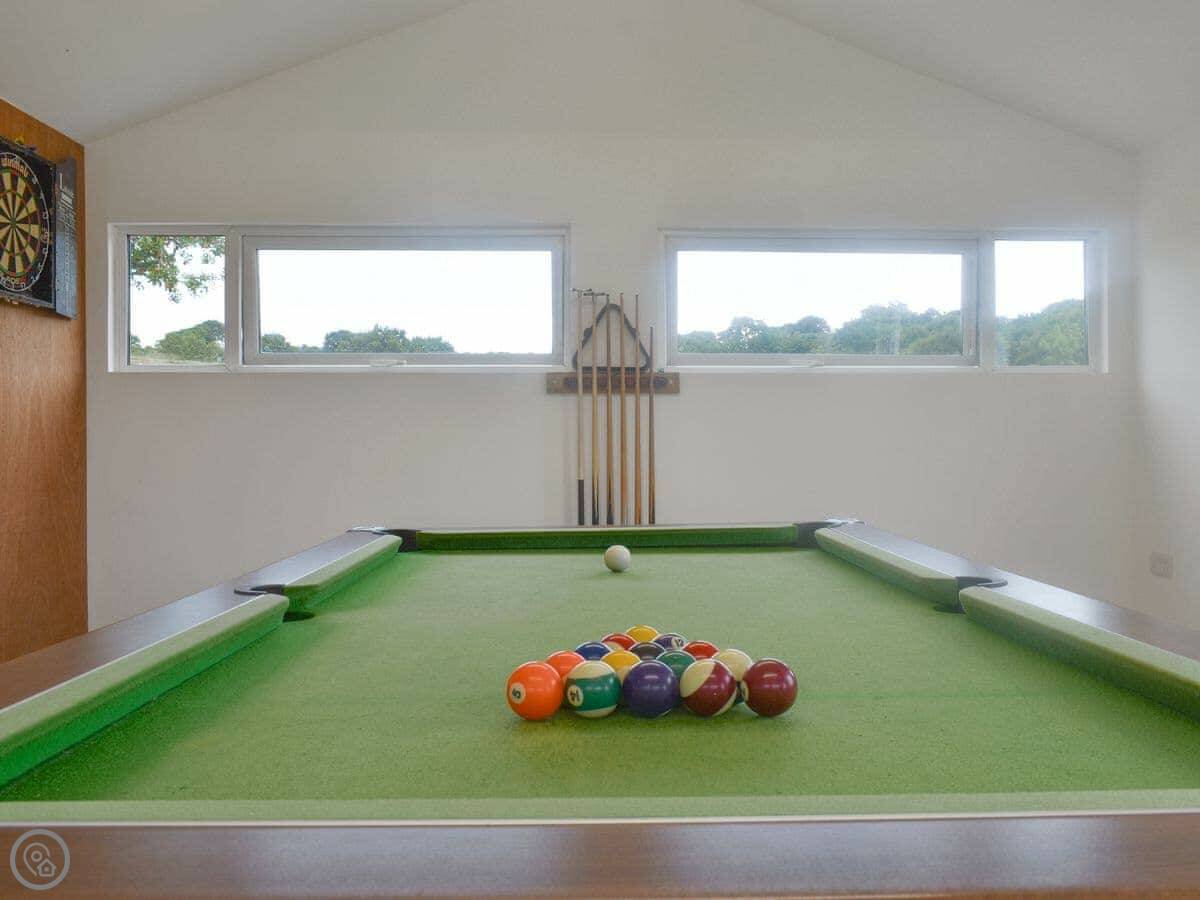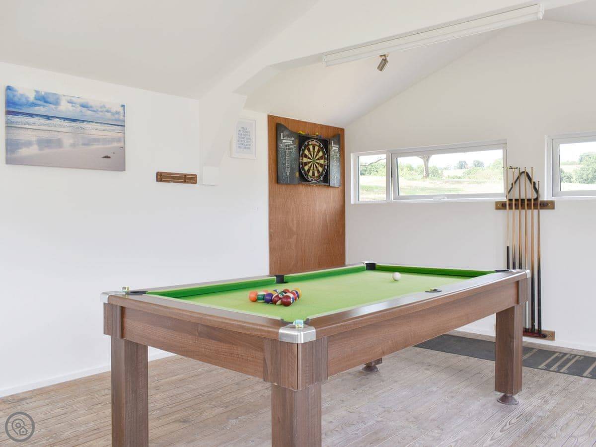 It's one of six converted fruit barns on the same grounds. You get your own private yard or garden, but you can also use the ten and a half acres of shared land. There's a decent heated swimming pool, a games room with a pool table and darts, and a kids' play area. It's a five star place, which means it's well-finished and you get things like a welcome pack when you arrive. It sleeps eight people in four bedrooms, and there are three bathrooms.