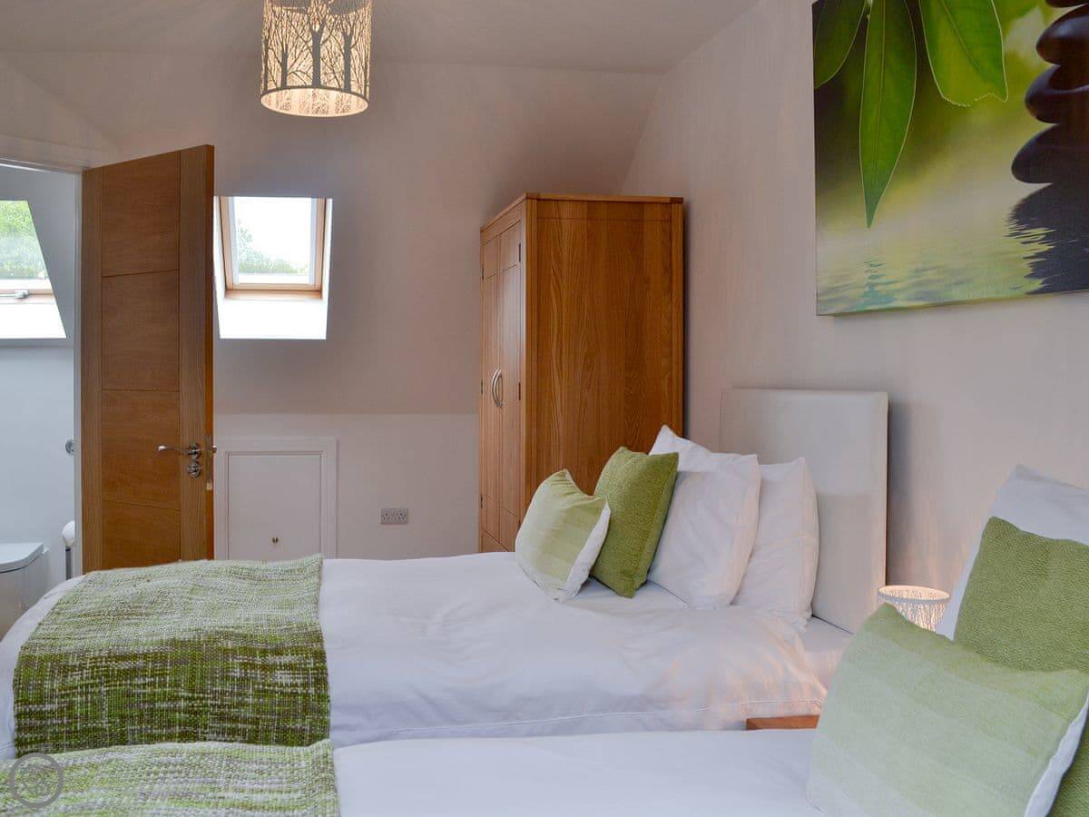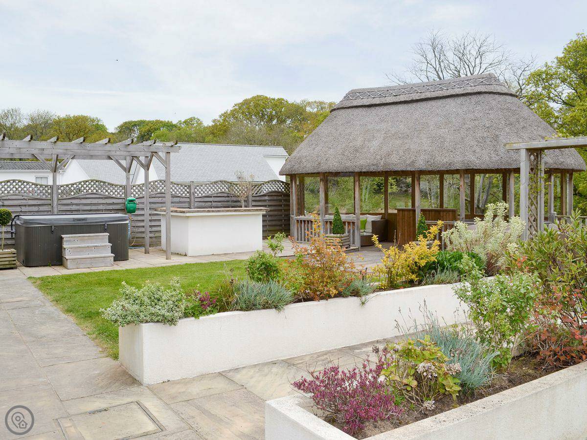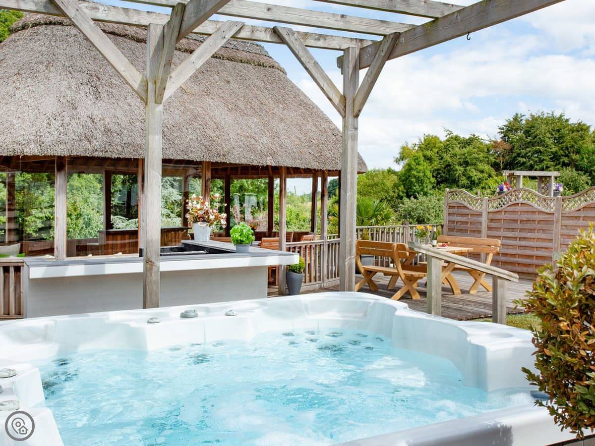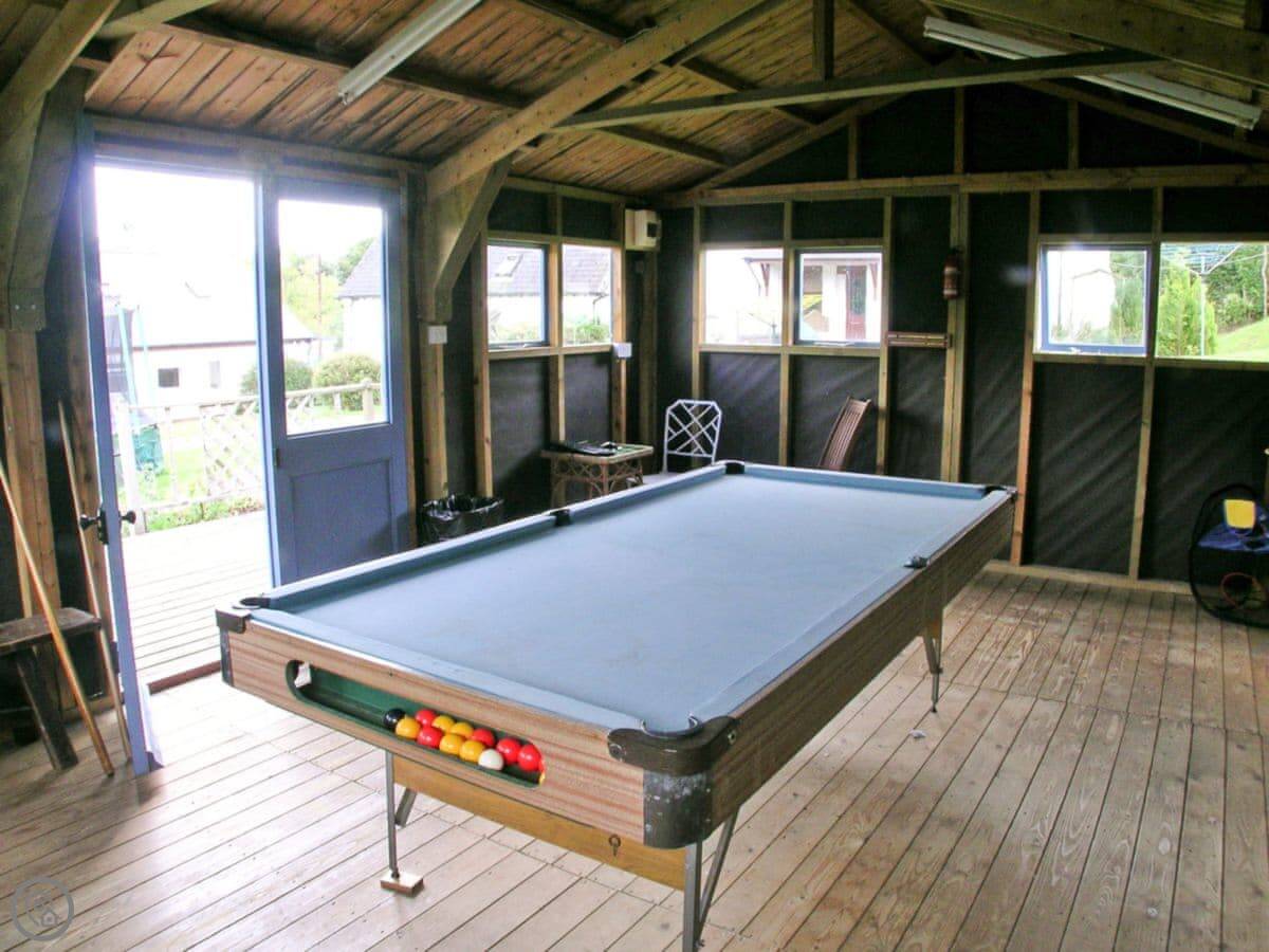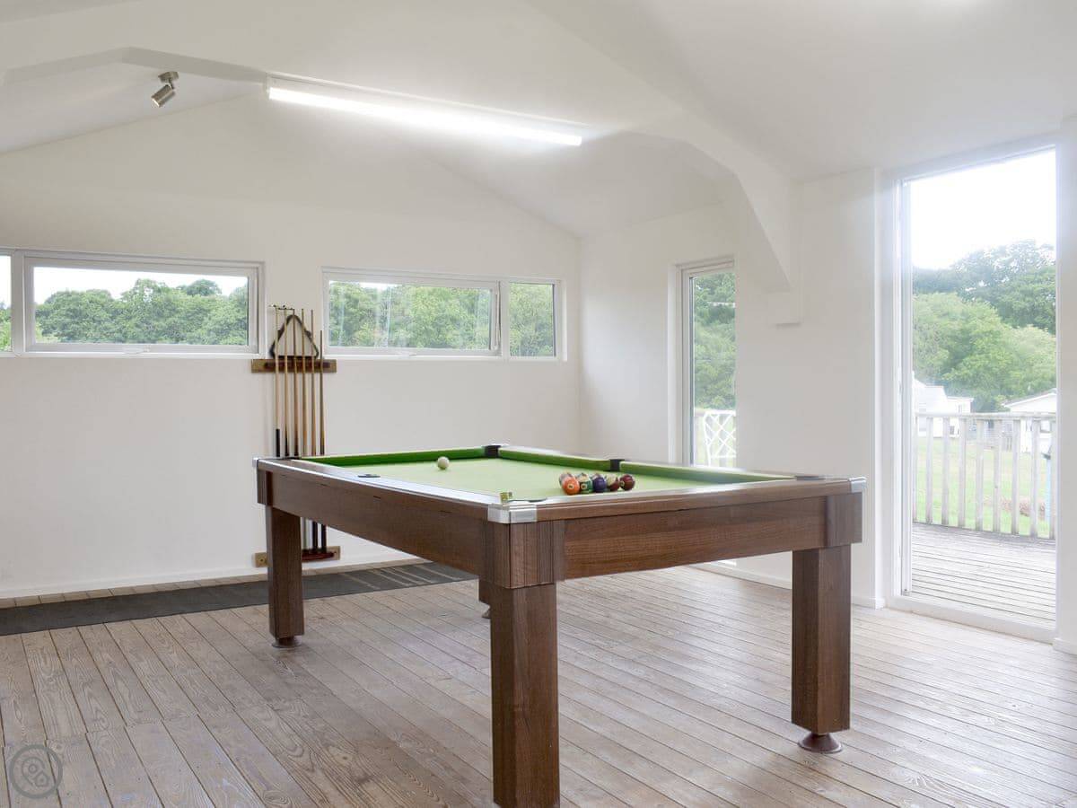 It's one of six converted fruit barns on the same grounds. You get your own private yard or garden, but you can also use the ten and a half acres of shared land. There's a decent heated swimming pool, a games room with a pool table and darts, and a kids' play area. It's a five star place, which means it's well-finished and you get things like a welcome pack when you arrive. It sleeps eight people in four bedrooms, and there are three bathrooms.