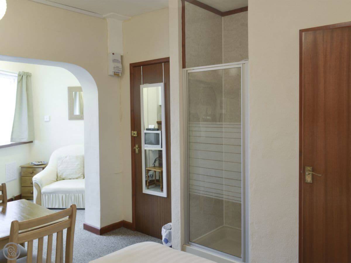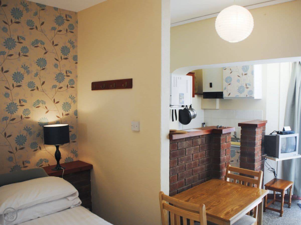 It's a ground floor apartment that sleeps two. One bedroom, one bathroom with a shower. It's got a 3 Star rating. The place is clean and functional. The bedroom and living space are open plan. The front door opens straight into the main room.