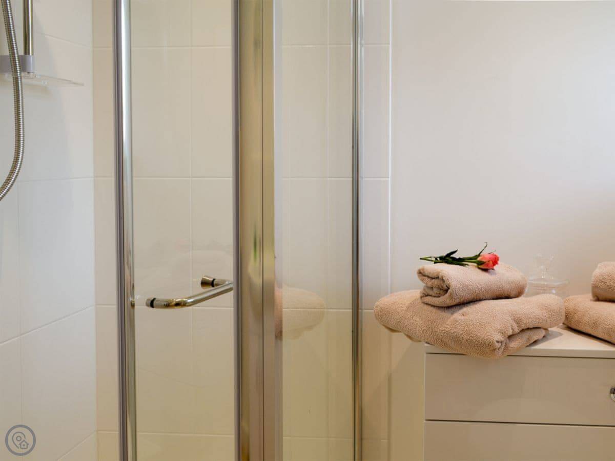 It sleeps four in two bedrooms. There's one bathroom with a shower. It's a 4 Star place, so it's comfortable and well-equipped. The listing mentions open, steep, and narrow stairs somewhere on site, but that's not inside the apartment itself. The apartment is all on one level.
