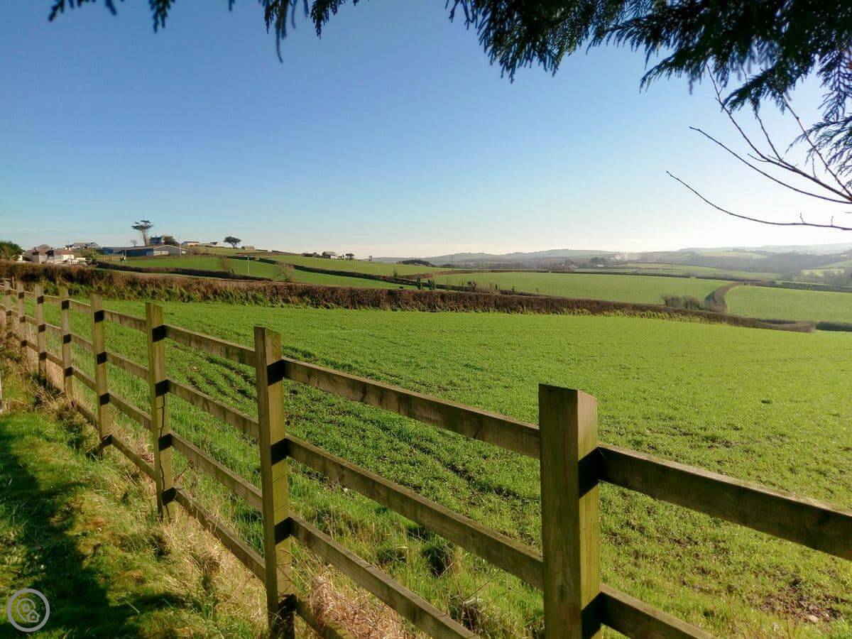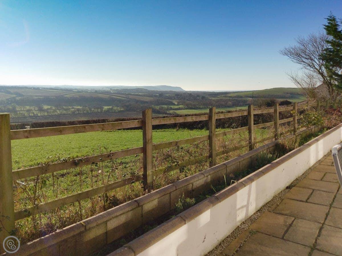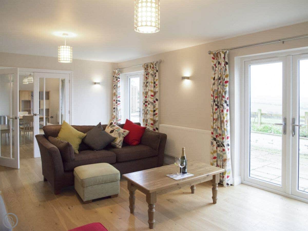It sleeps eight. Four bedrooms and two bathrooms. It's got a 5 Star rating, which means it's well-equipped and kept to a high standard. The living room has a wood burner and big doors that open onto the patio. The view from there is over fields and you can see a bit of the sea in the distance.